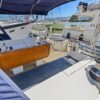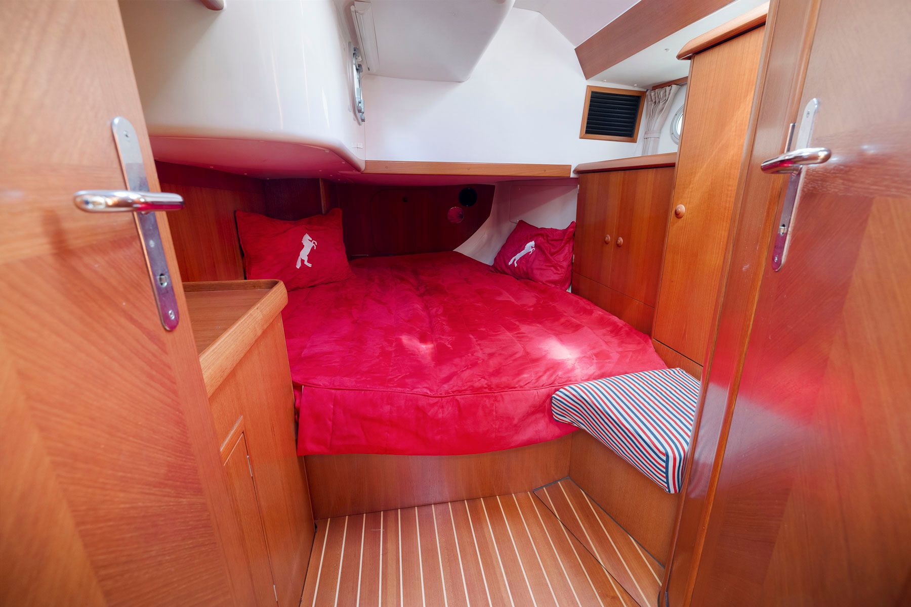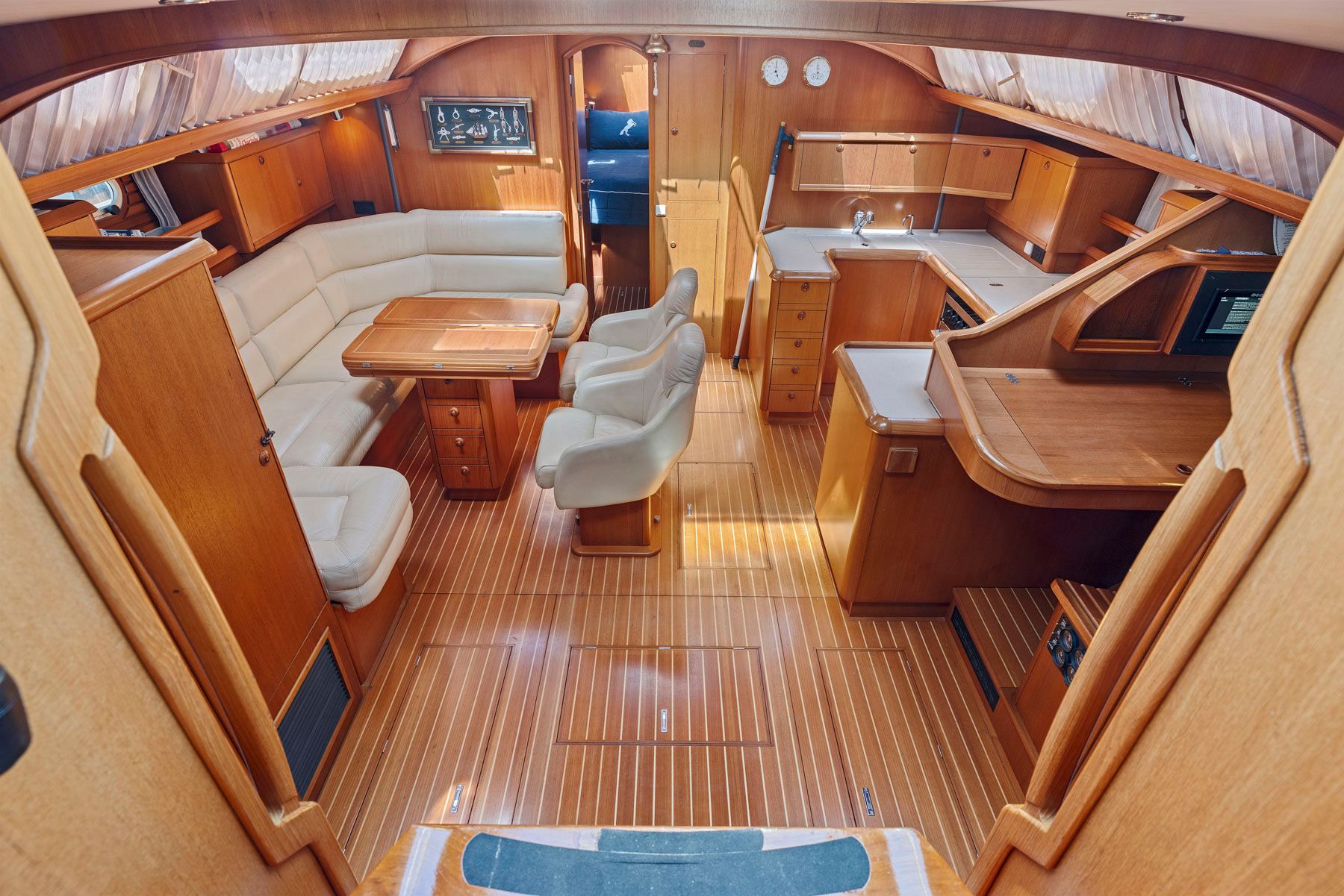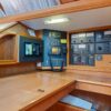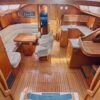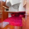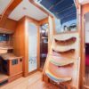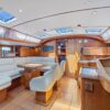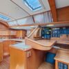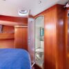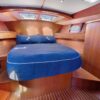 The guest cabins, located aft, have 62″ wide double berths, storage lockers, hanging lockers and a head with shower and electric toilets.