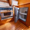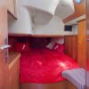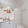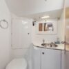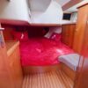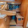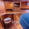 The master stateroom is all the way forward with a centerline queen berth. It has a vanity/computer desk, hanging locker, storage cabinets and book shelves along the side of the berth. The head has a shower stall and an electric toilet.
