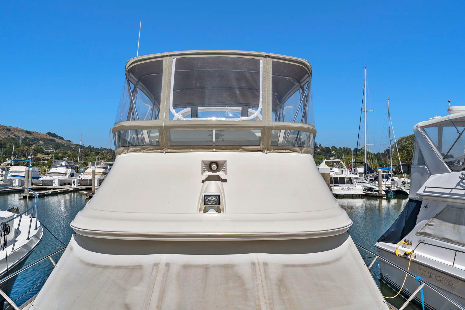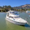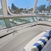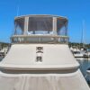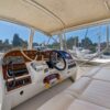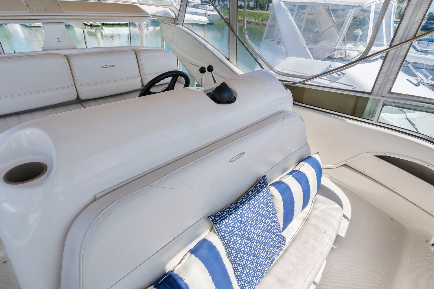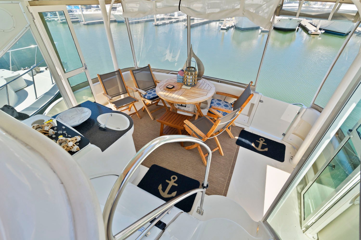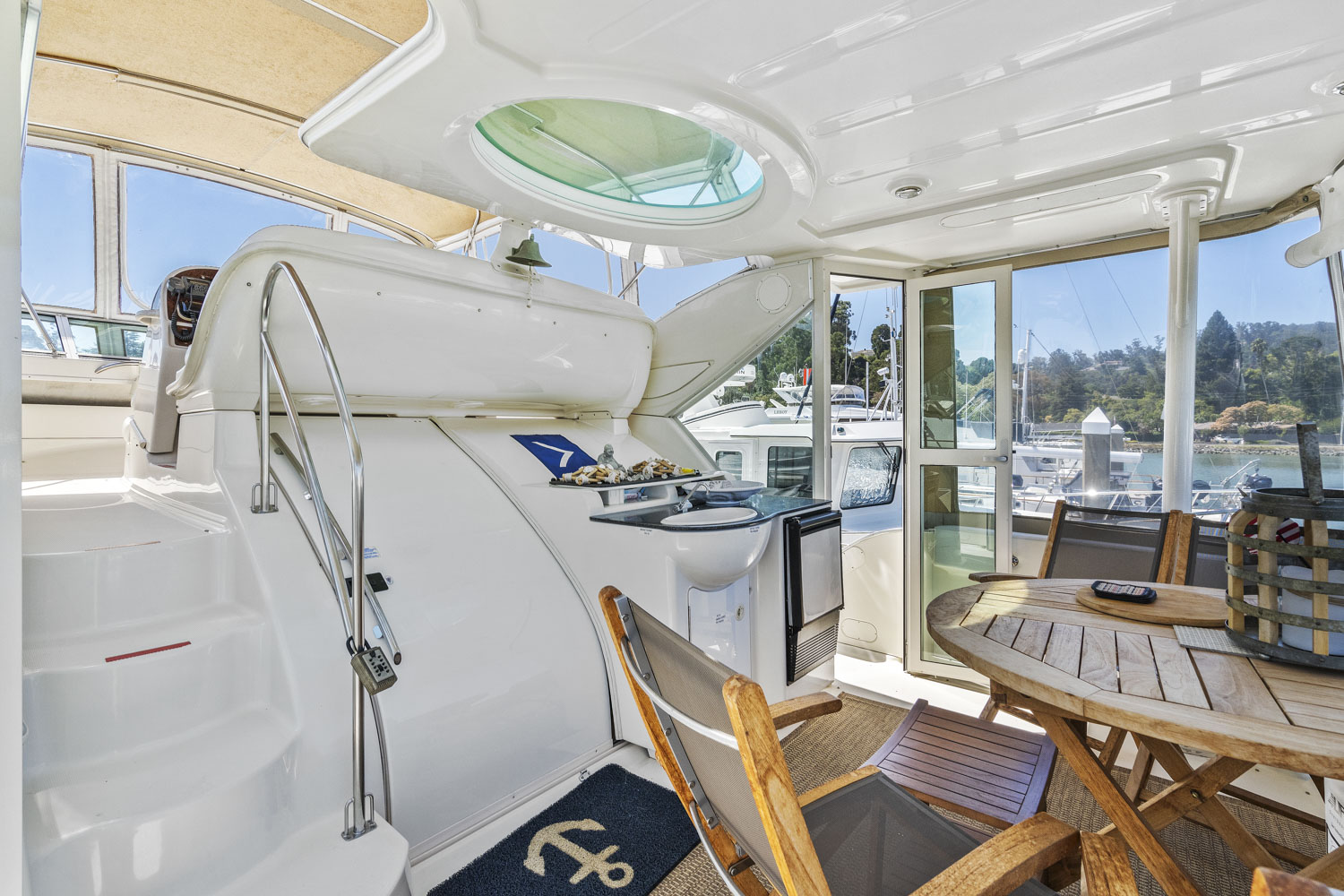 Access to the boat is aft from the swim step, with 4 molded steps up into the spacious aft deck. The aft deck is enclosed which will keep you warm during the winter months. You can remove or open the isinglass during the summer and falls months for plenty of ventilation. There are solid glass locking doors from the port and starboard side in which you can access the side decks and walk to the bow.