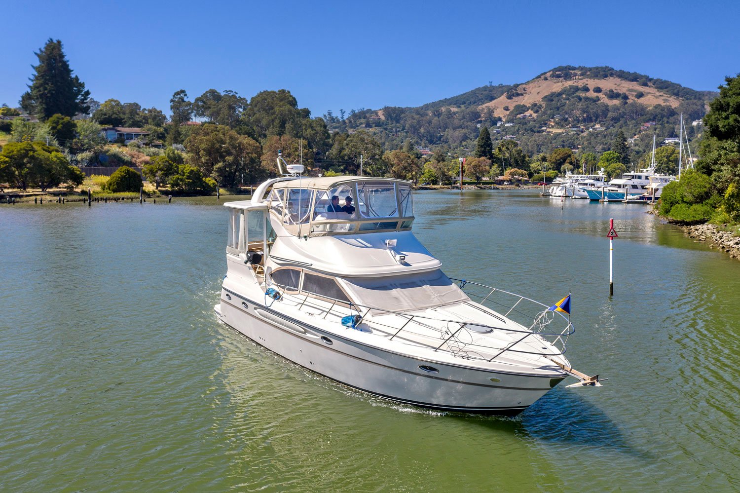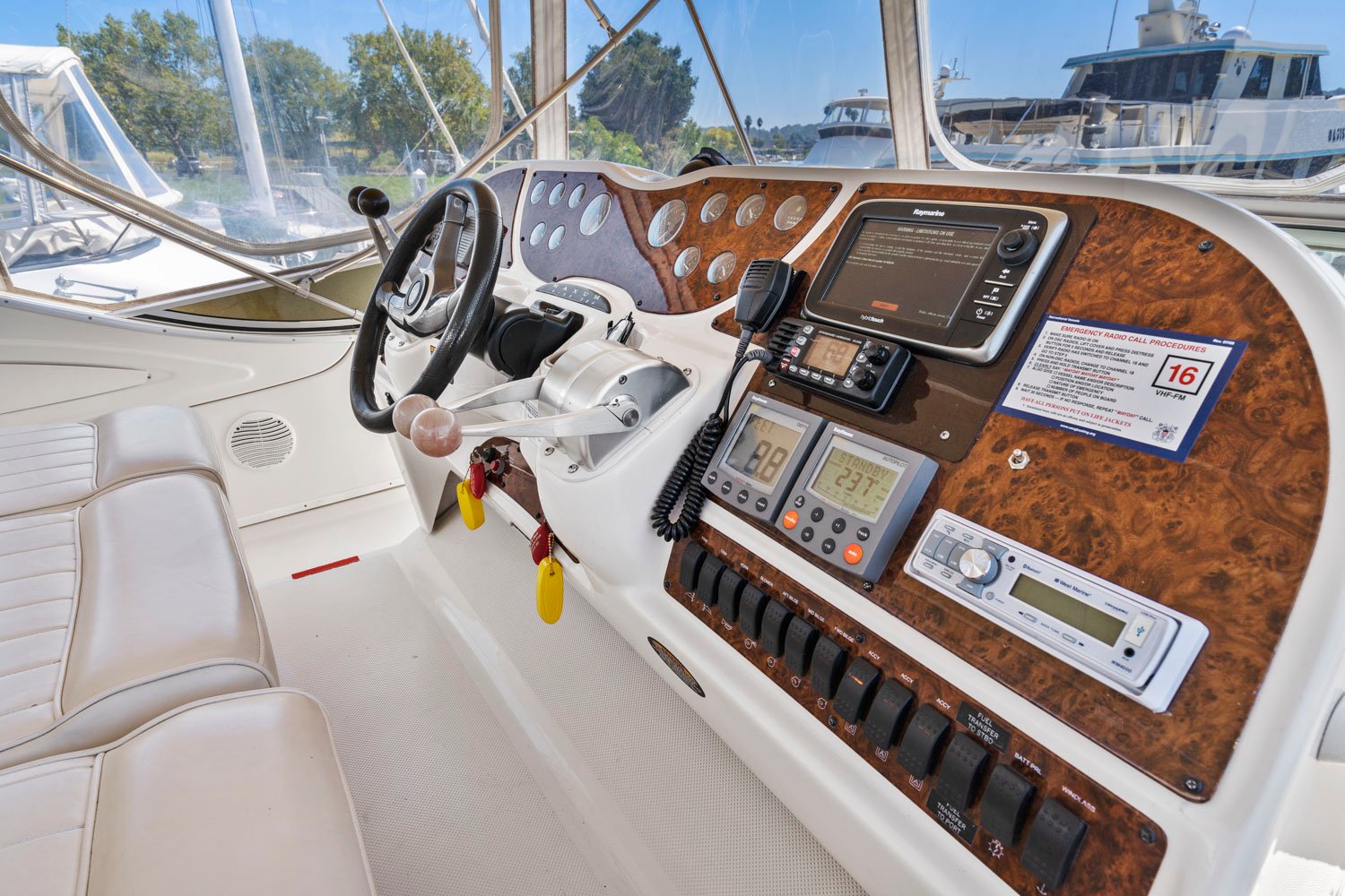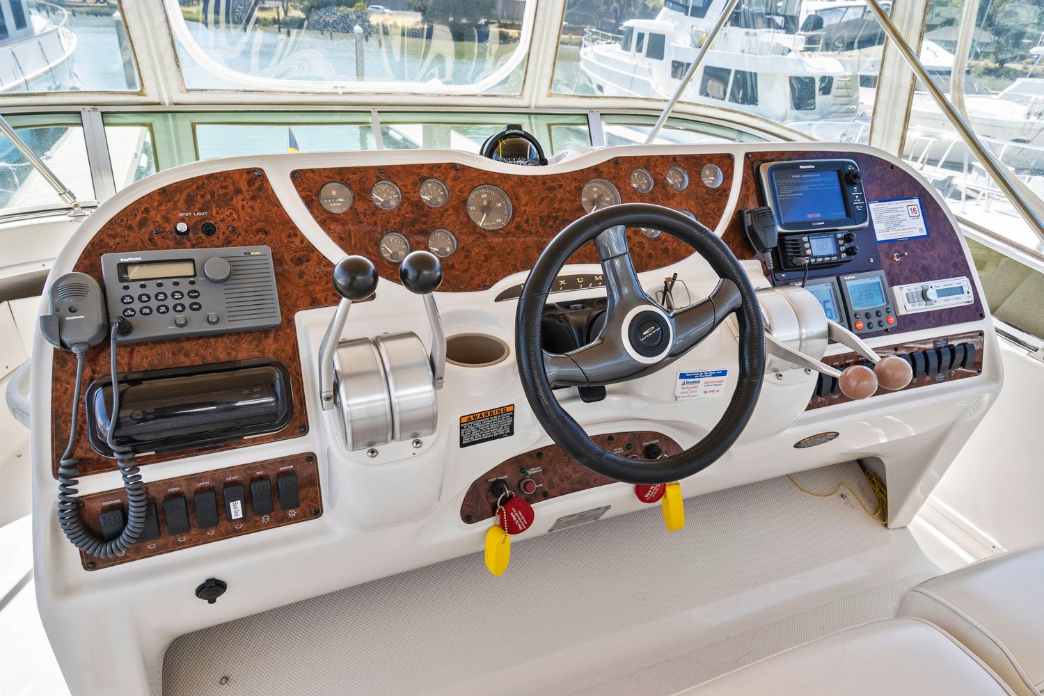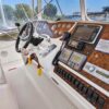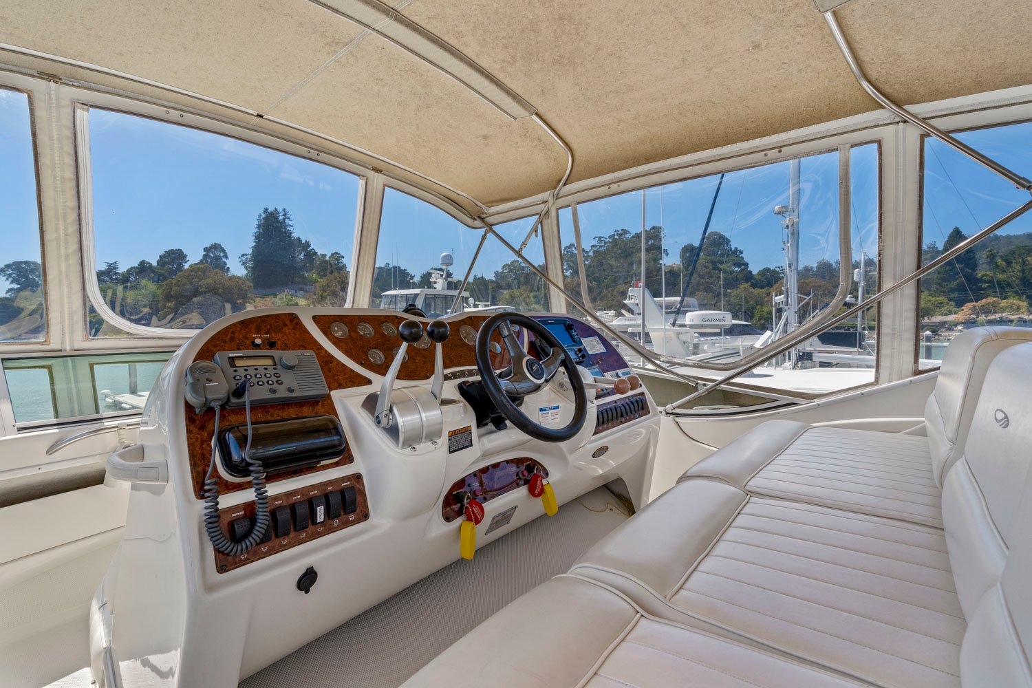 Access to the boat is aft from the swim step, with 4 molded steps up into the spacious aft deck. The aft deck is enclosed which will keep you warm during the winter months. You can remove or open the isinglass during the summer and falls months for plenty of ventilation. There are solid glass locking doors from the port and starboard side in which you can access the side decks and walk to the bow.