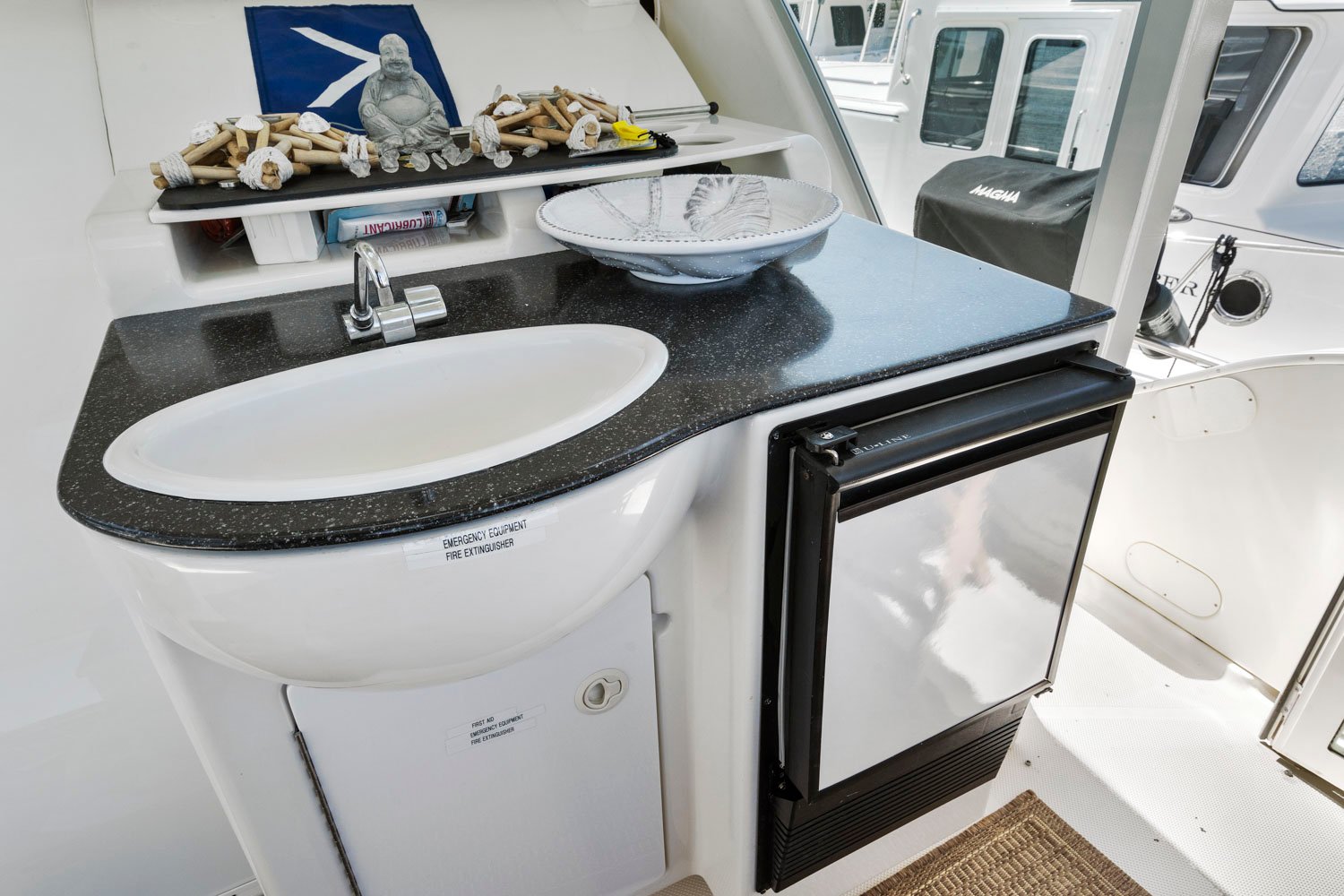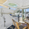 In the solarium like aft deck there is plenty of room for a table and chairs. Built in is a wetbar and ice maker. From the aft deck you can walk up into the flybridge or through the locking sliding door into the mail salon.