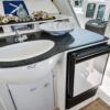 The main salon is equipped L-Shaped settee that pulls out into a queen sized berth, an entertainment center and a step down galley with an upright fridge and spacious table with bench seating on both sides.