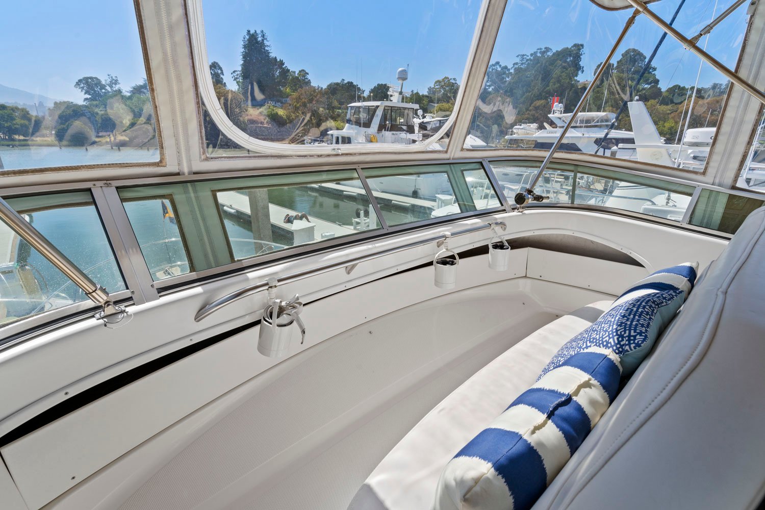 The flybridge is fully enclosed with canvas and isenglass. There are two long benches which allows plenty of room for guests to enjoy the view with you.