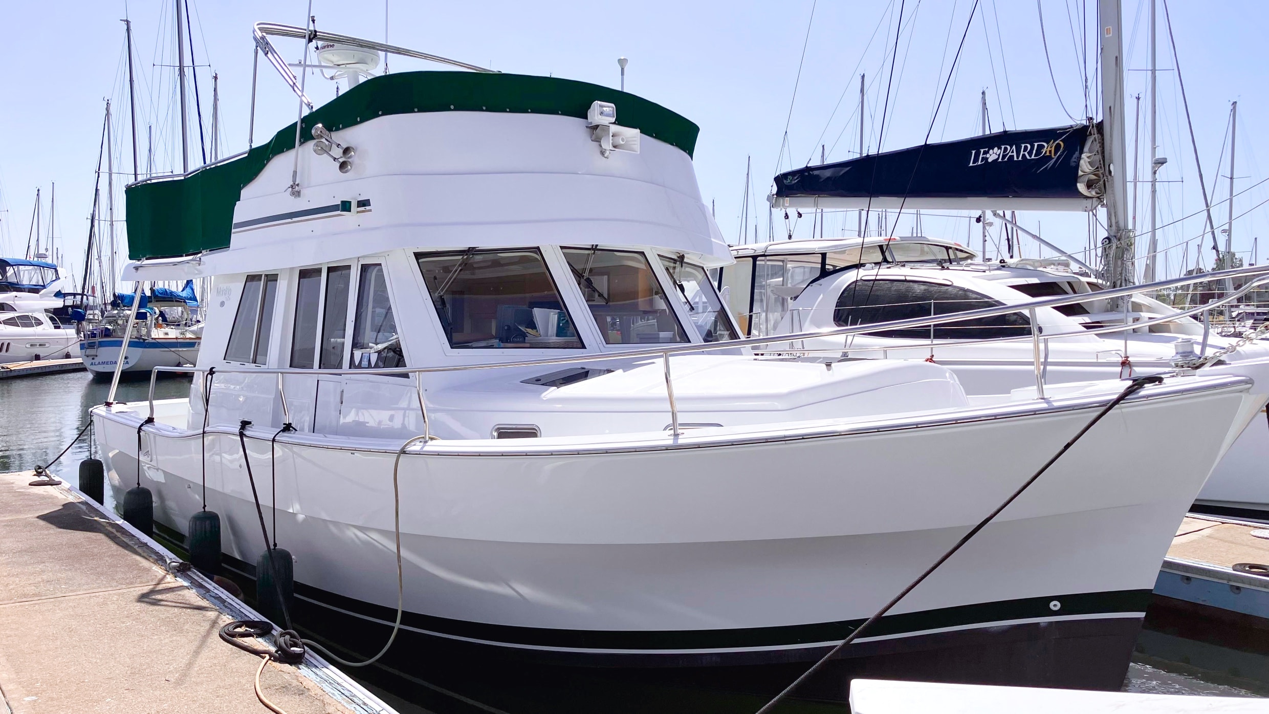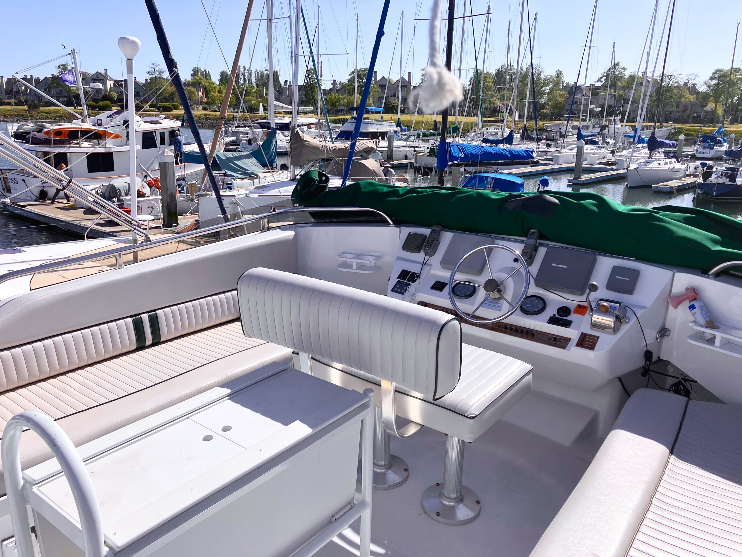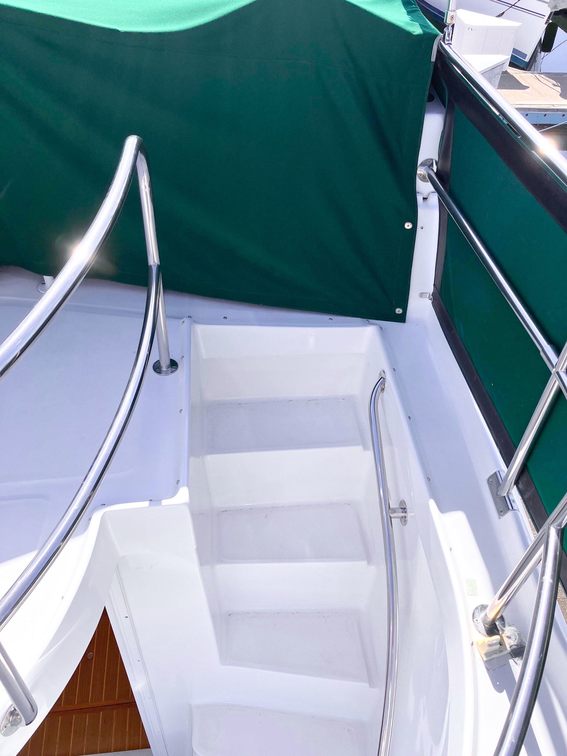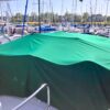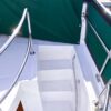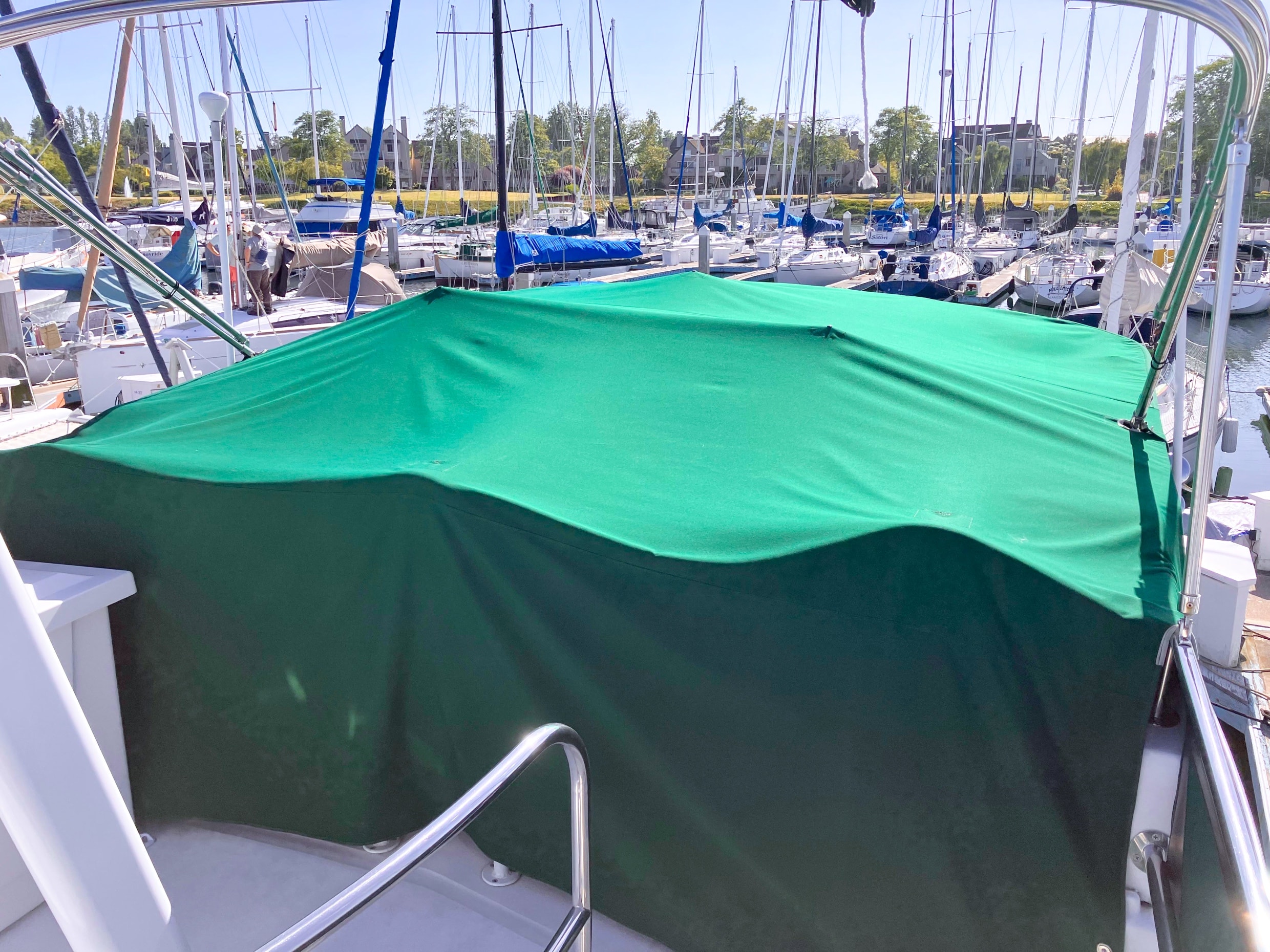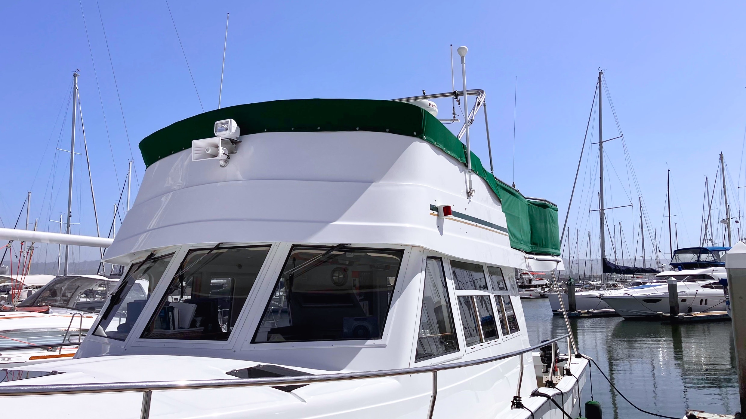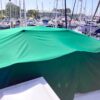- Green Sunbrella and Eisenglass flybridge enclosure with dodger and aft rail canvas paneling