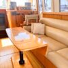 - Flybridge helm with captain’s chair, port and starboard bench seating, and a centerline folding table