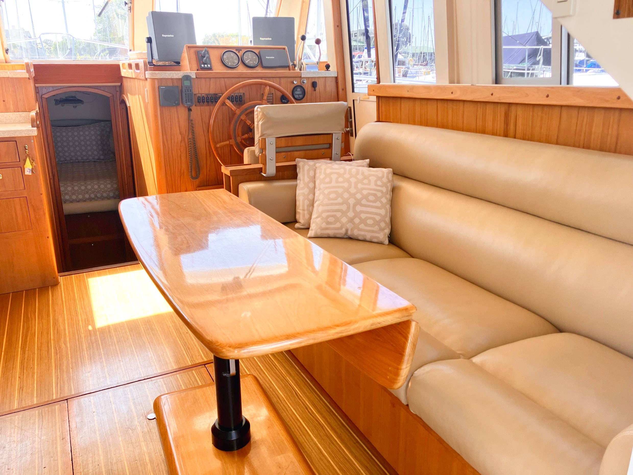 - The salon features a durable and attractive teak and holly sole