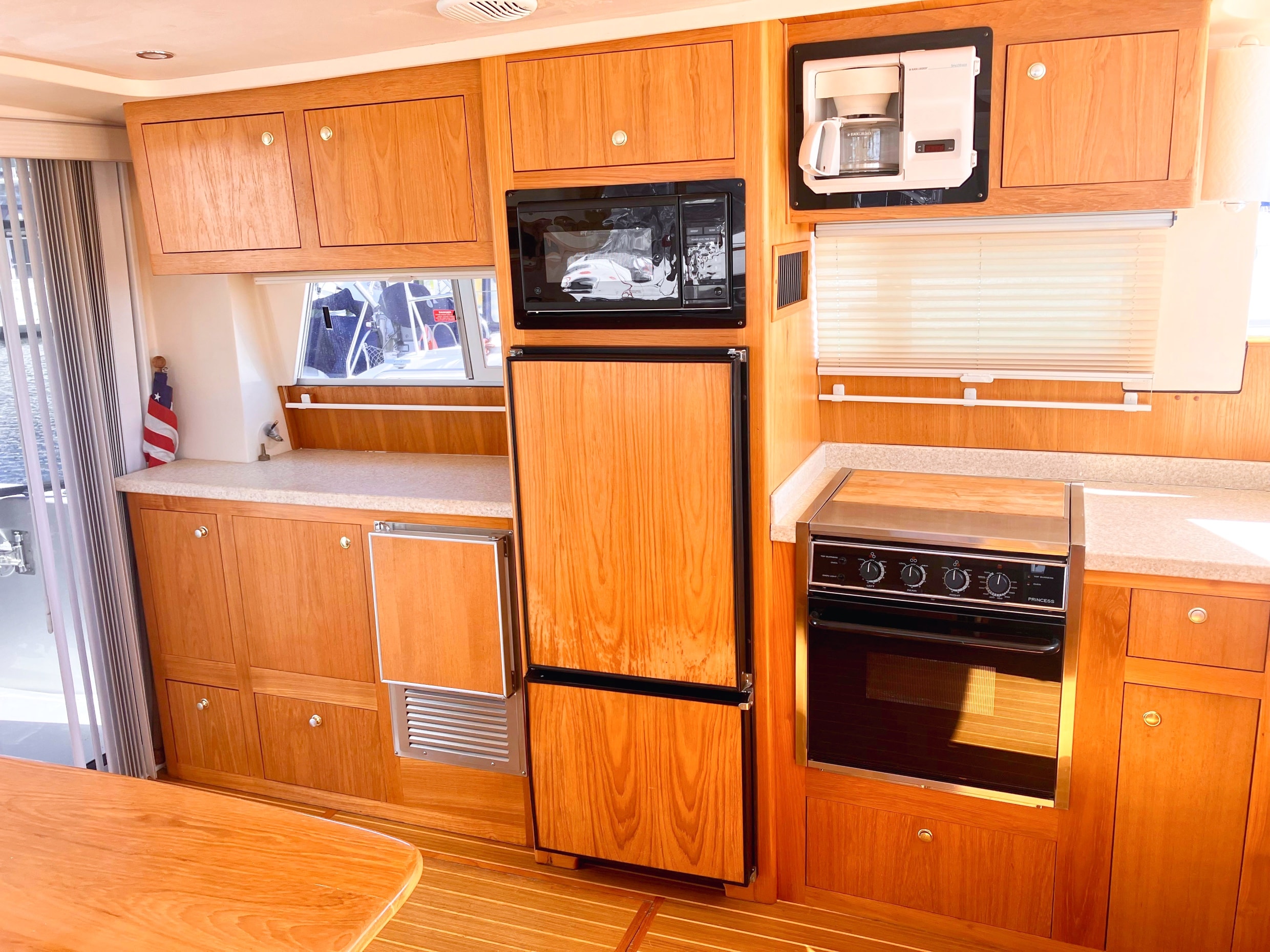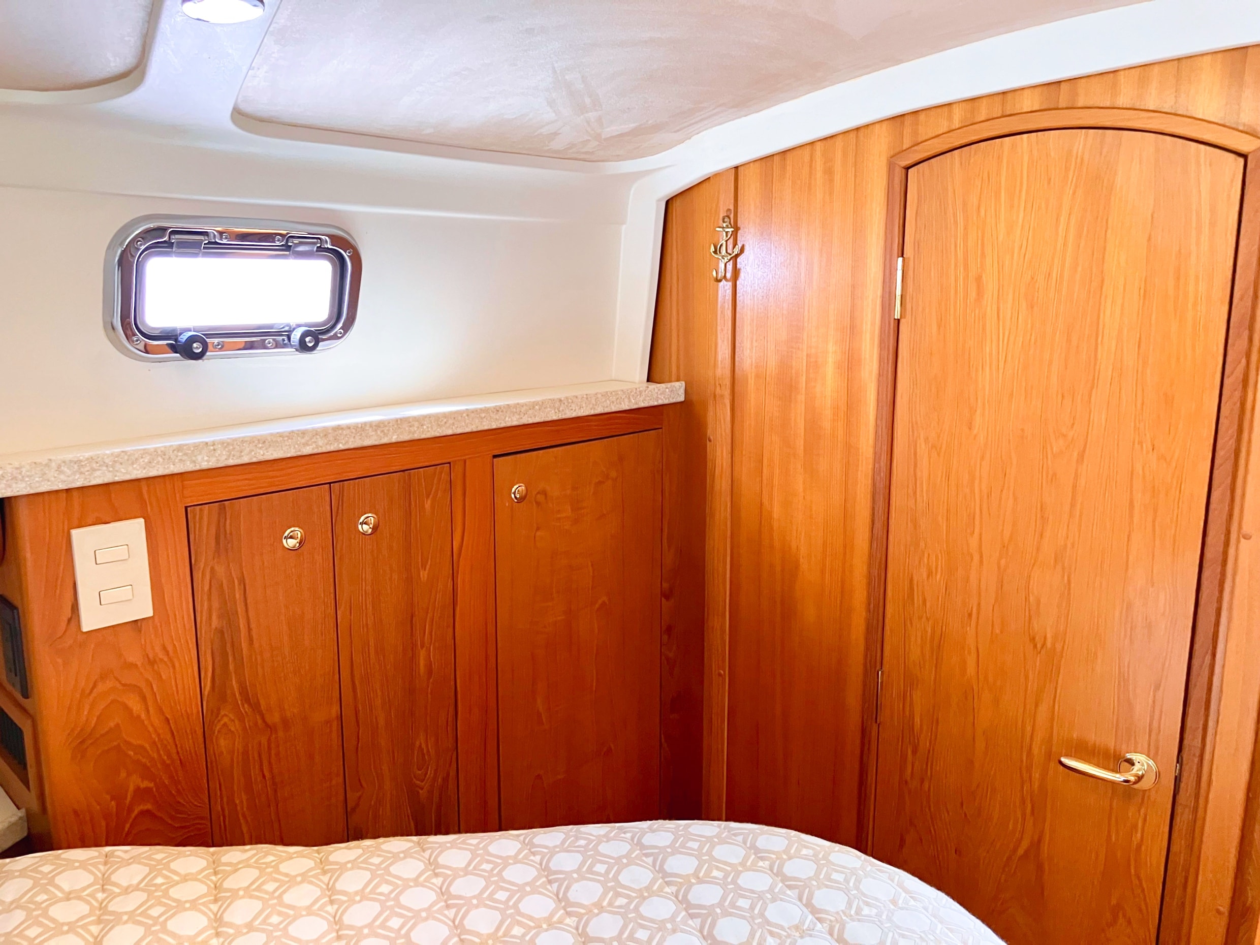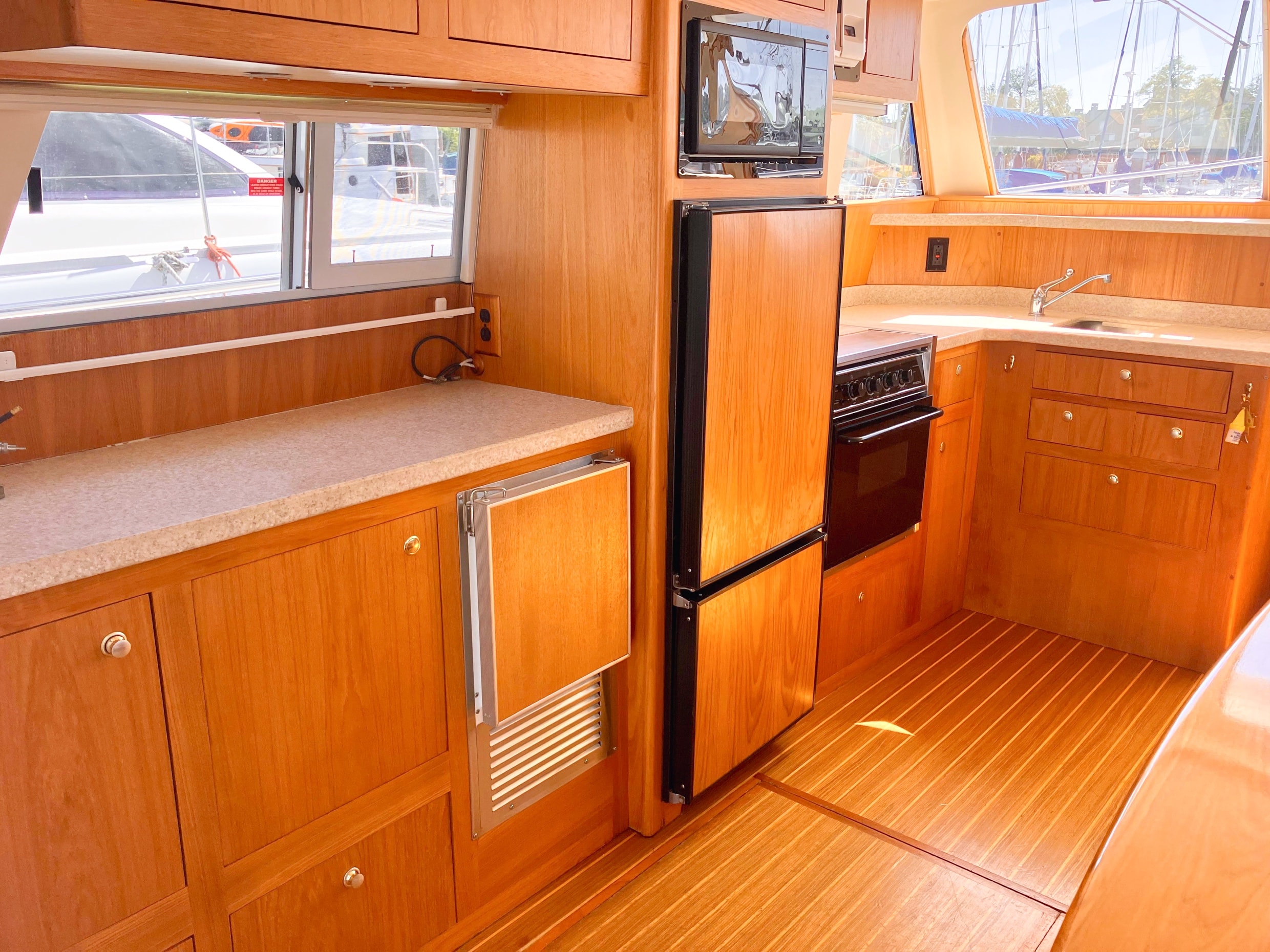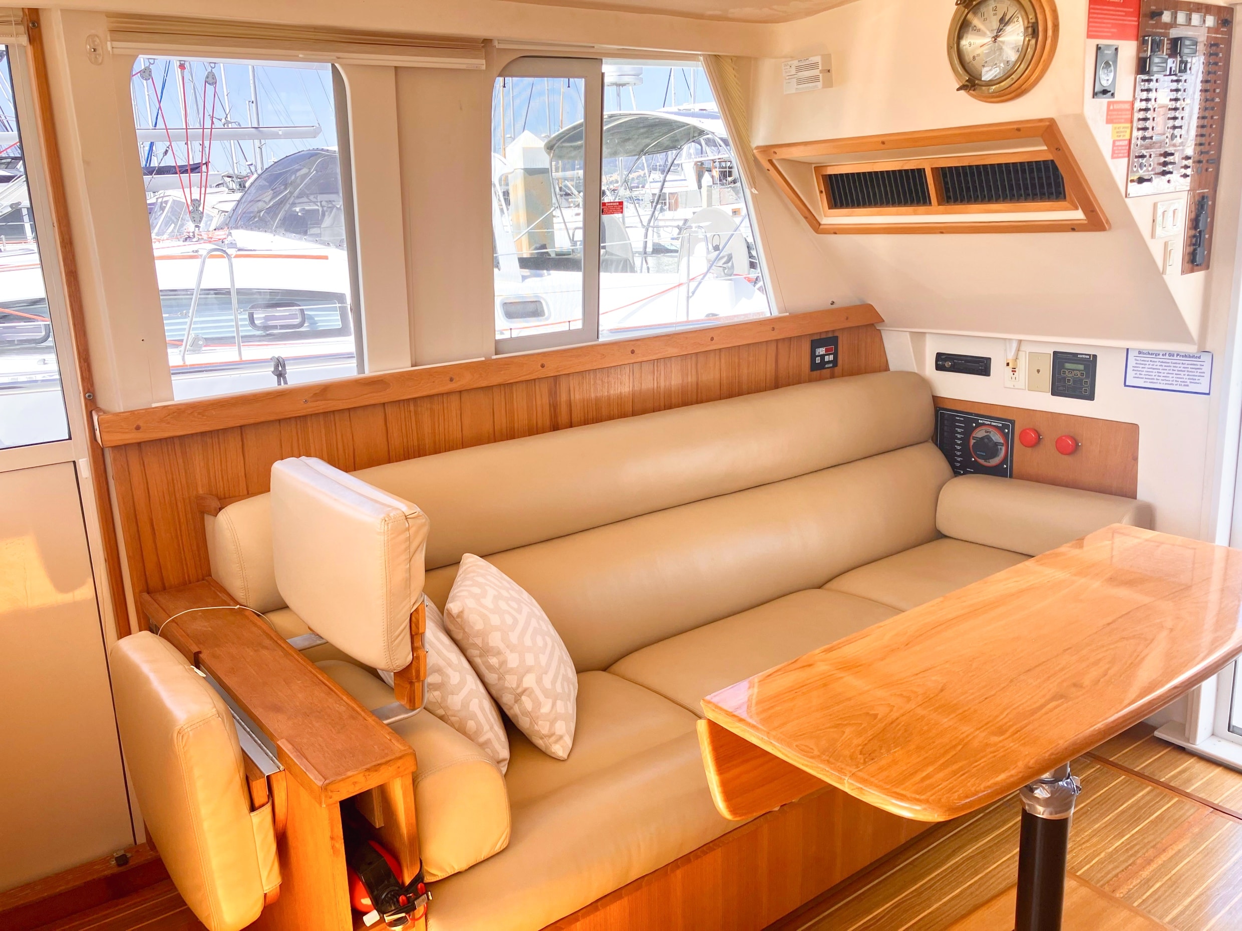 - Natural light and ventilation are abundant, thanks to a sliding entry door, three opening hatches, and four stainless steel portlights