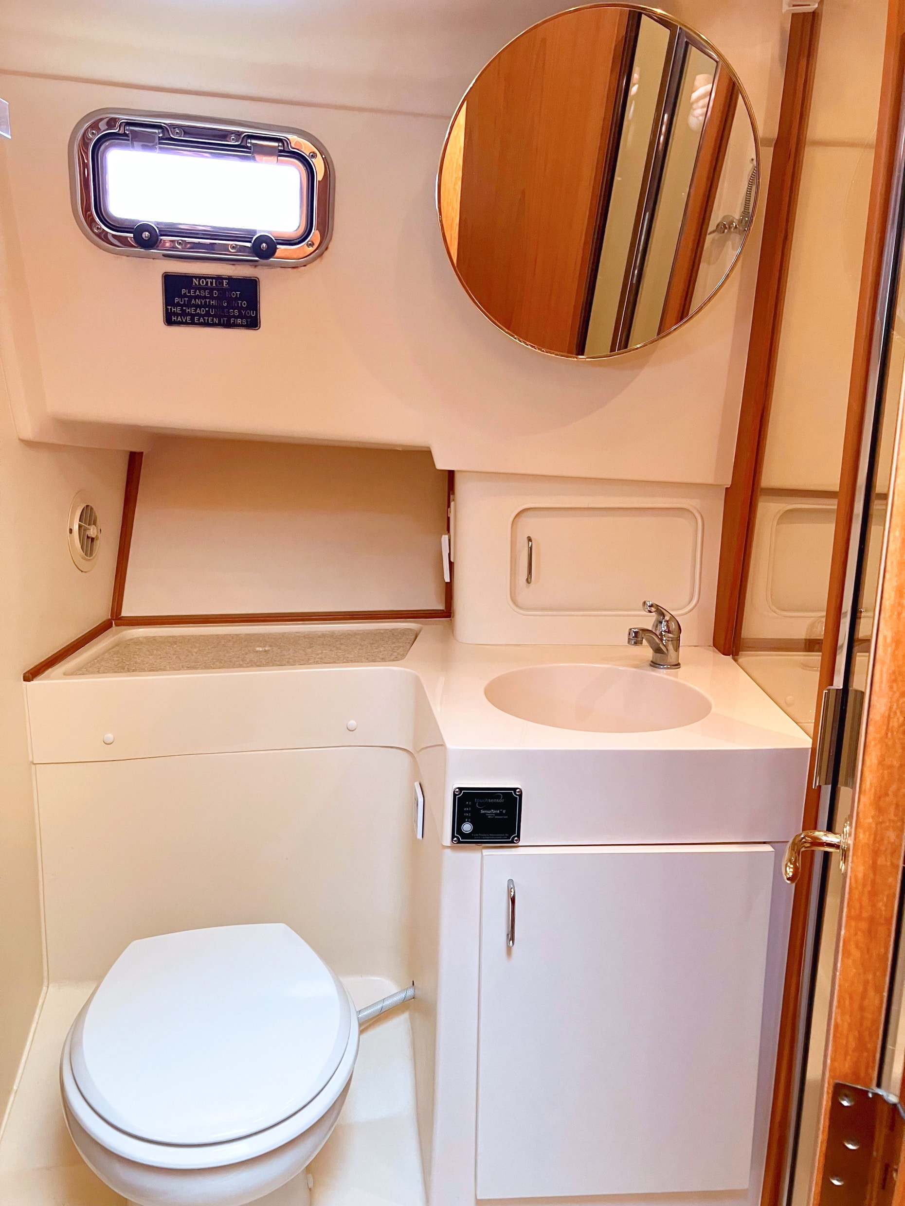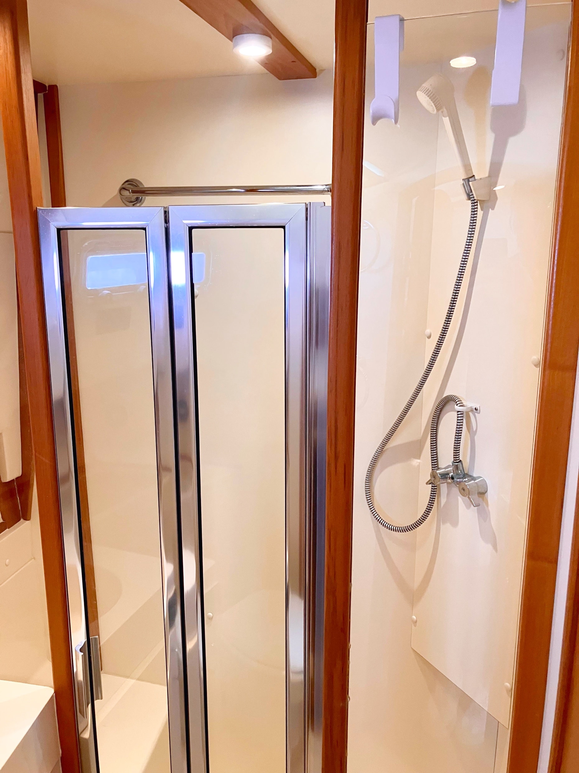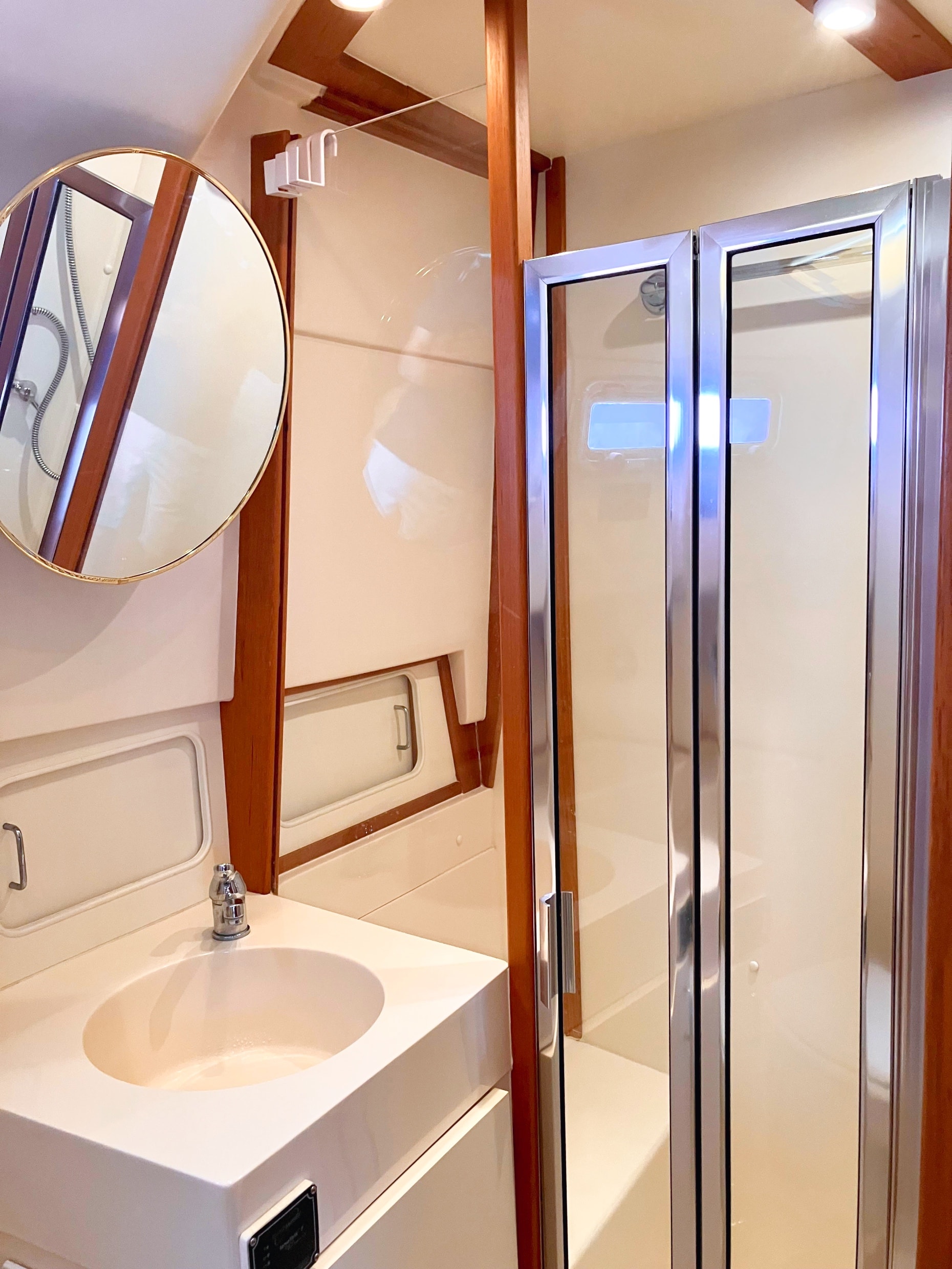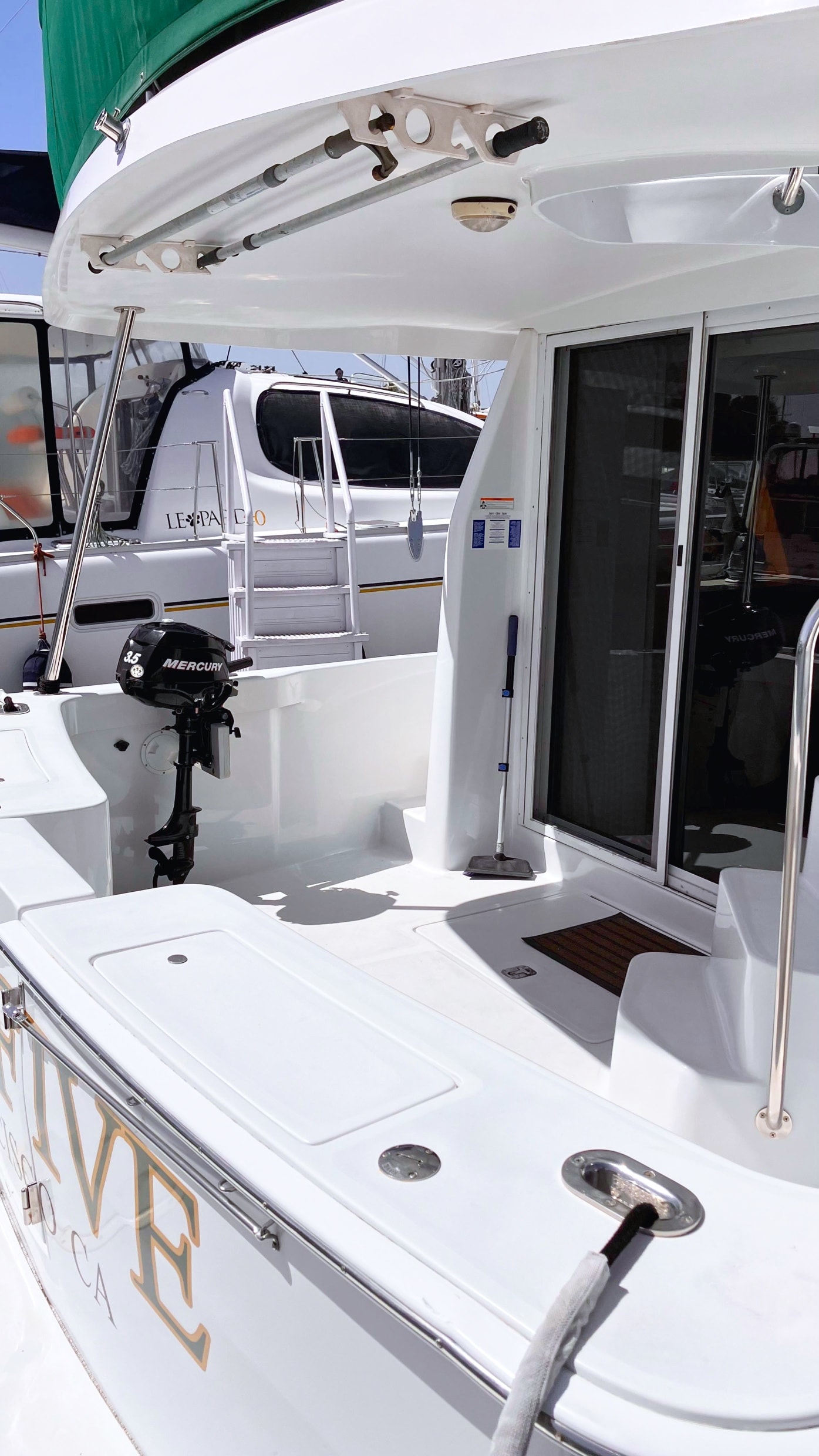 - Natural light and ventilation are abundant, thanks to a sliding entry door, three opening hatches, and four stainless steel portlights