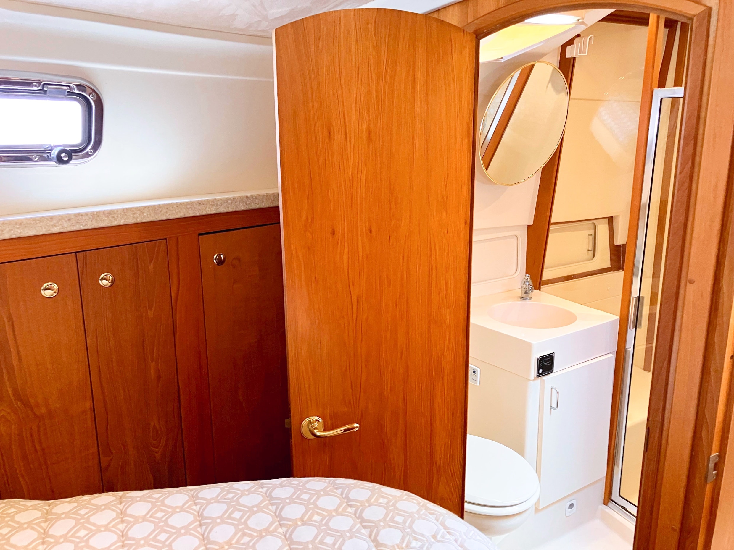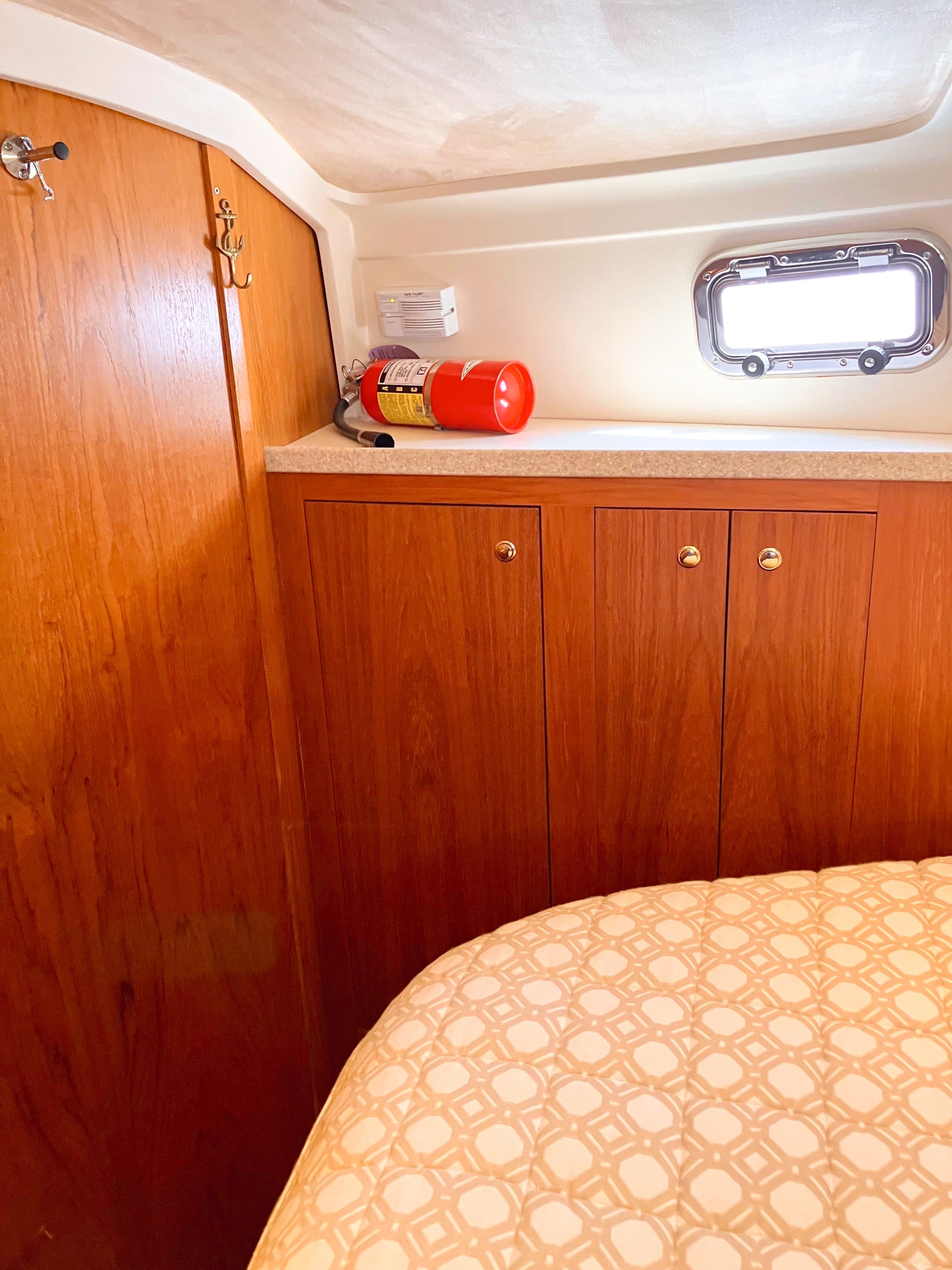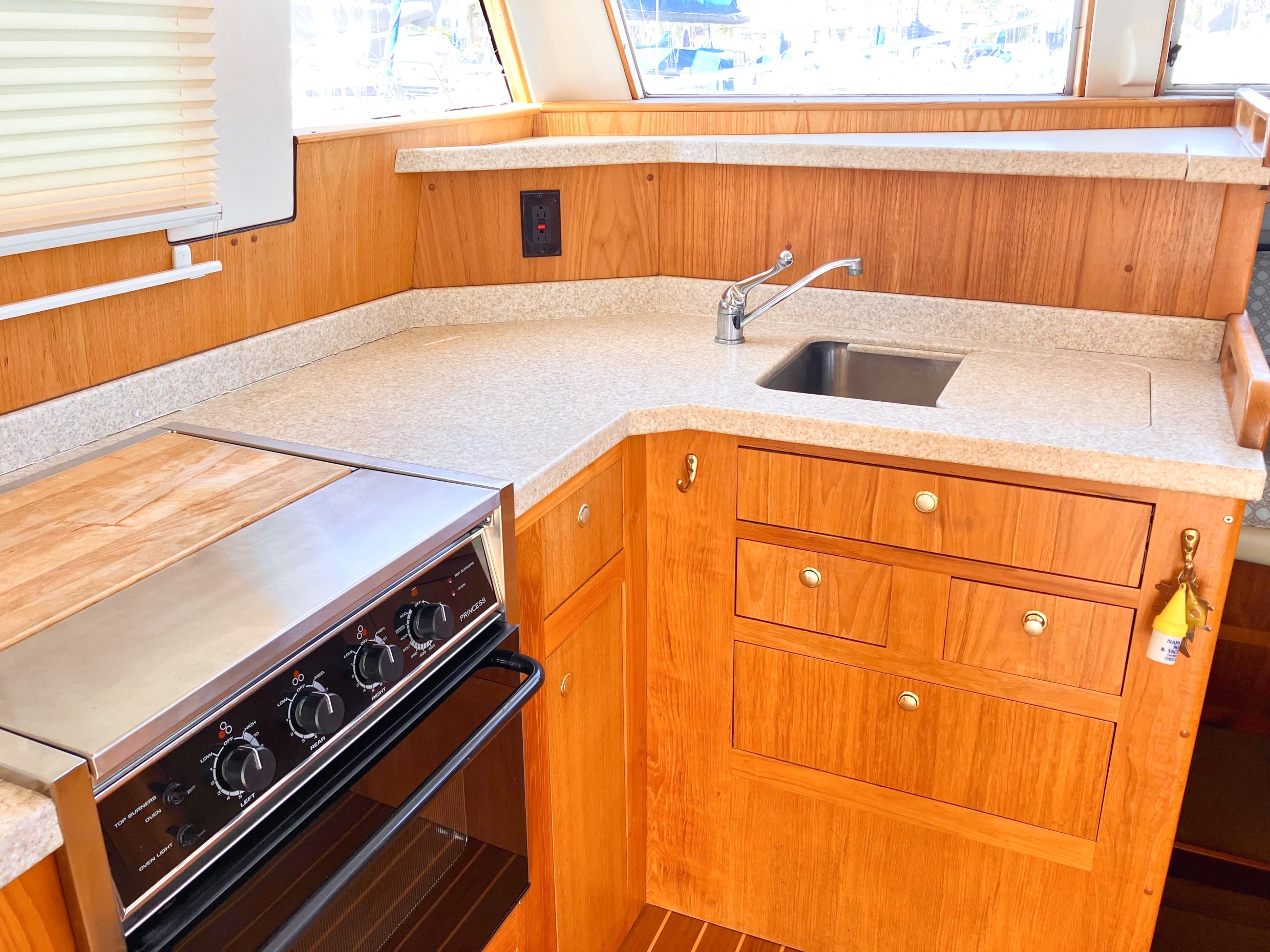 - Ample cabinetry and storage areas provide convenience for extended cruising.