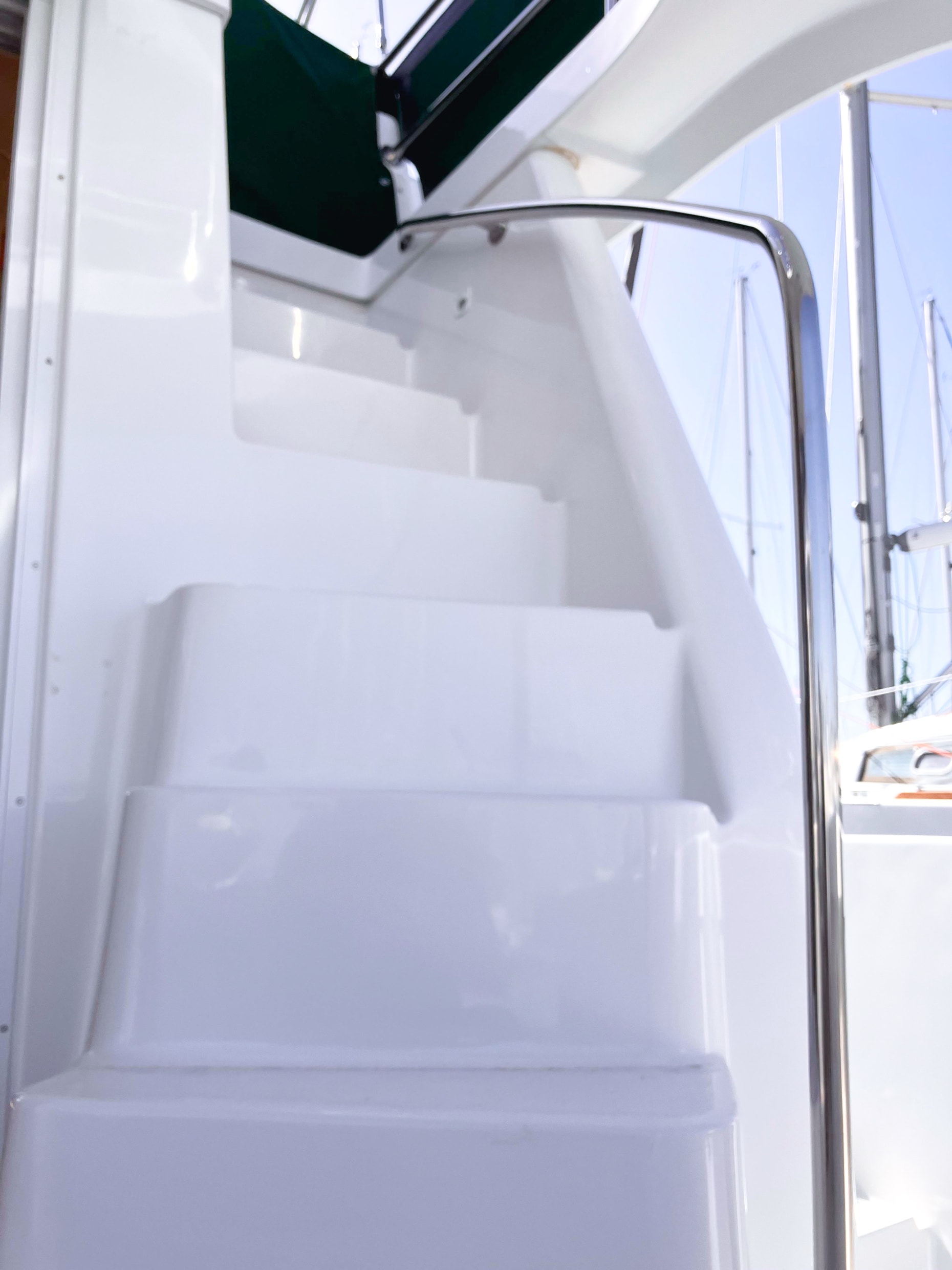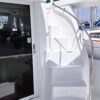 - Flybridge accessed via curved fiberglass staircase from the aft deck