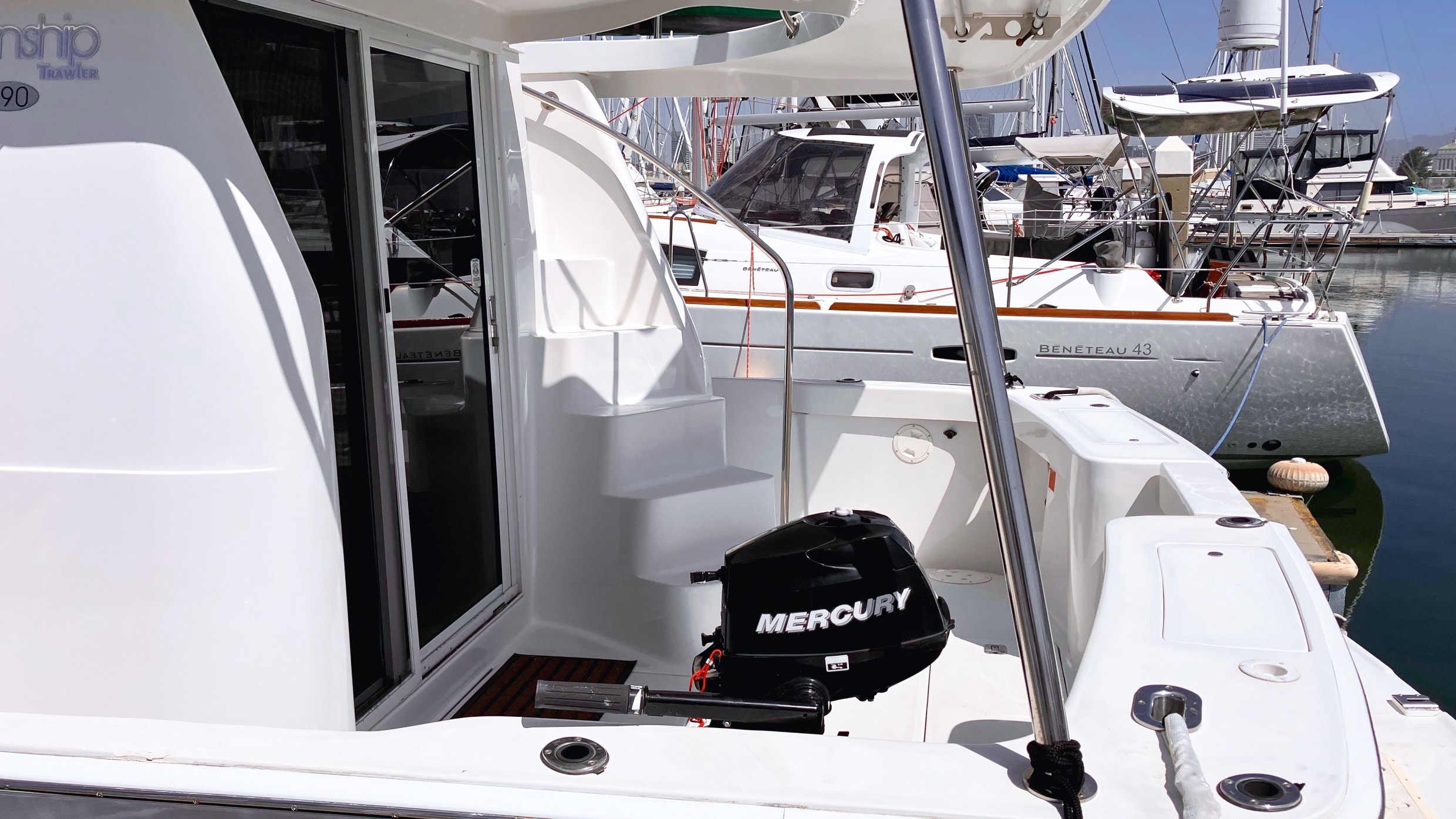 - Enclosed stern cockpit and wide boarding transom for easy access