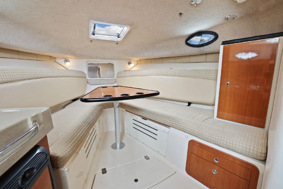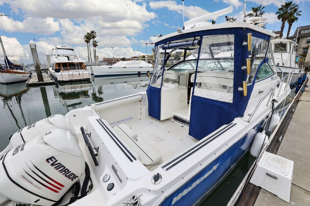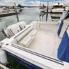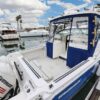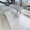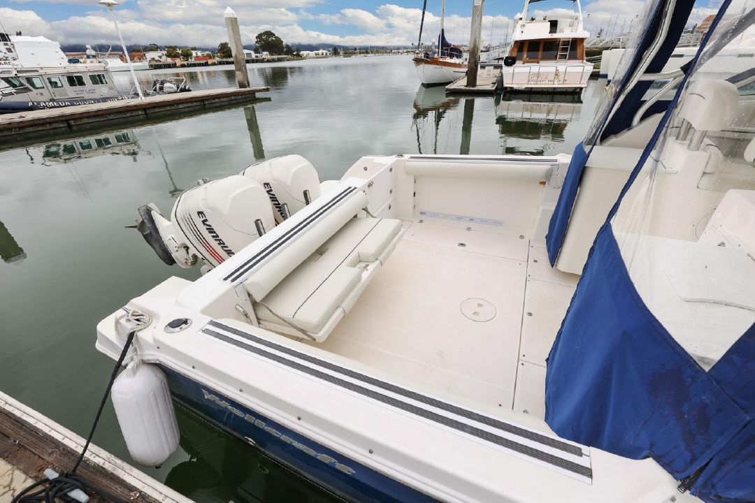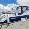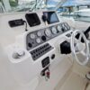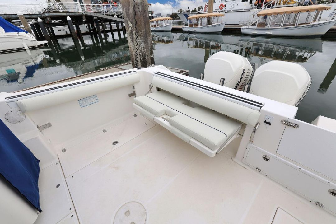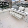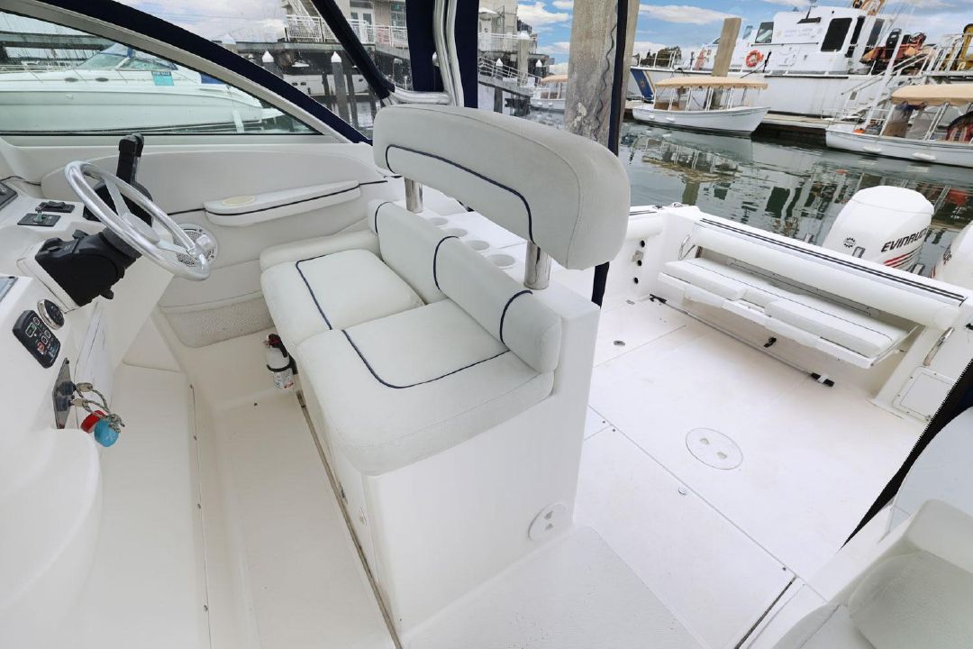 In the cockpit, a standup 42-gallon live well is aft of the helm seat and a pair of insulated fish boxes are located just forward of the transom. Additional features include a fiberglass hardtop with rod holders, transom door, folding transom seat, bait prep center with sink, fresh/raw-water washdowns, cockpit bolsters, trim tabs, dive ladder, cockpit rod storage, molded bow pulpit, and a walk-thru windshield.