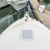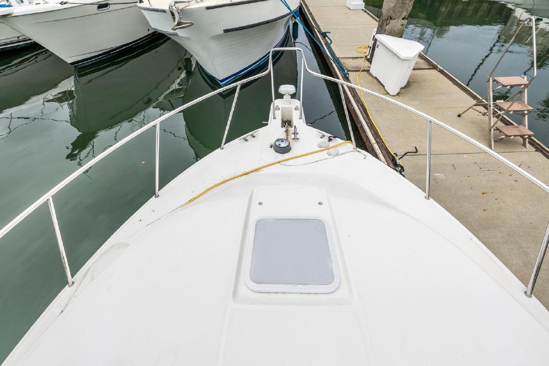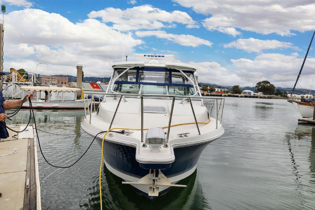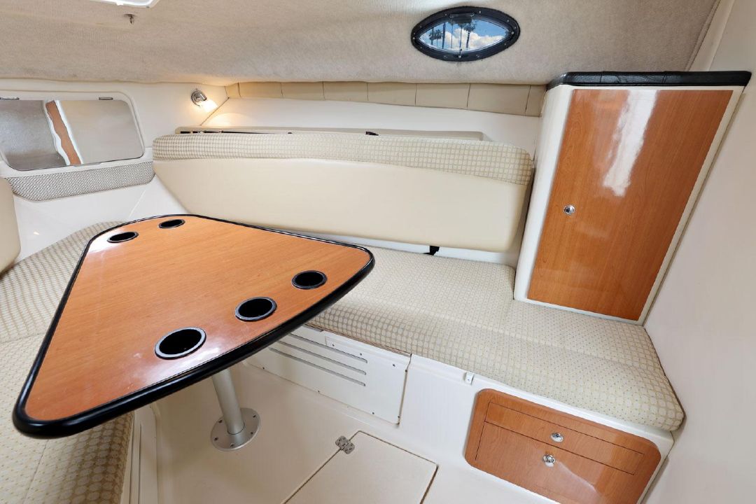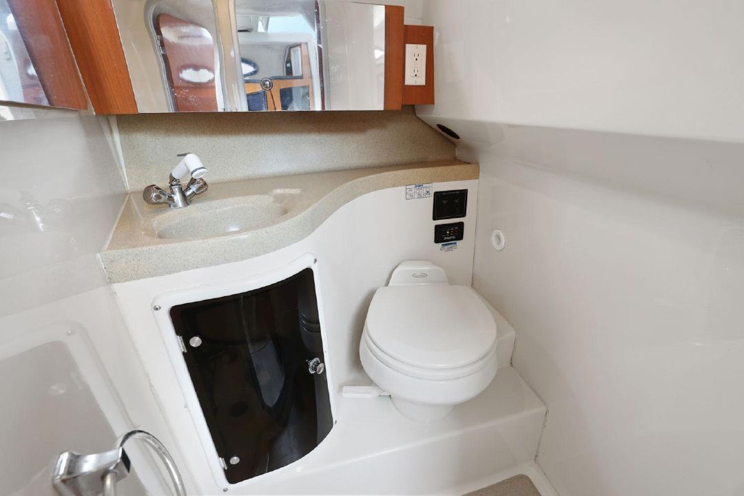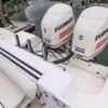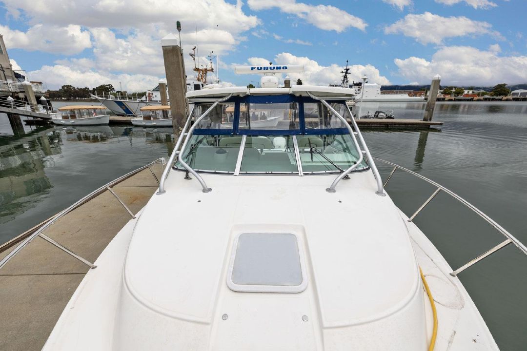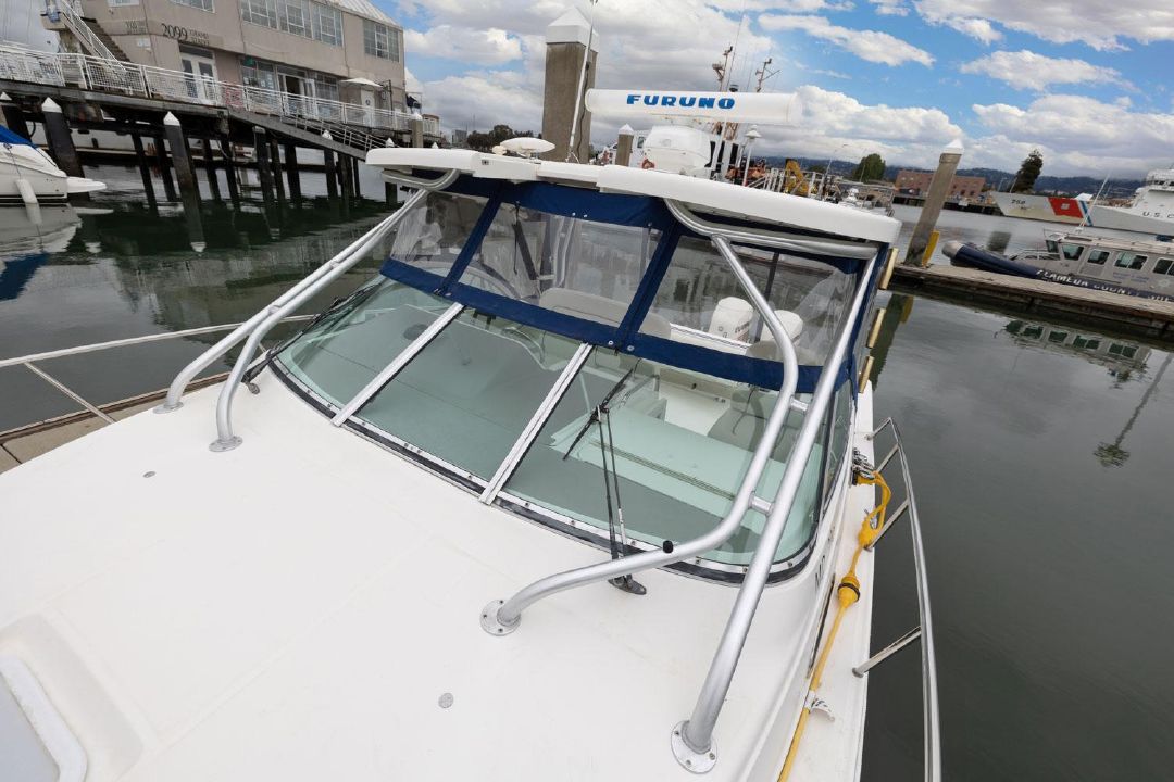 In the cockpit, a standup 42-gallon live well is aft of the helm seat and a pair of insulated fish boxes are located just forward of the transom. Additional features include a fiberglass hardtop with rod holders, transom door, folding transom seat, bait prep center with sink, fresh/raw-water washdowns, cockpit bolsters, trim tabs, dive ladder, cockpit rod storage, molded bow pulpit, and a walk-thru windshield.