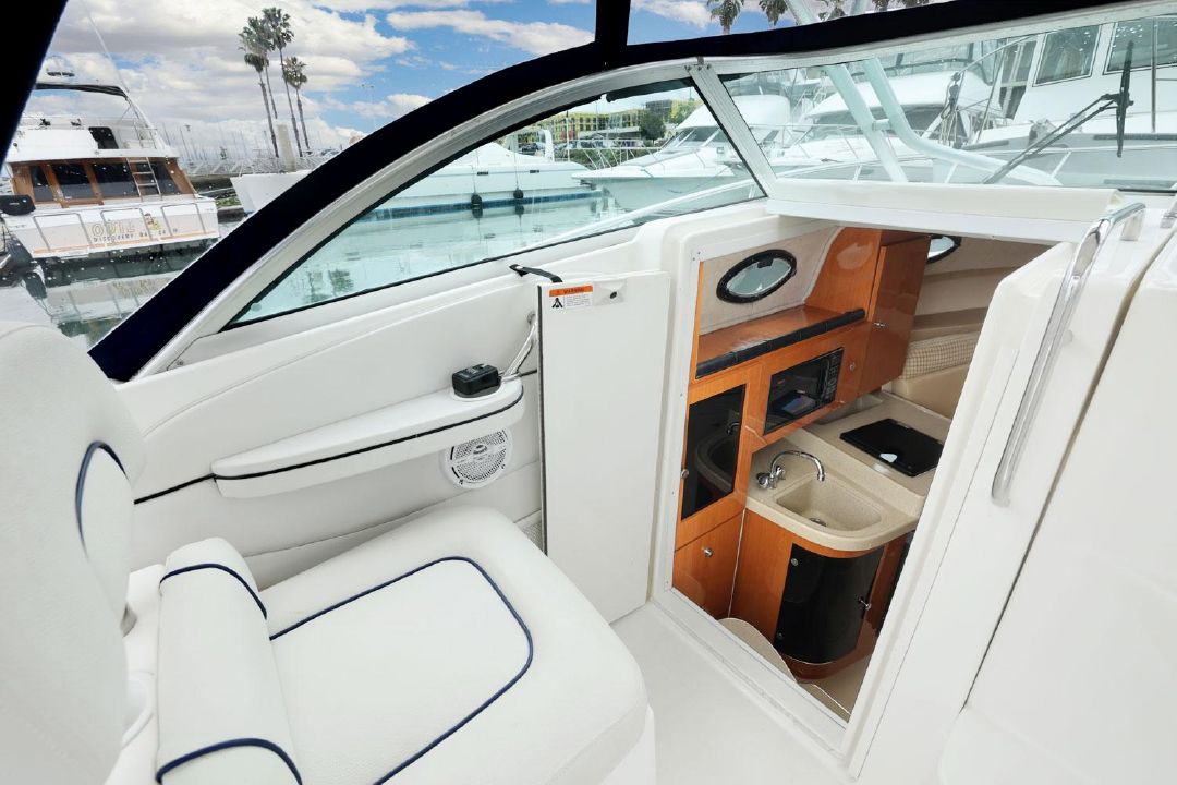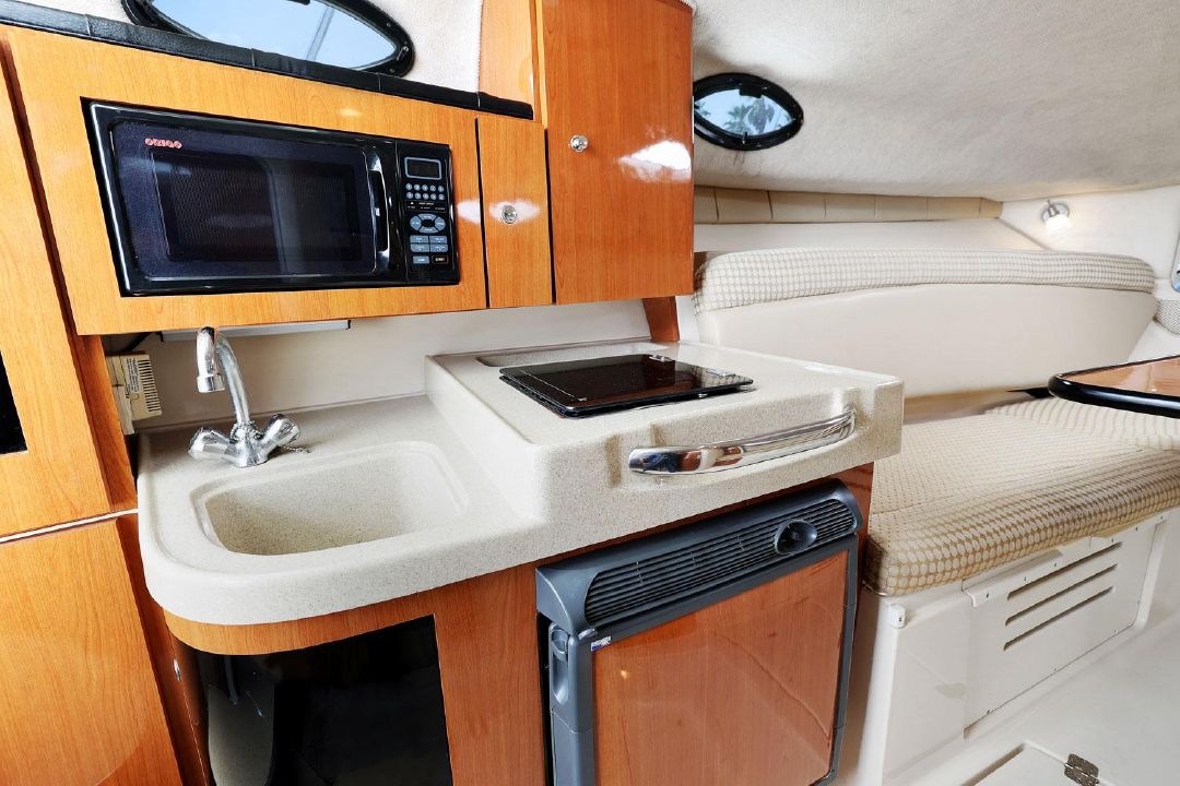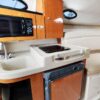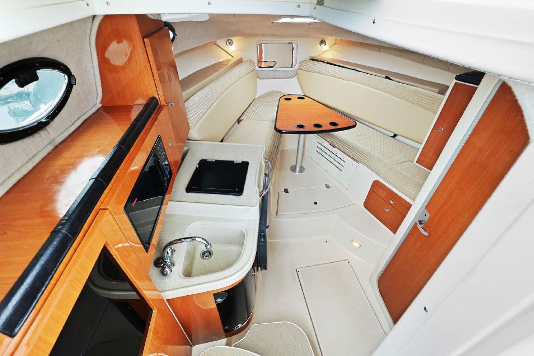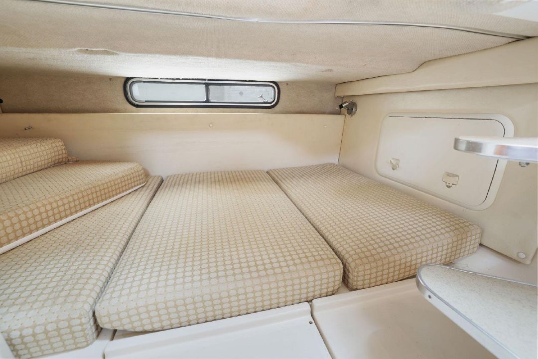 Built on a solid fiberglass hull, the wide-open interior of the 290 Coastal sleeps six and features a convertible dinette/V-berth forward (Note that the V-berth backrests swing up to form two pilot berths.) A full-service galley with refrigerator, single burner stove, and microwave. A roomy head/shower compartment, and a mid cabin lounge that converts into a double berth.