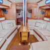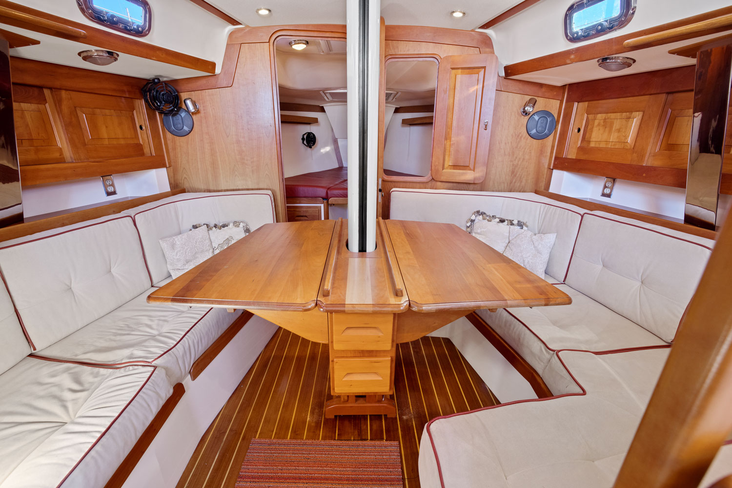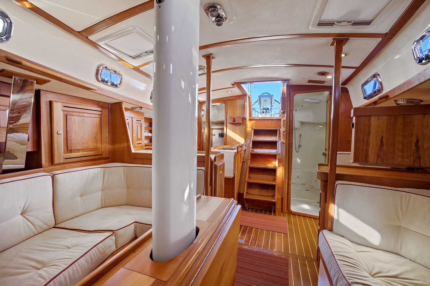 The cockpit is comfortable and set up for easy single-handing. Below decks the solid cherry interior feels rich and inviting. The two stateroom layout is perfect for cruising.