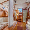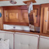 The galley is set up well for efficiency and entertaining. There is a lift-up counter extension next to the large double basin sink. The large refrigerator is dual access: top loading and front access. It has drains for easy cleaning, or use as an icebox. The microwave is inside a cabinet to give clean lines to the wood interior. A 3-burner propane stove with oven has a custom cutting board top. Trash is conveniently located in a tip out cabinet accessible to the cabin.