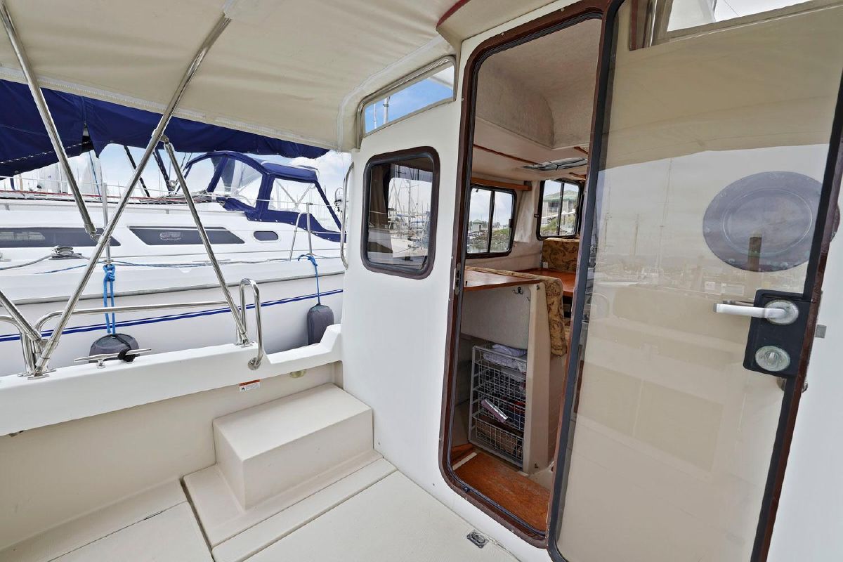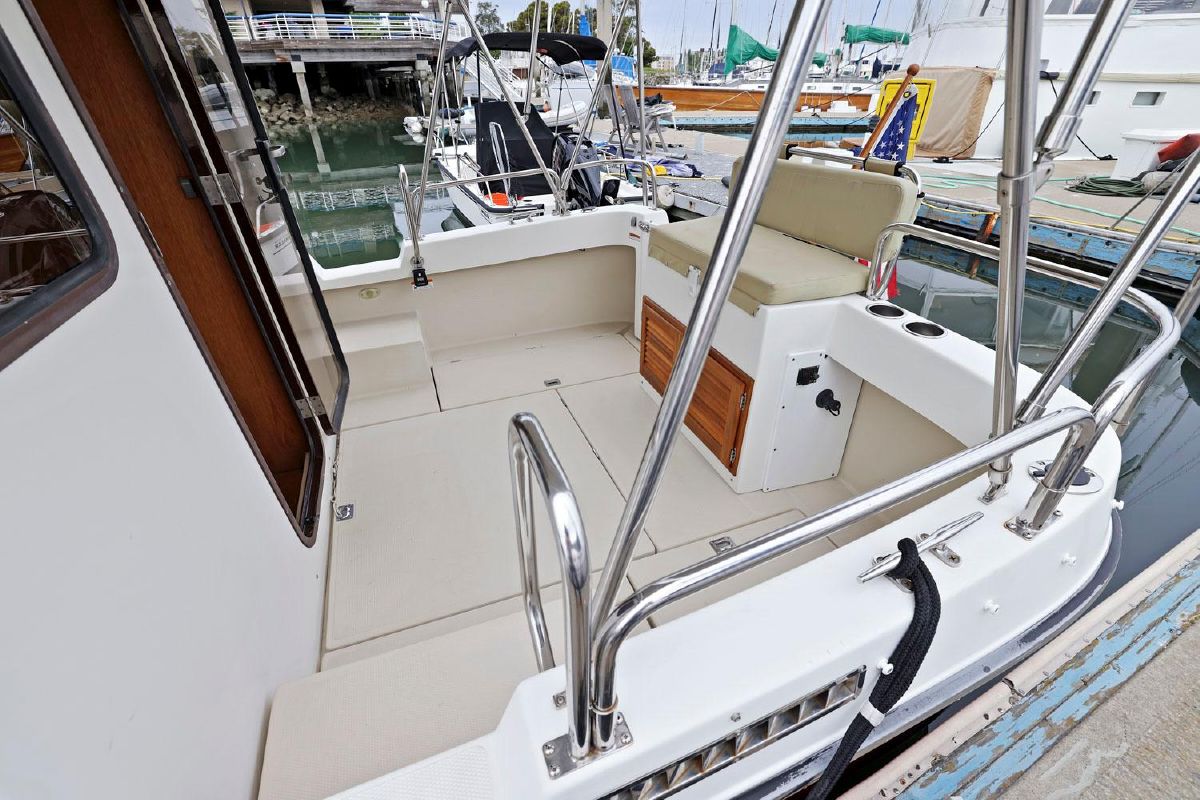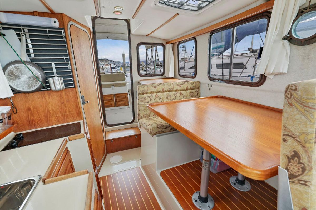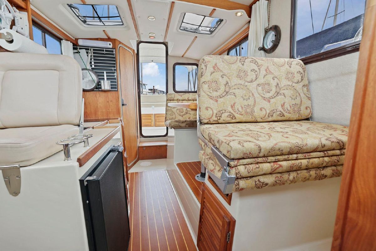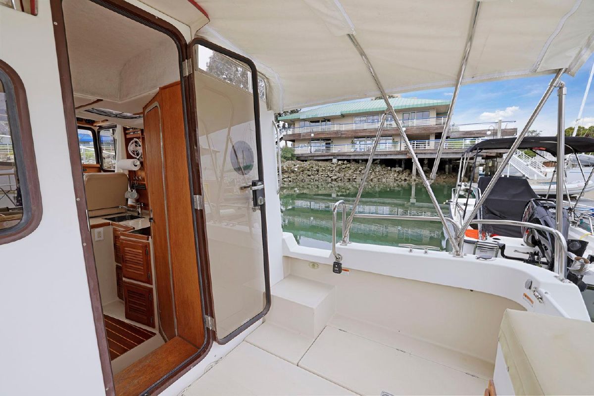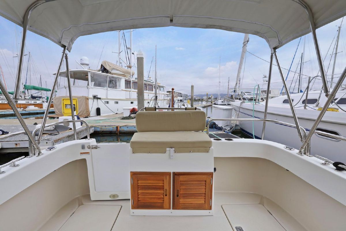 The aft deck is comfortable while under way, at the dock or at anchor. The bimini canvas is new, along with the curtains and shades that cover all windows. There are screens to enclose the aft deck, allowing for a cool breeze, but no bugs.