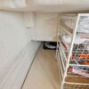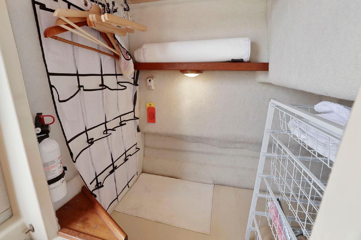 The galley space is optimized with a refrigerator, electric stove top, built in spice rack and a customized pot and pan holder.