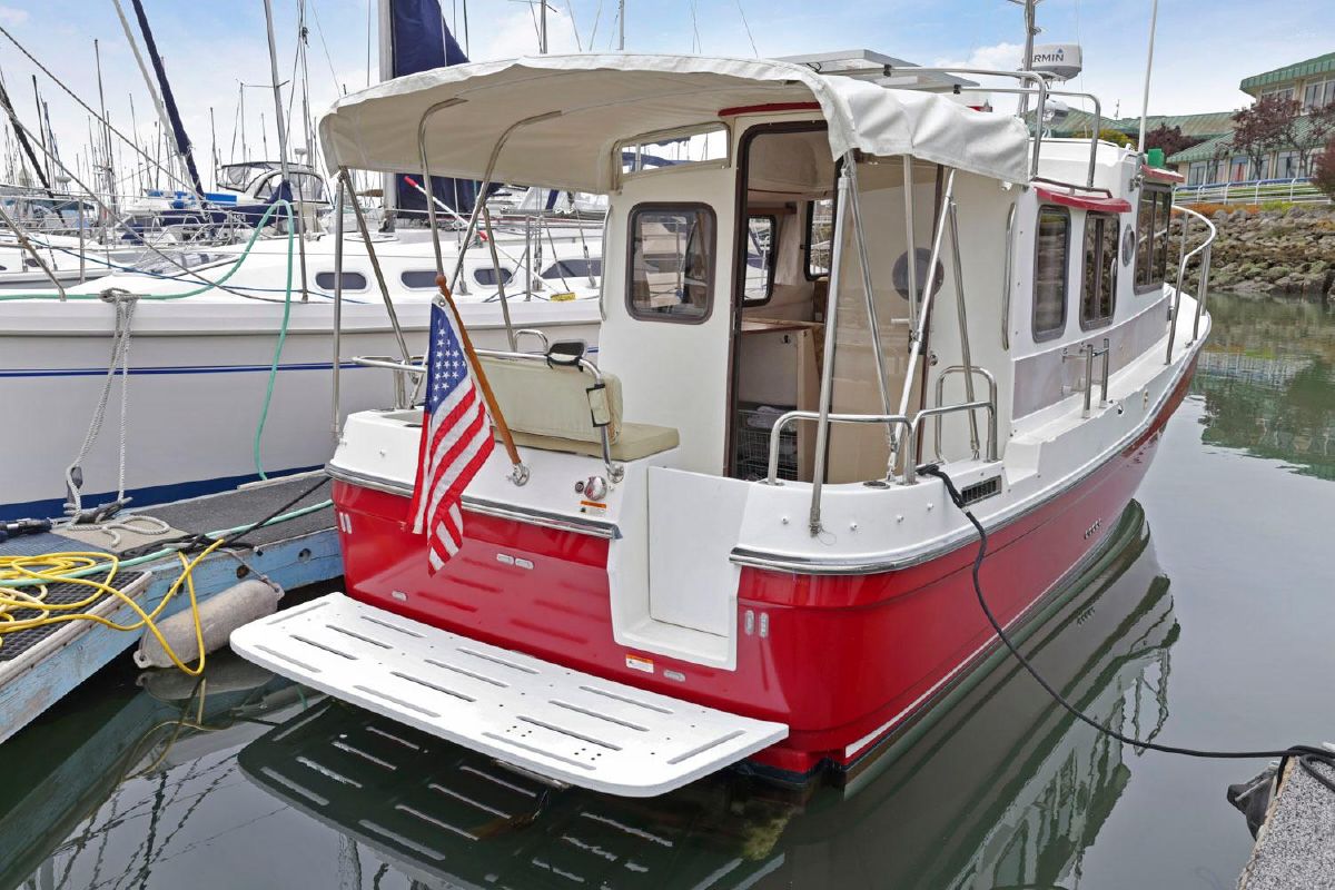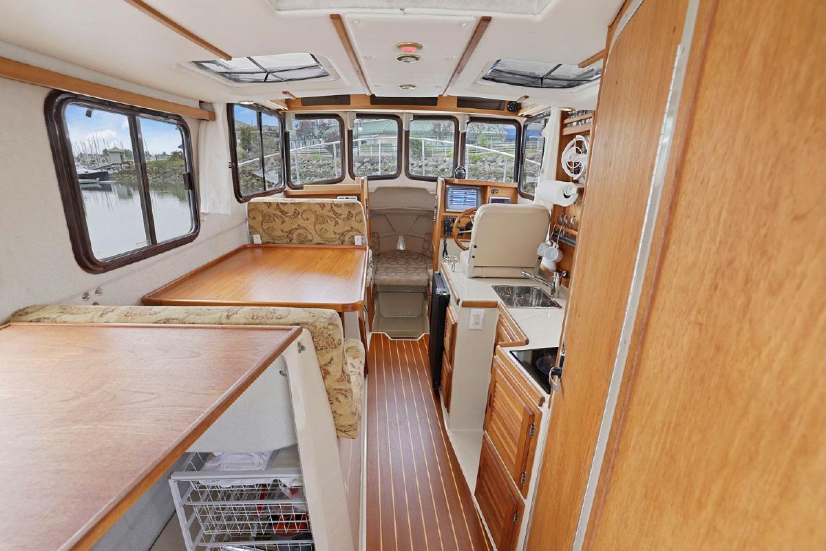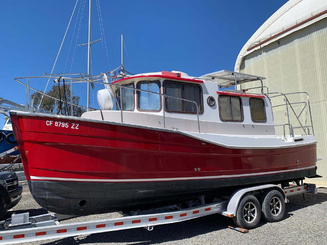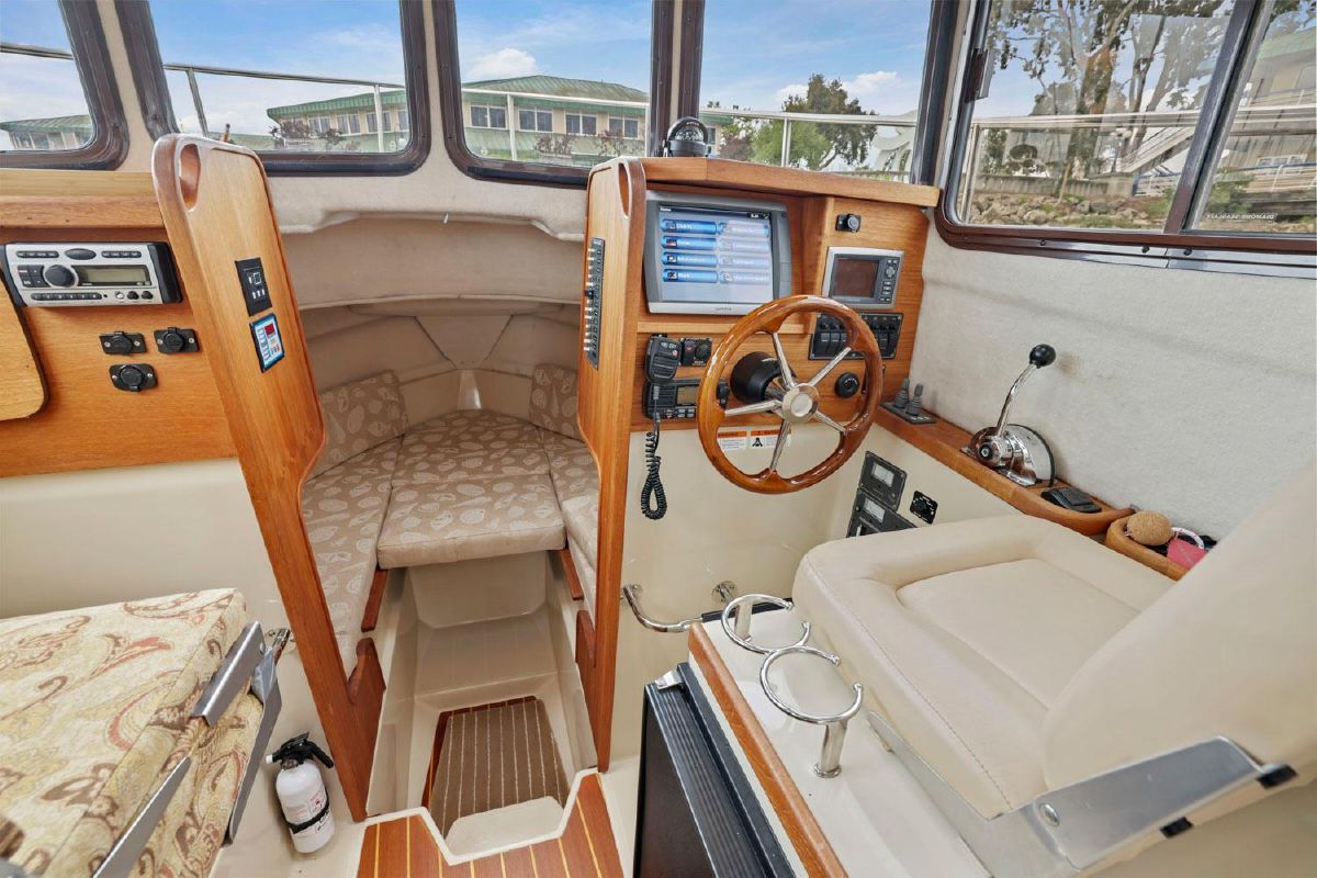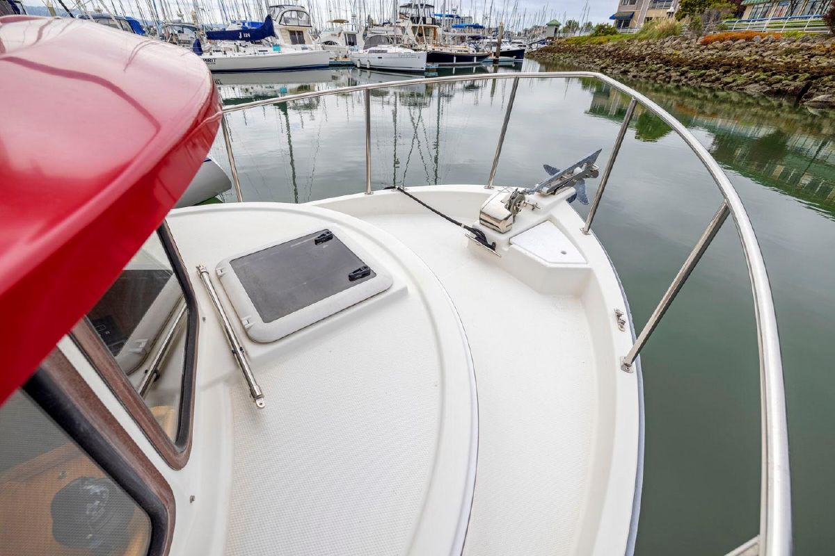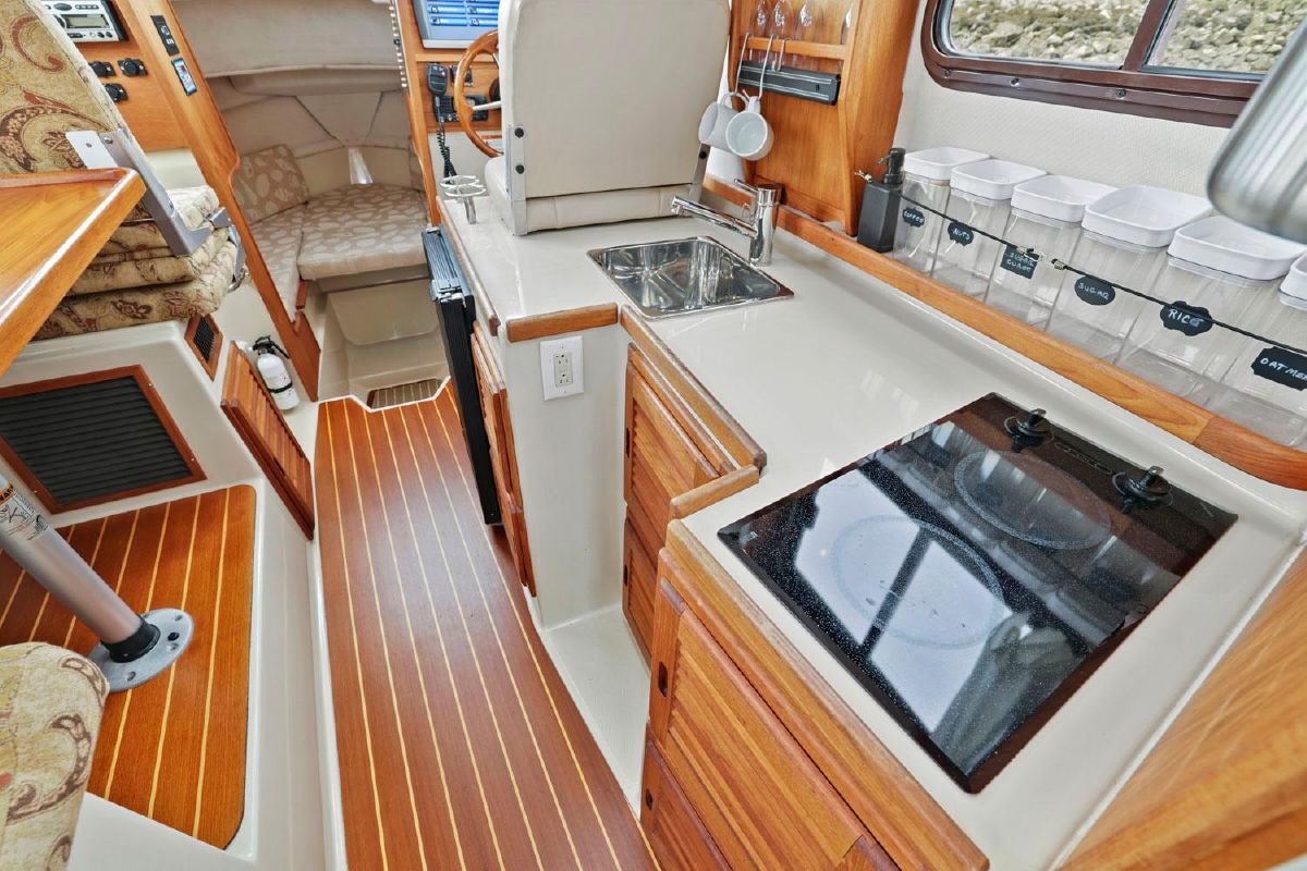 As with all Ranger Tugs the salon is full of natural light and the efficient use of space means that the serious cruising couple will always be comfortable in the cabin or cockpit. And the 8′ 6″ beam allows you to trailer her without special permits on the easy loading Aluminum Trailer. She has a compact galley and aft cabin, which is currently optimized for storage.