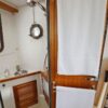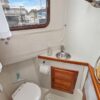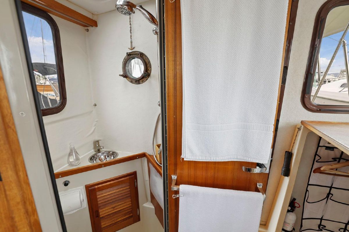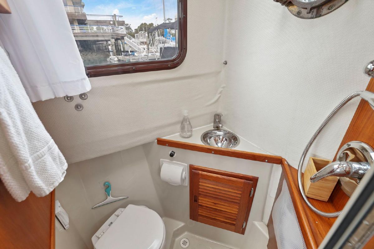The enclosed head has a shower, sink and Jabsco electric marine toilet.
