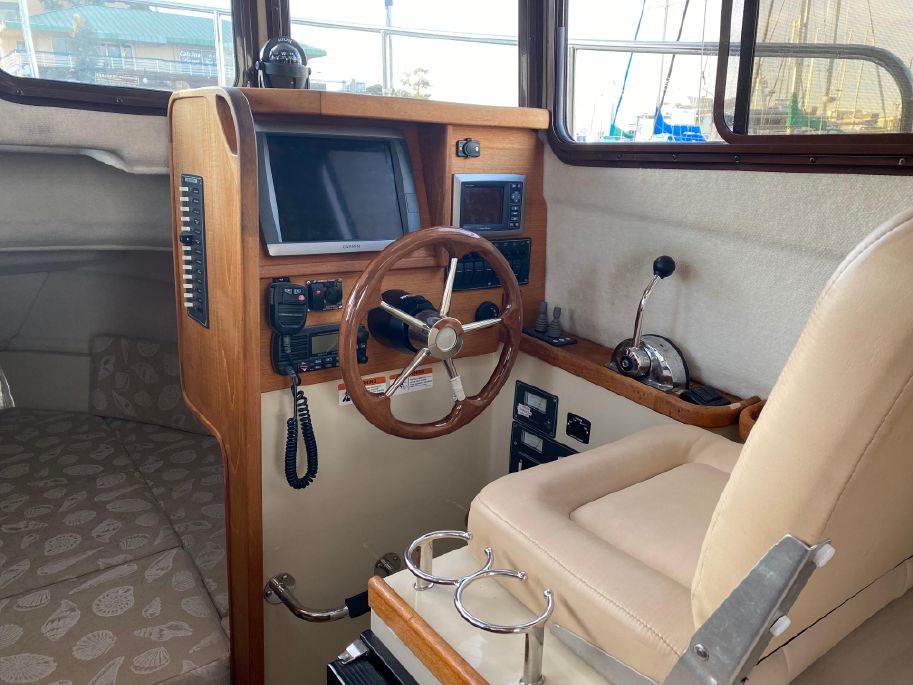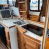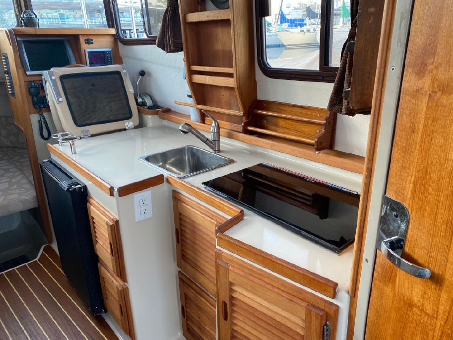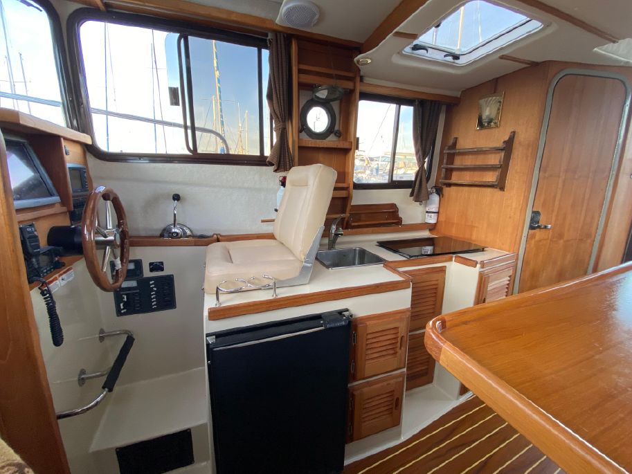 The helm is on starboard with a seat that folds forward for more galley counter space.
