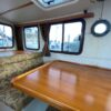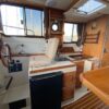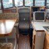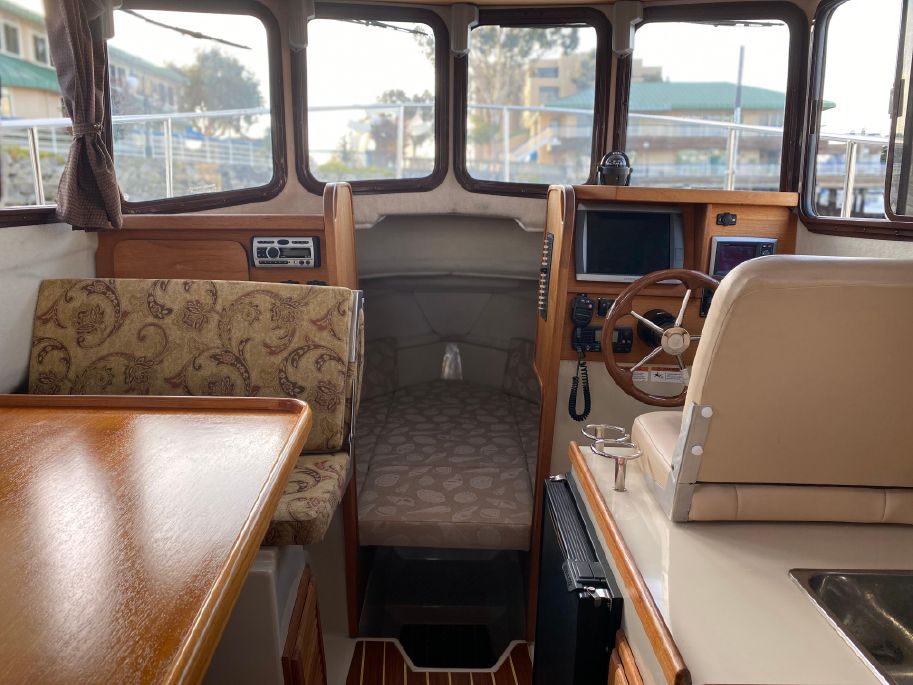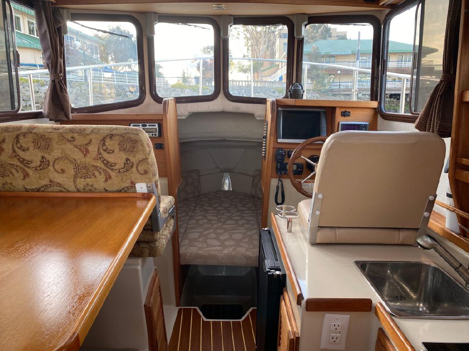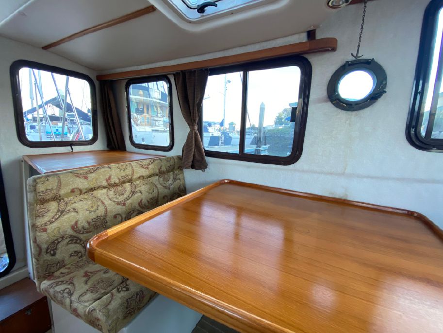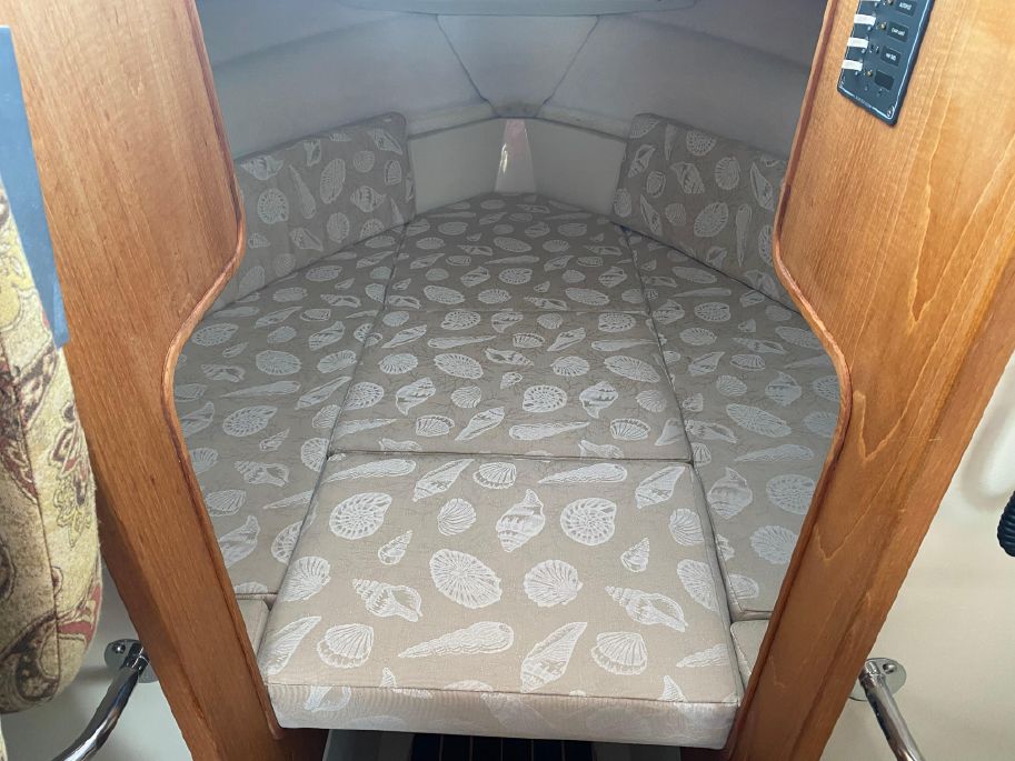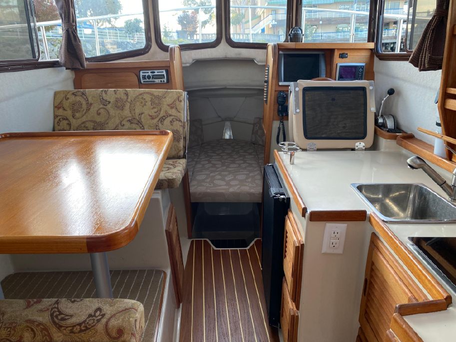 On the port side is a single berth which can also be used for storage. The booth style dinette is on port with a reversible direction seat that changes from forward facing to aft facing by easily flipping the back.