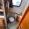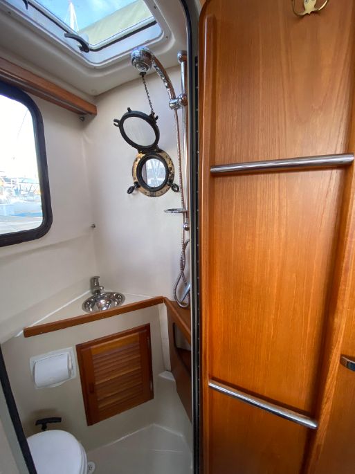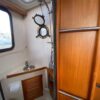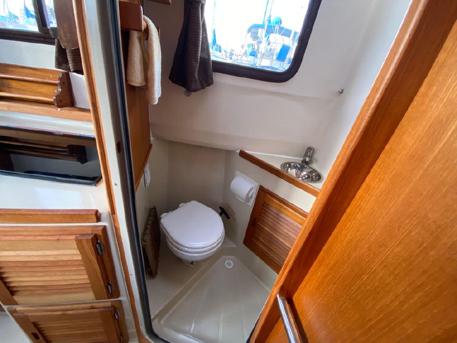 On the starboard side is the stand-up head with shower. In front of it is the galley with stainless steel sink, two burner (one electric, one butane) stove and storage pockets above, cabinet storage below counter.