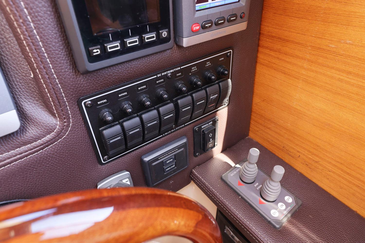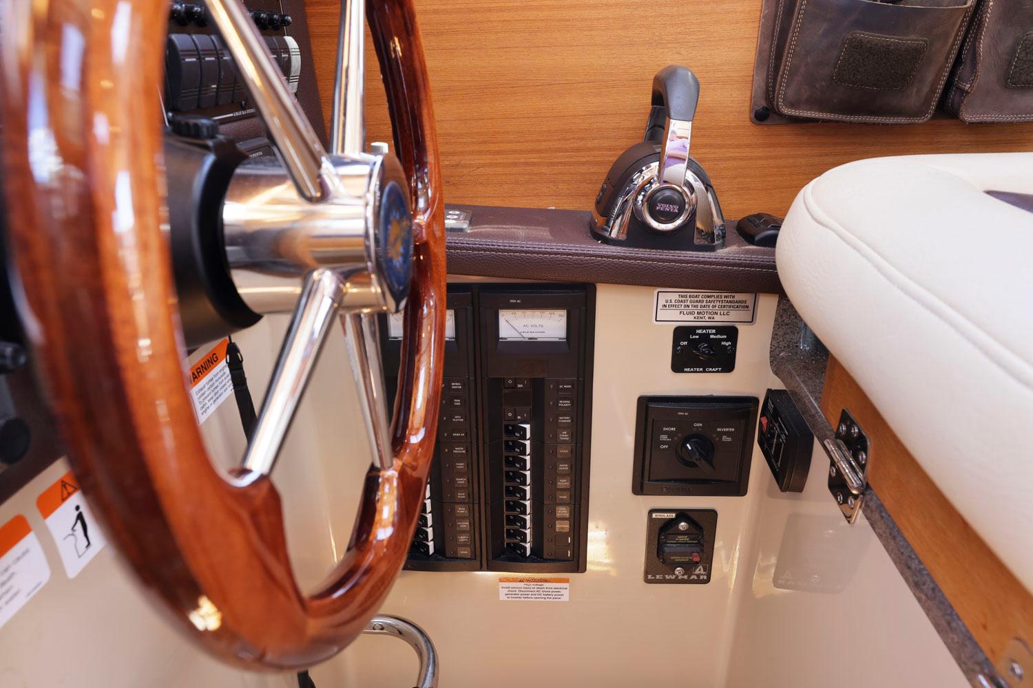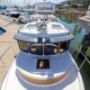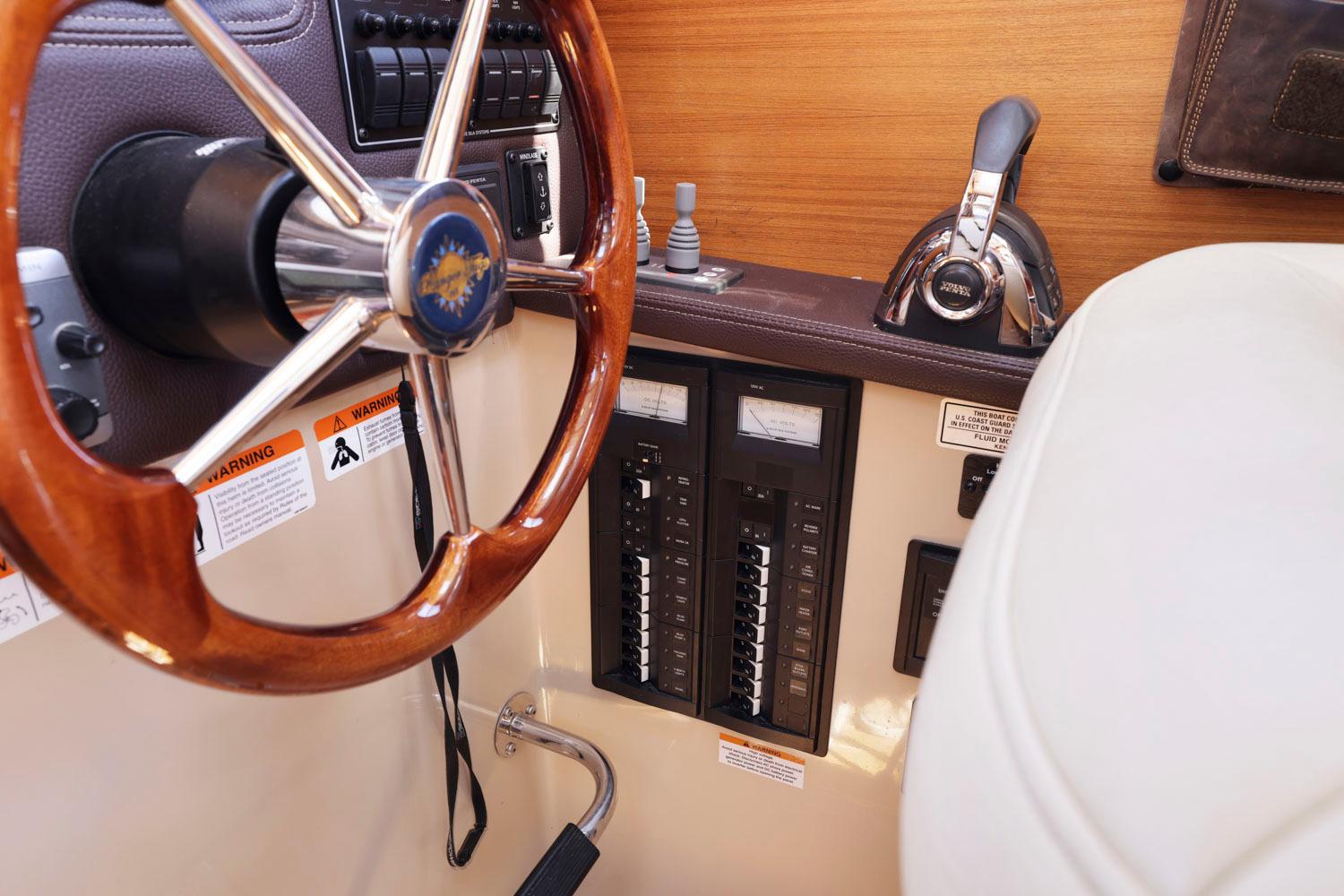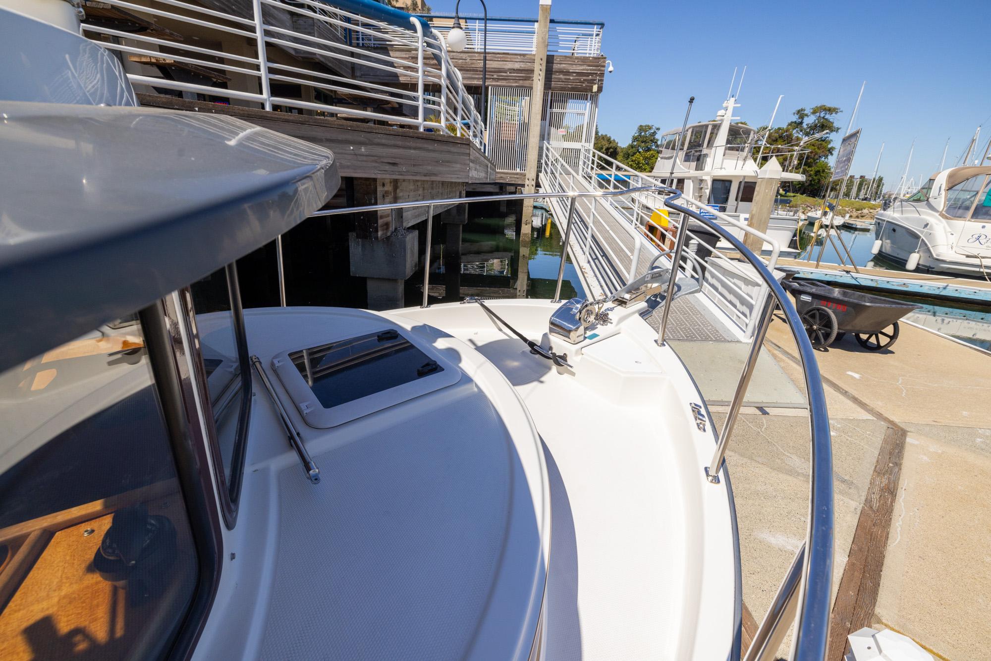 Features like standard bow and stern thrusters provide for excellent maneuverability around the dock and the 8’6″ beam allows the boat to be easily trailered.