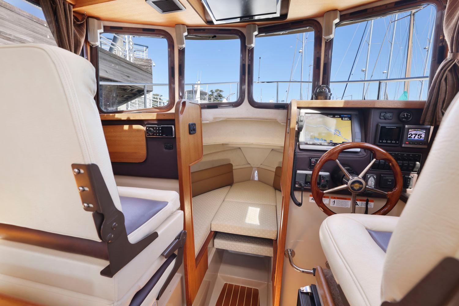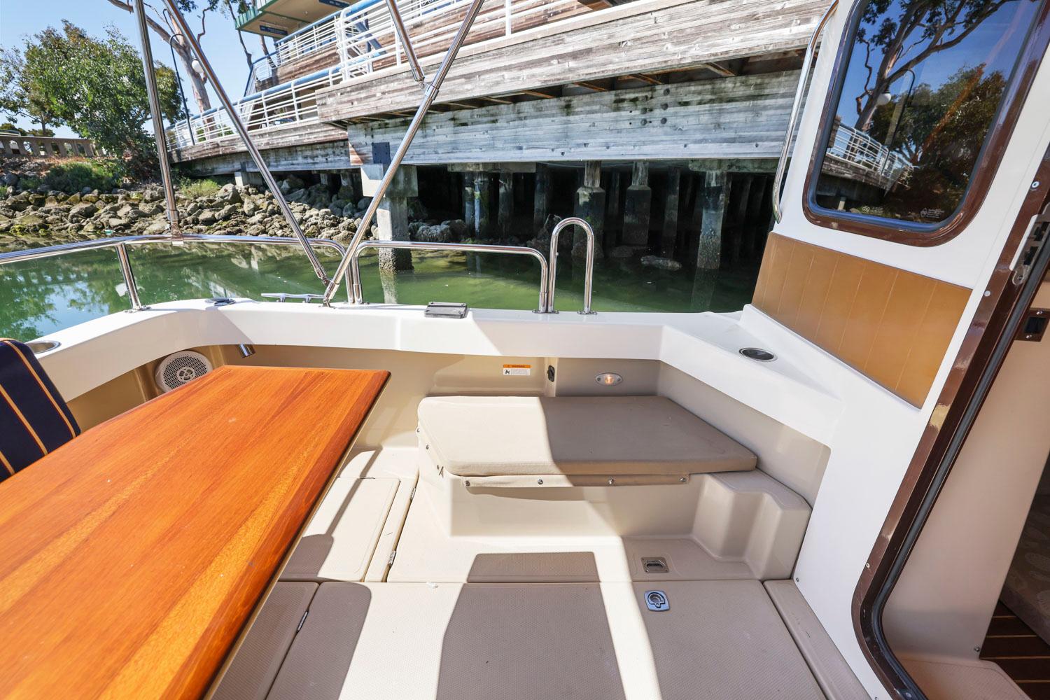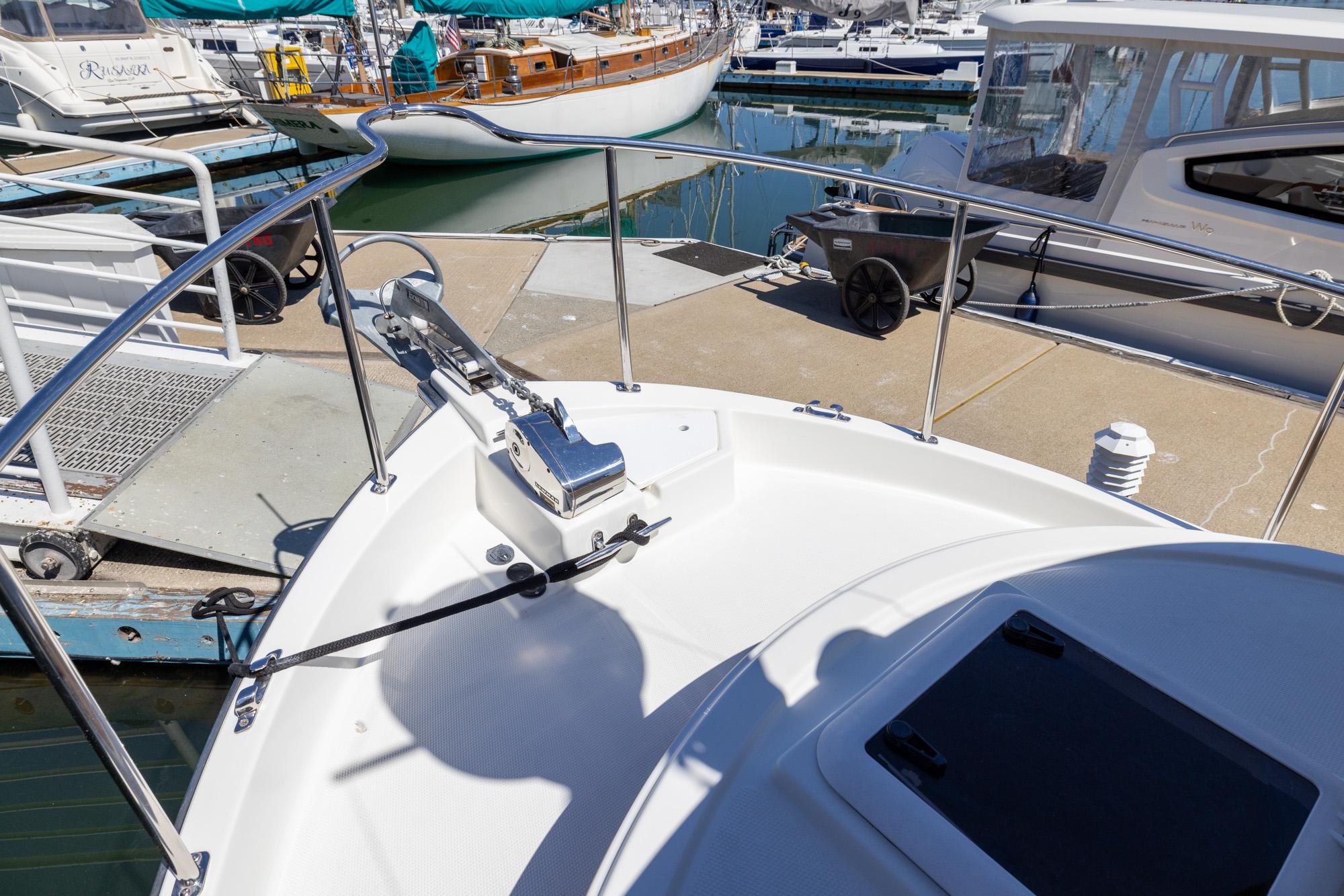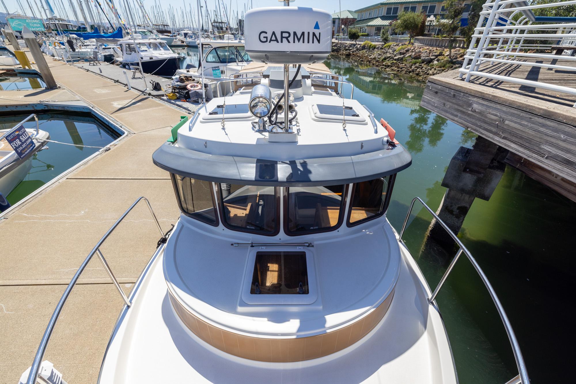 Features like standard bow and stern thrusters provide for excellent maneuverability around the dock and the 8’6″ beam allows the boat to be easily trailered.