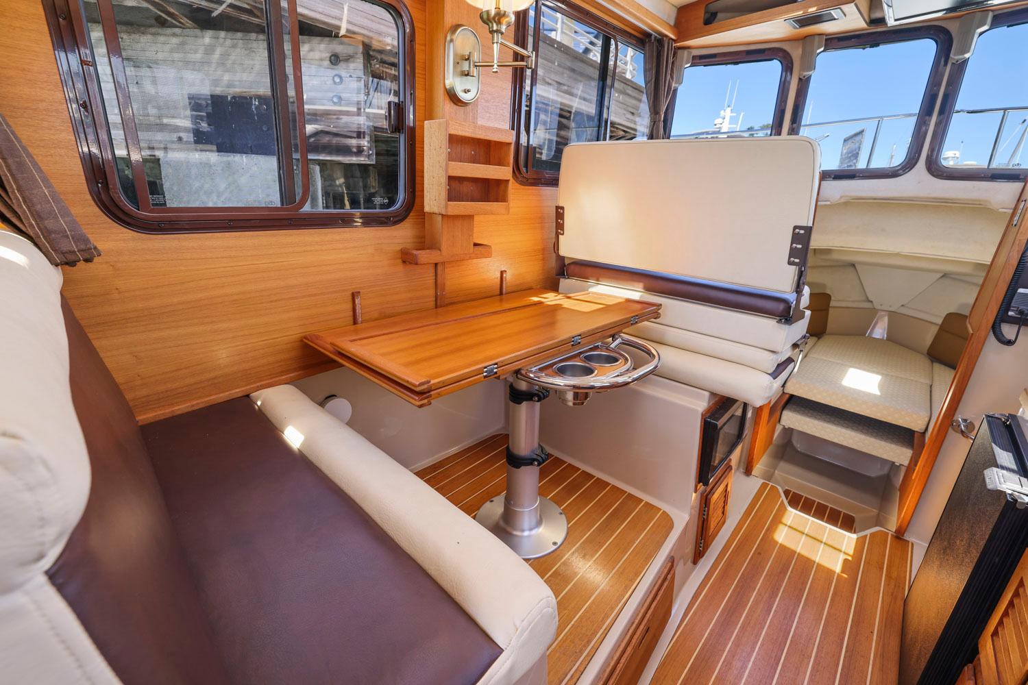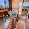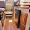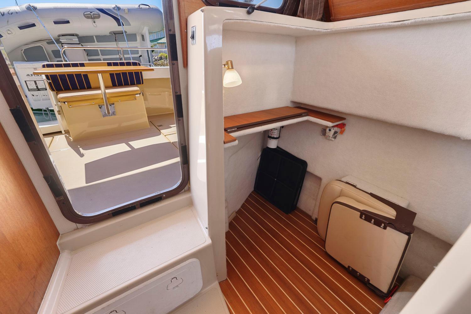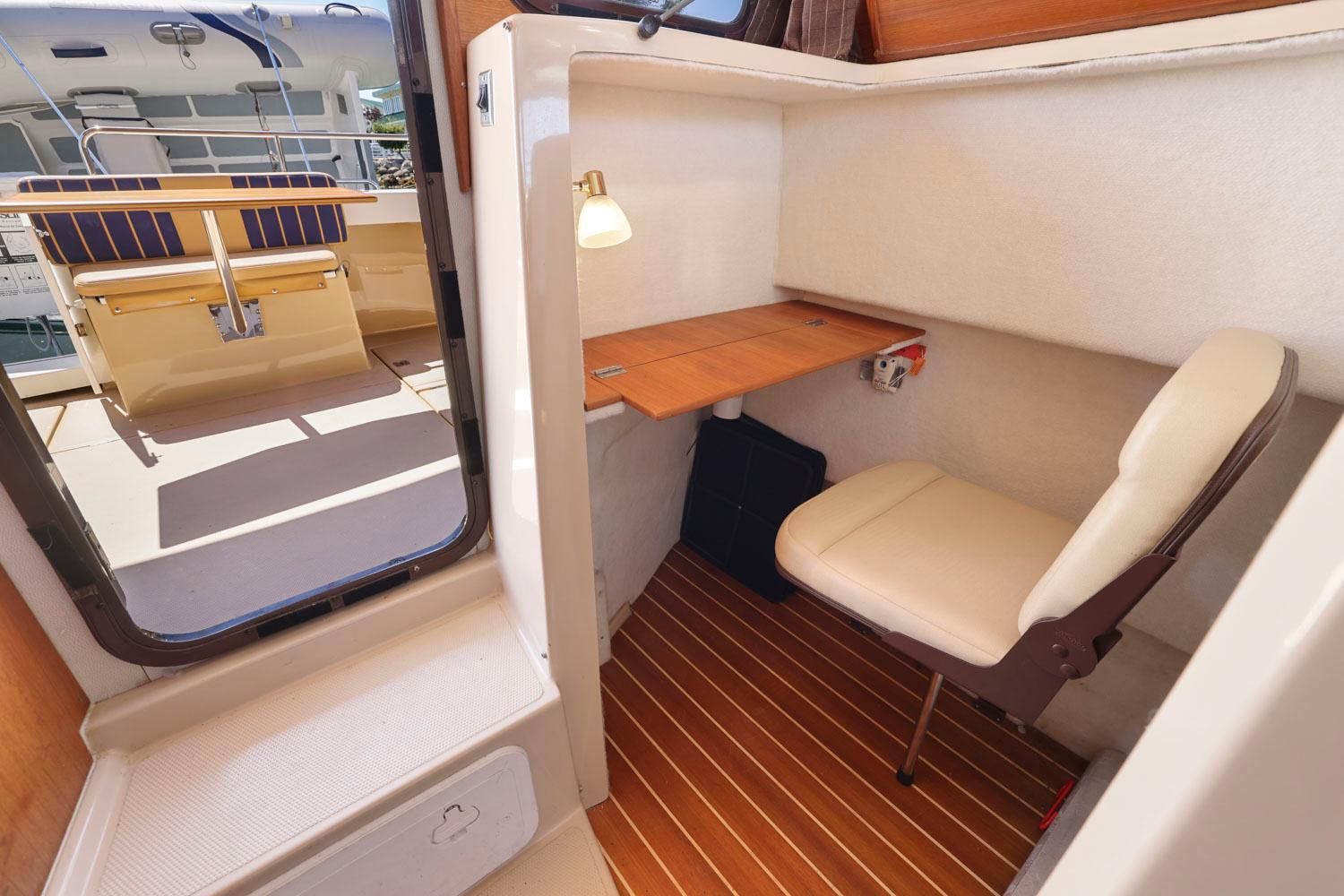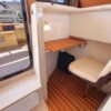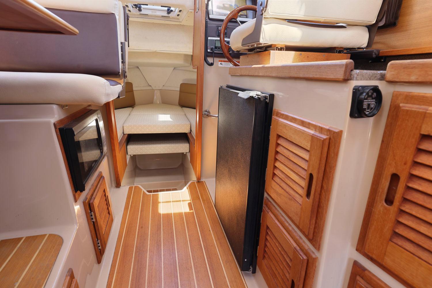 The R27 has nearly 50 Sq ft of aft deck space making the cockpit 25 percent larger than the original R25. This allows for easy access to the 220 HP volvo diesel and keeps the engine noise out of the cabin. The larger cockpit also lends itself to more above and below deck storage. The well appointed cabin has a midship office with desk and chair, this space also converts to a berth that sleeps two. The dinette table is on a hydraulic piston that allows for an easy conversion to a berth or lounging area. The spacious front v-berth sleeps two adults and is over 6’5″ in length. Cooks will love the standard galley which includes a sink, refrigerator, inverter, microwave and a combination propane stove/oven. The marine head is standard with an electric flush toilet, glass vessel sink and shower.