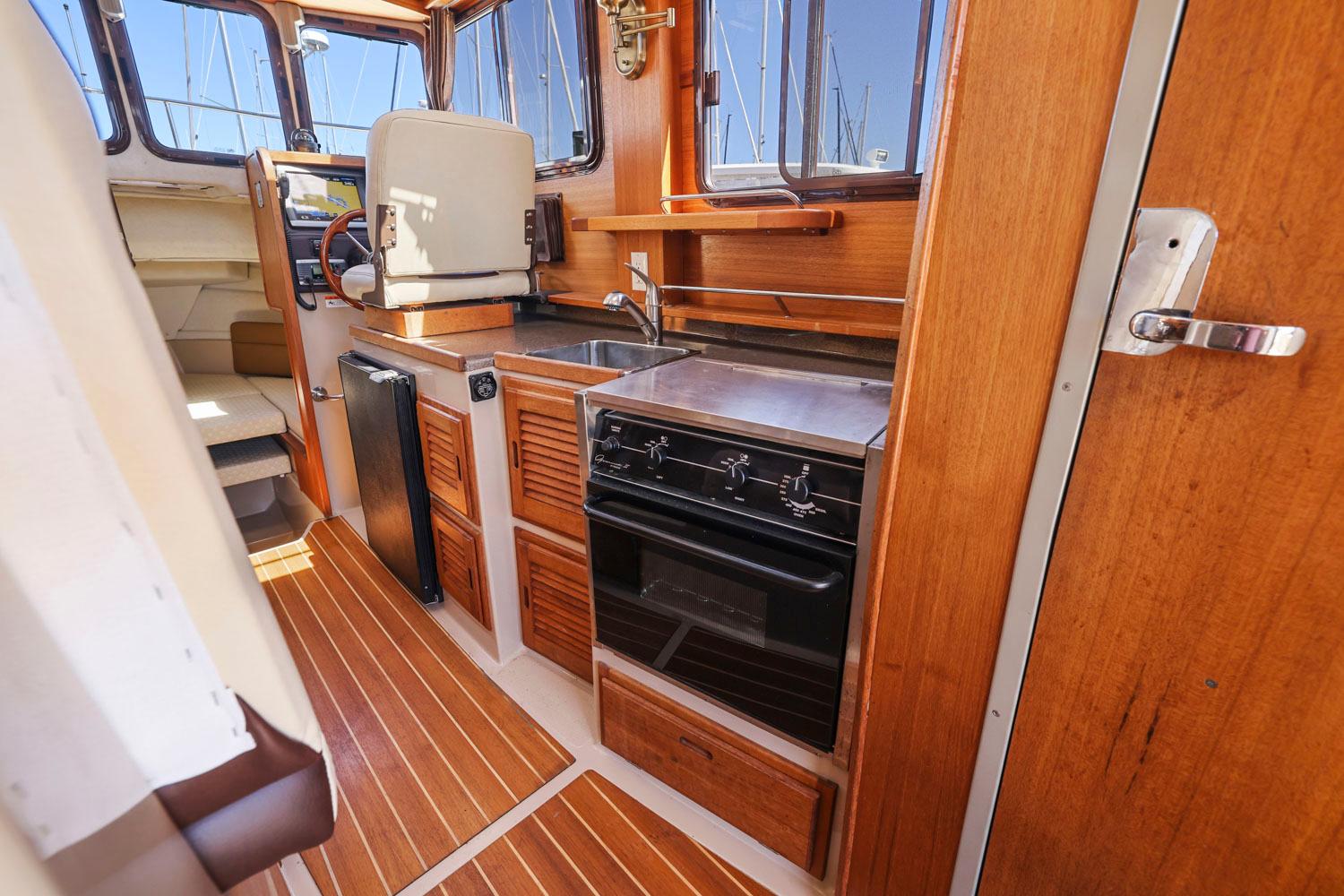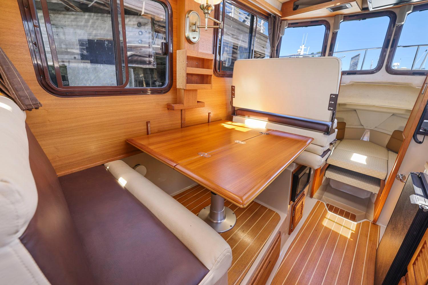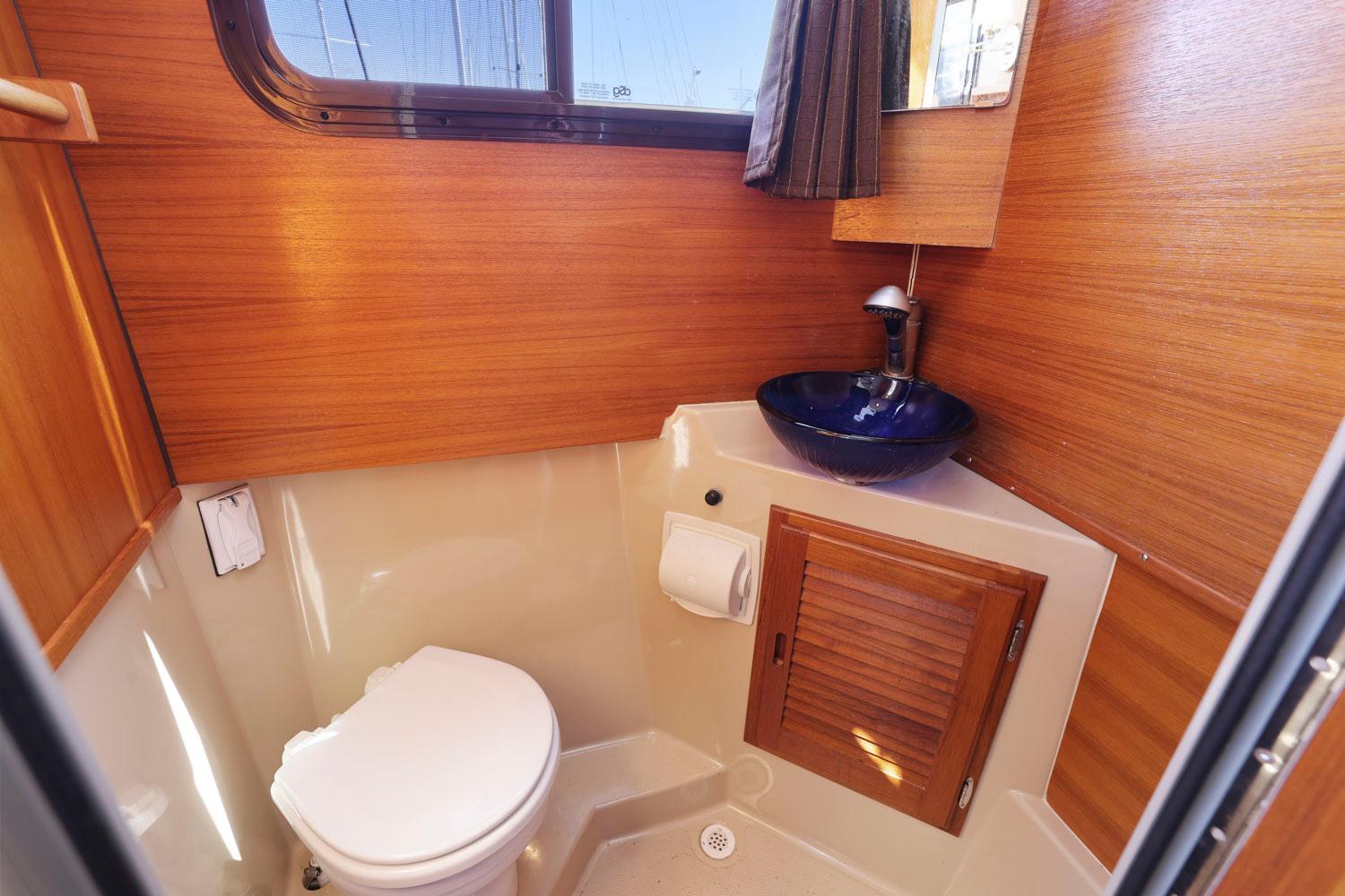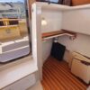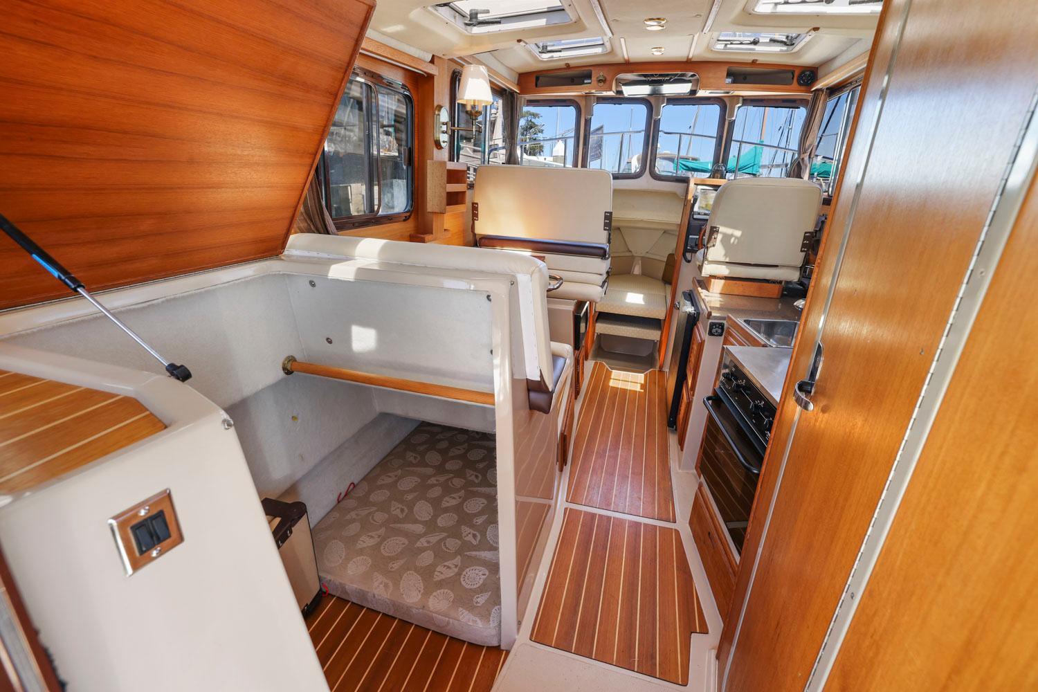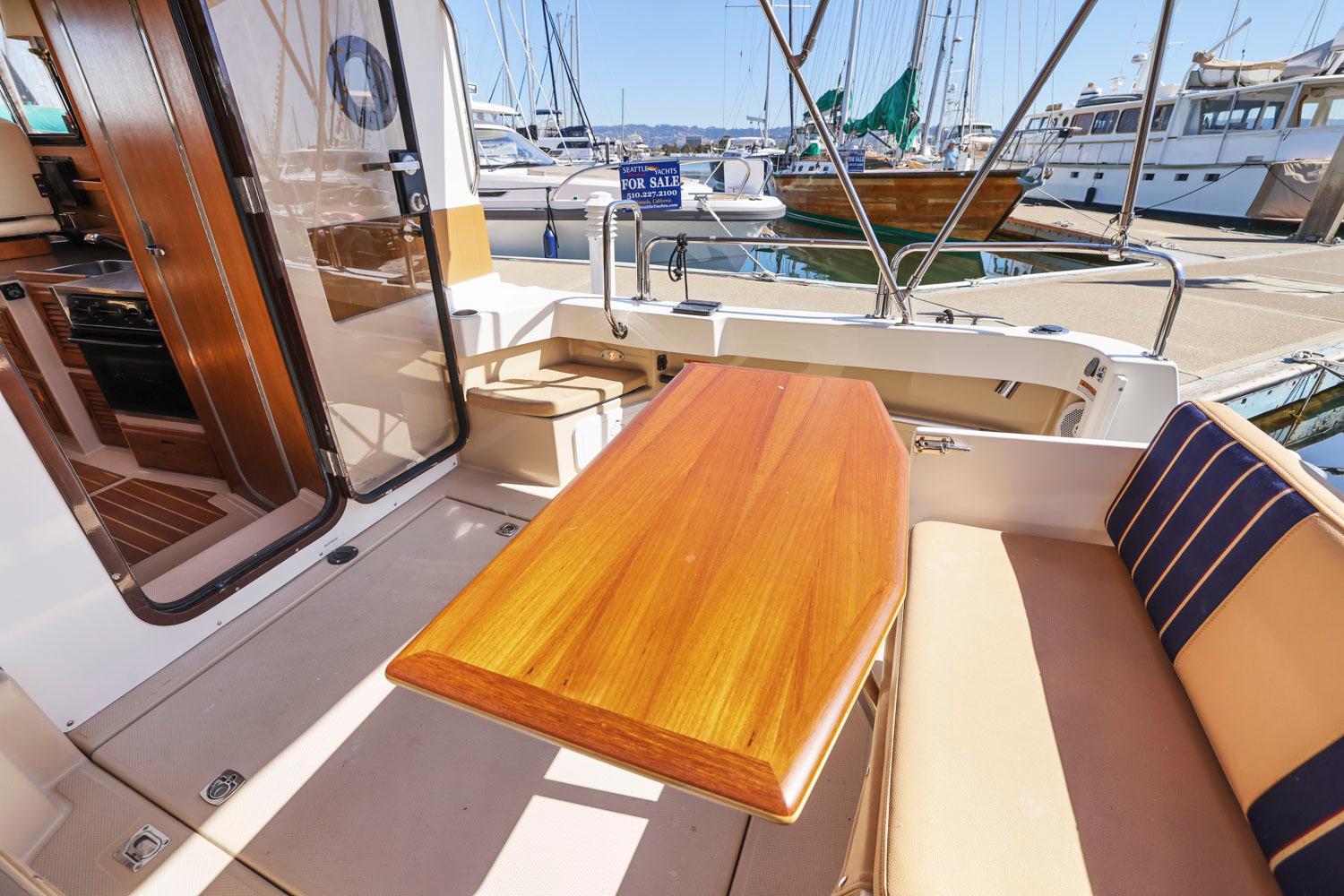 The R27 has nearly 50 Sq ft of aft deck space making the cockpit 25 percent larger than the original R25. This allows for easy access to the 220 HP volvo diesel and keeps the engine noise out of the cabin. The larger cockpit also lends itself to more above and below deck storage. The well appointed cabin has a midship office with desk and chair, this space also converts to a berth that sleeps two. The dinette table is on a hydraulic piston that allows for an easy conversion to a berth or lounging area. The spacious front v-berth sleeps two adults and is over 6’5″ in length. Cooks will love the standard galley which includes a sink, refrigerator, inverter, microwave and a combination propane stove/oven. The marine head is standard with an electric flush toilet, glass vessel sink and shower.