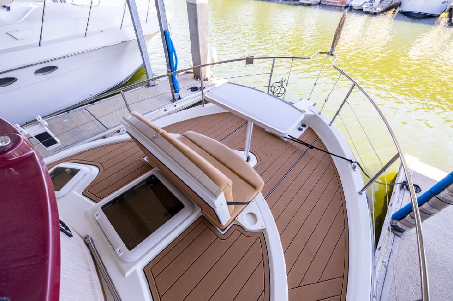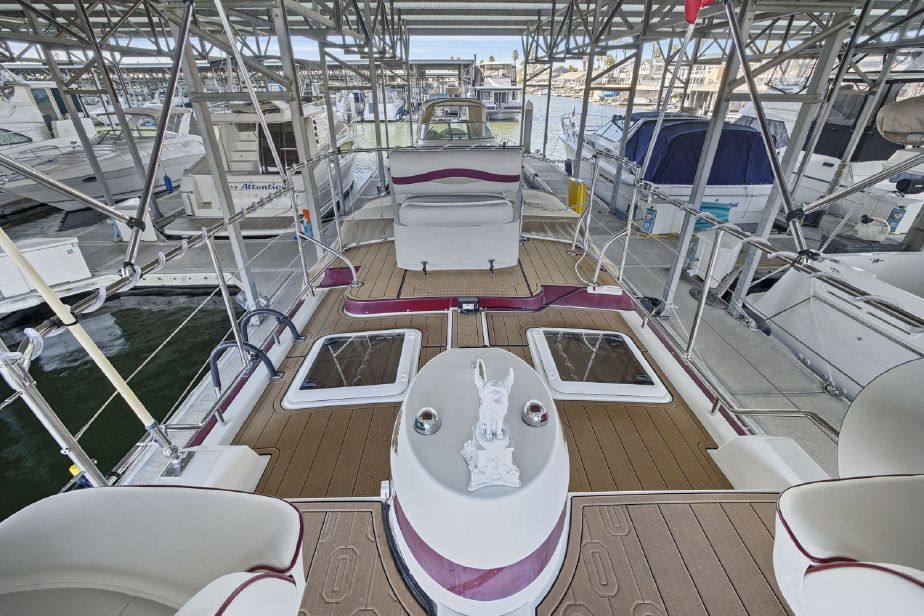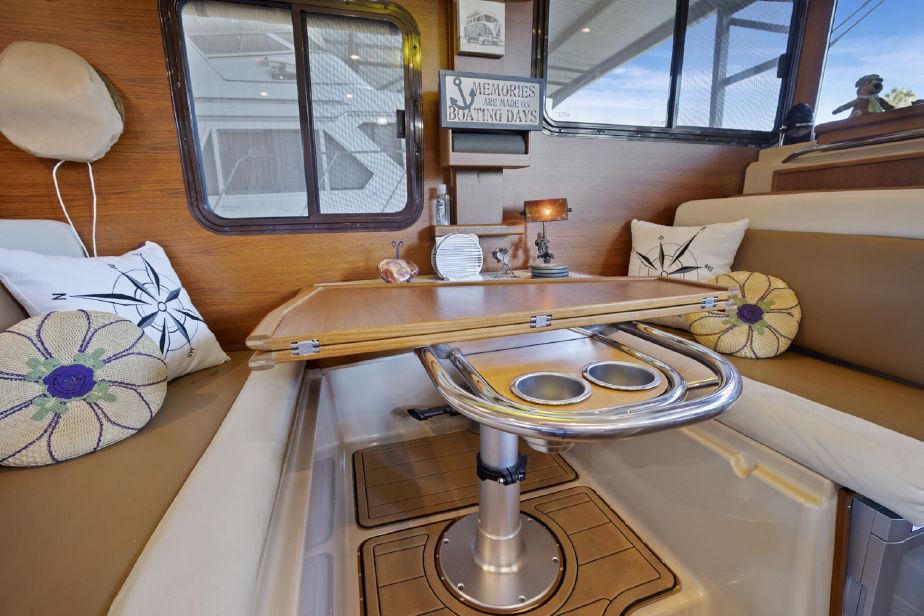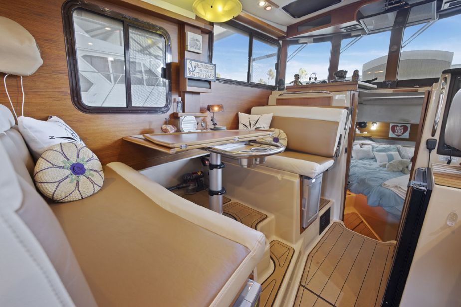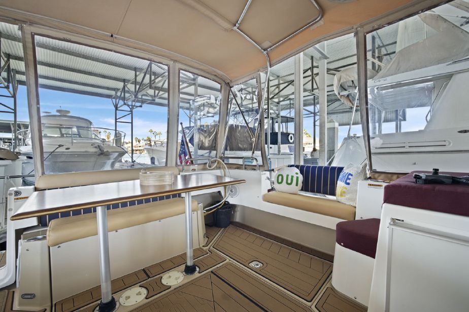 • Seating area built on cabin top with two captains chairs and bench