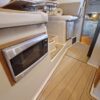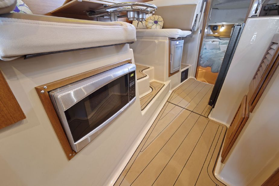 The galley runs along the starboard side of the salon and features teak cabinetry with a solid surface countertop, quality appliances with abundant drawer and cabinet storage.