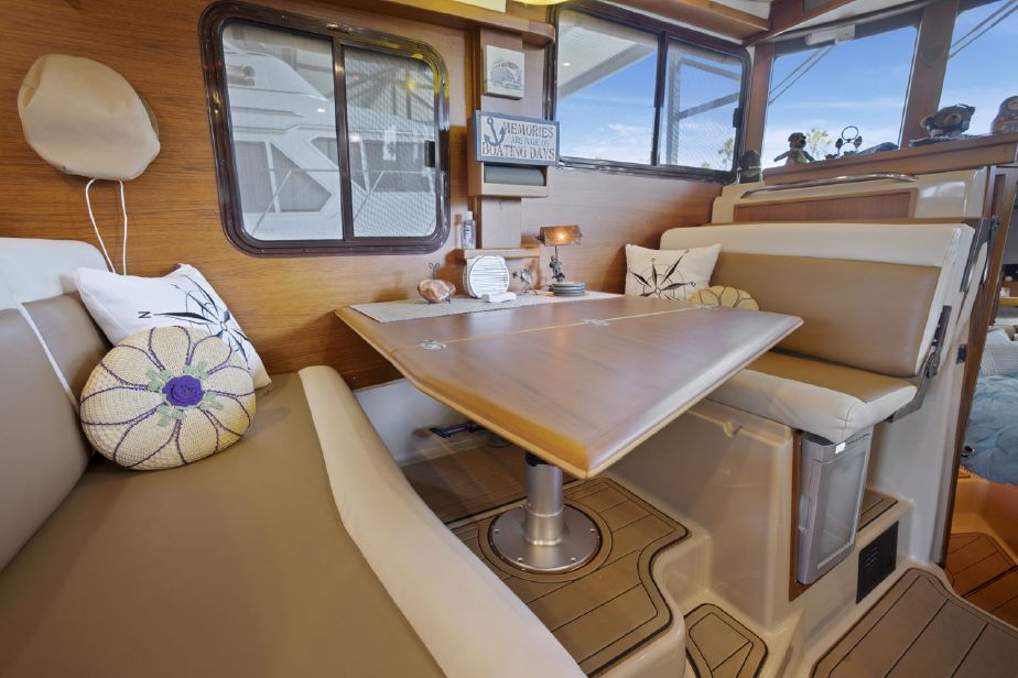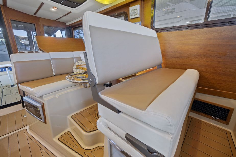 The R-31S shares many of the features and qualities of her smaller sisterships but some notable additions to this larger model make her ideal for extended cruising while still being a trailerable trawler. The builders at Ranger Tugs equipped the foredeck with seating and a table that can be raised or lowered depending on whether the boat is under way or at anchor or dock for entertaining. In addition to the foredeck seating, the R-31 boasts a larger cockpit area with wraparound seating utilizing seats that fold out of the gunwale. When not entertaining, seats are folded leaving the cockpit unencumbered.