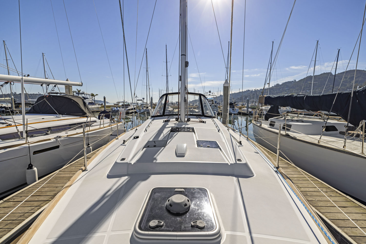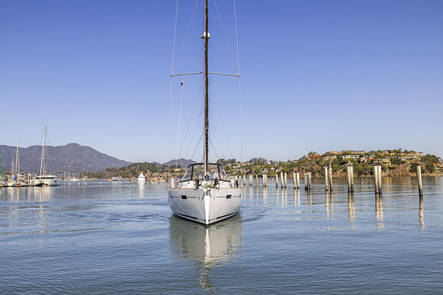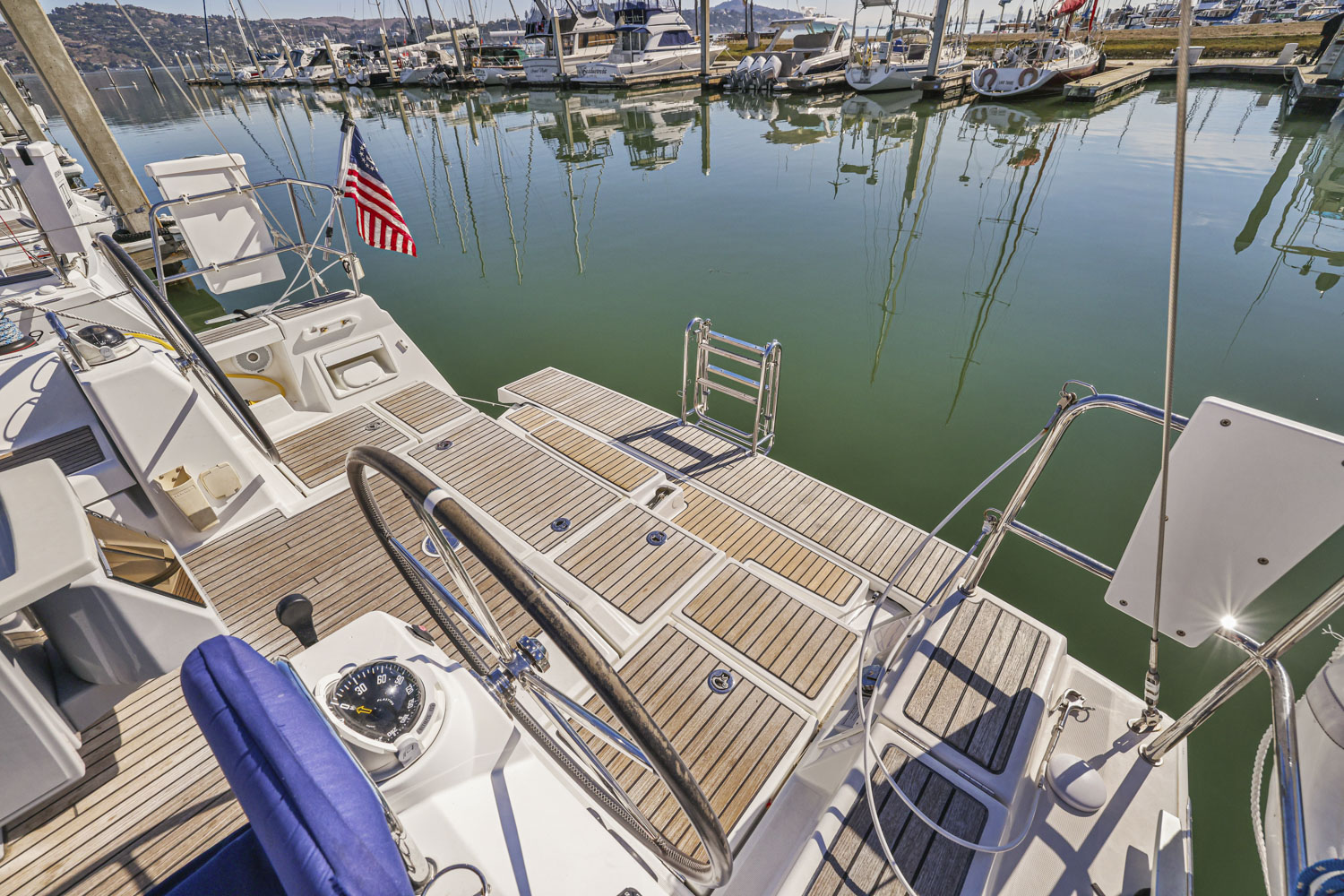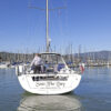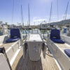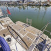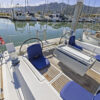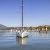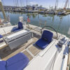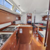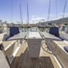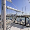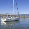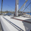 Her hard chine design hull delivers comfortable and fast sailing. The mainsail arch brings the mast back to the center of the boat and allows for a smaller, easier to tack headsail and at the same time gives you more space in the cockpit.