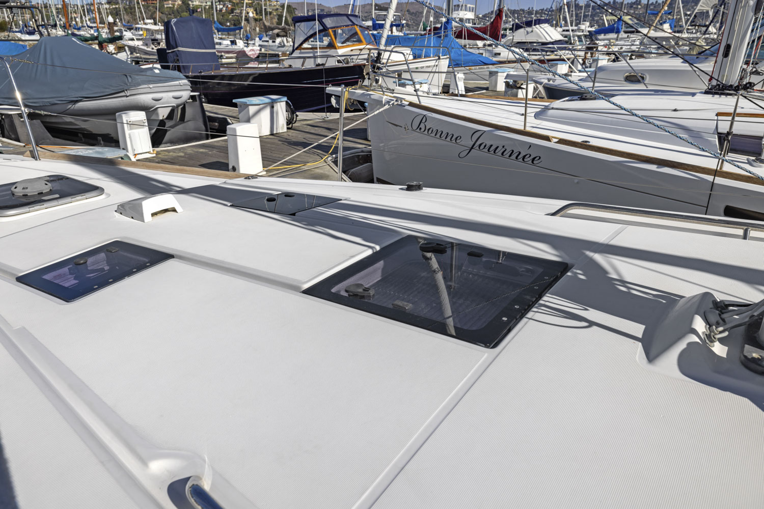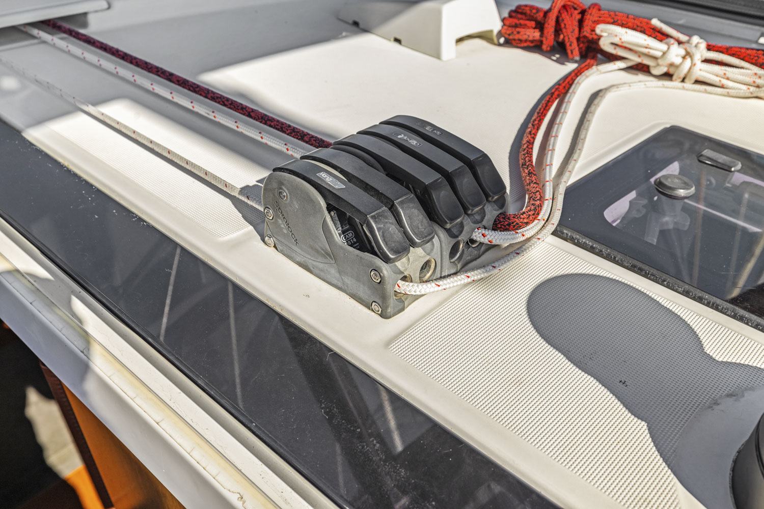 - Injection molded deck in glass fiber/balsa sandwich, covered with “diamond-point” non-slip coating