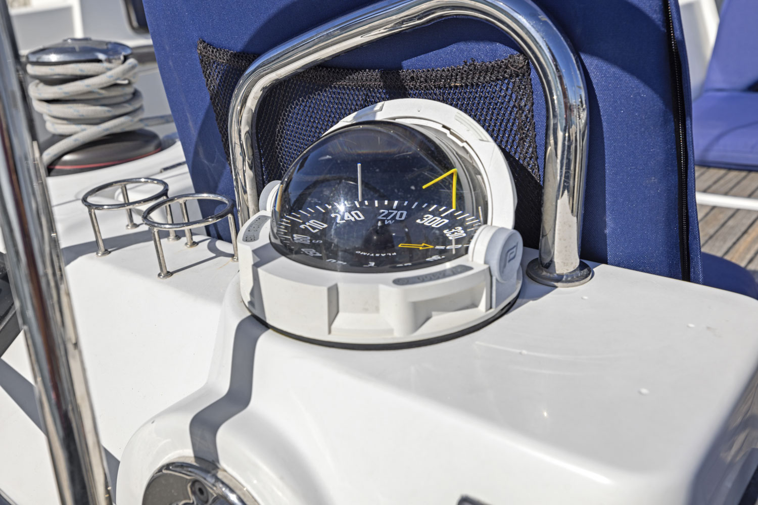 - 2 Steering wheel consoles: Stainless steel steering wheels – leather covered – Steering gear at the helm station – metal cable transmission system – Stainless steel handrail – navigation instrument support – Glass holder