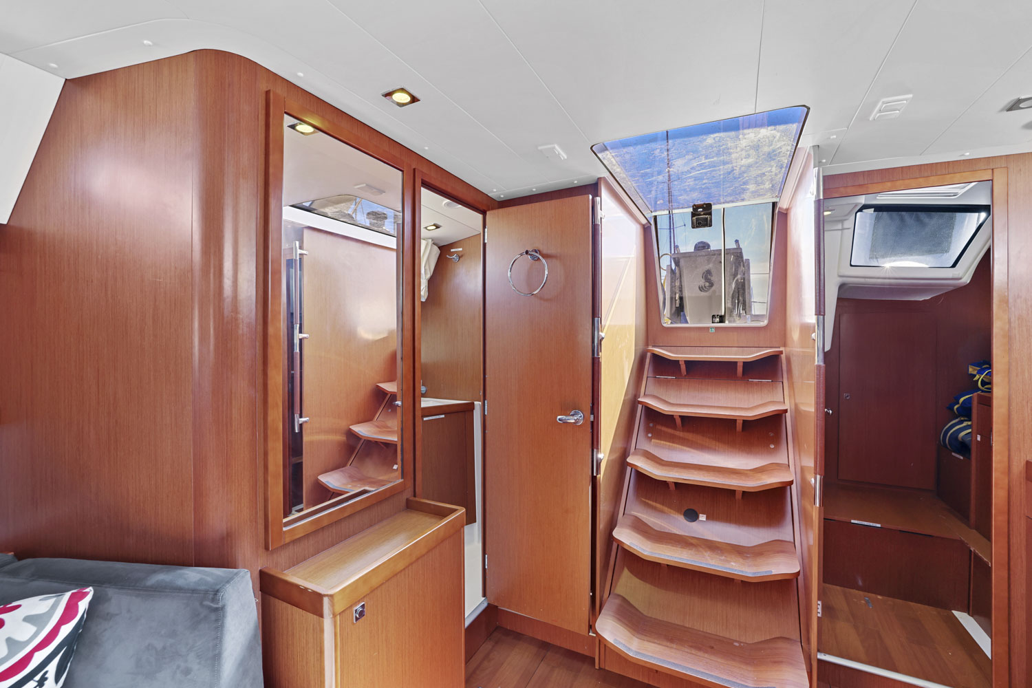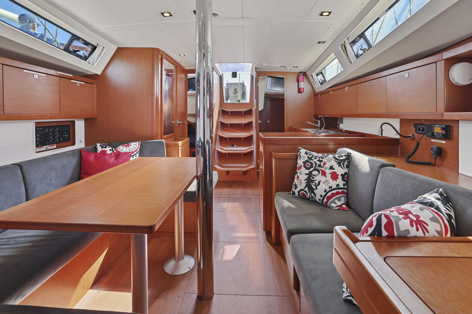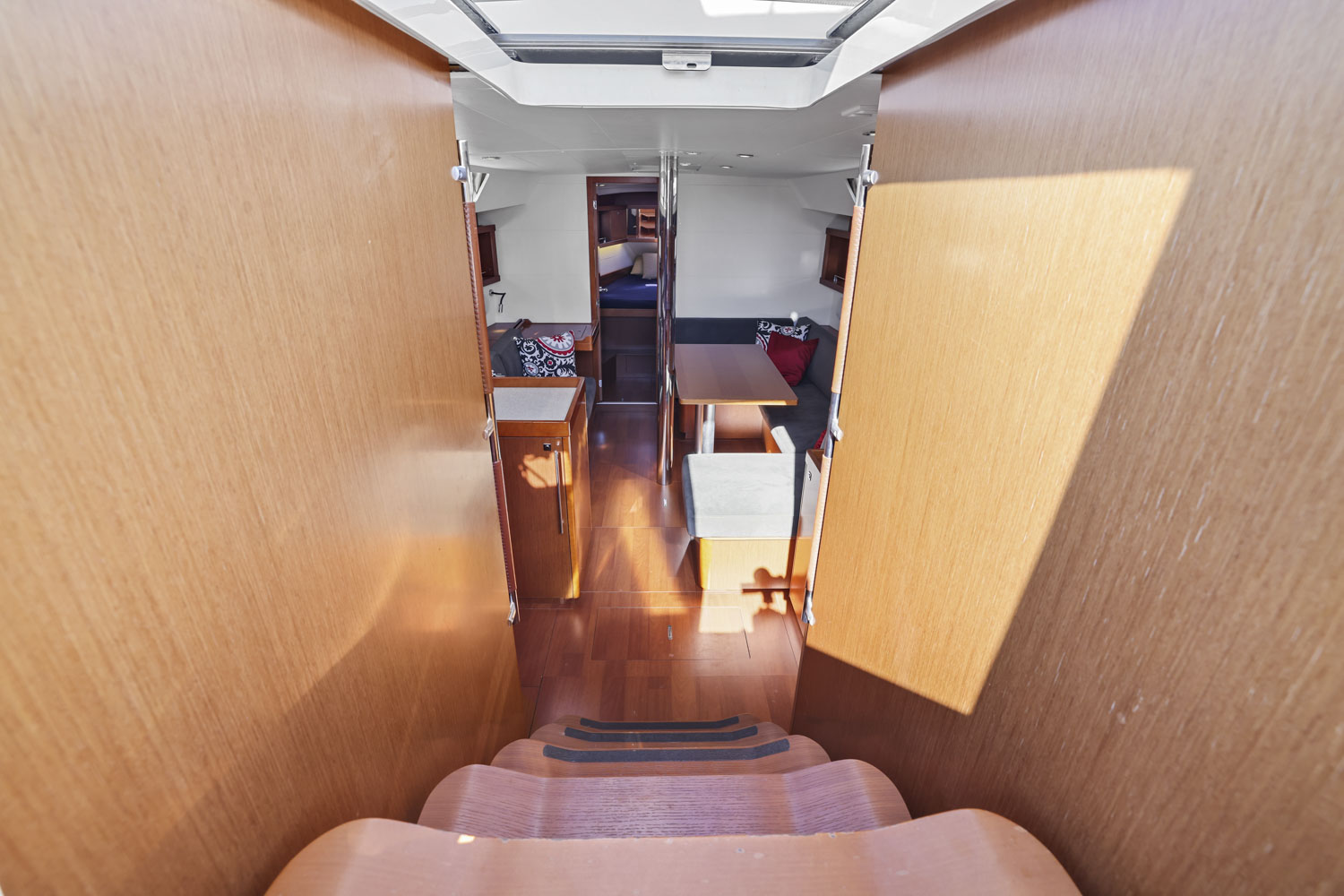 - Wooden salon companionway with molded wood suspended steps with non-slip surface