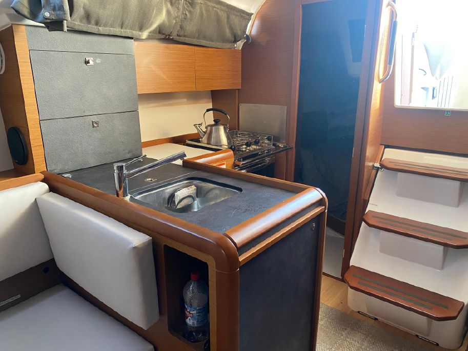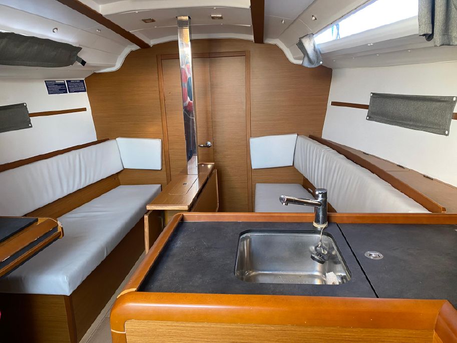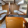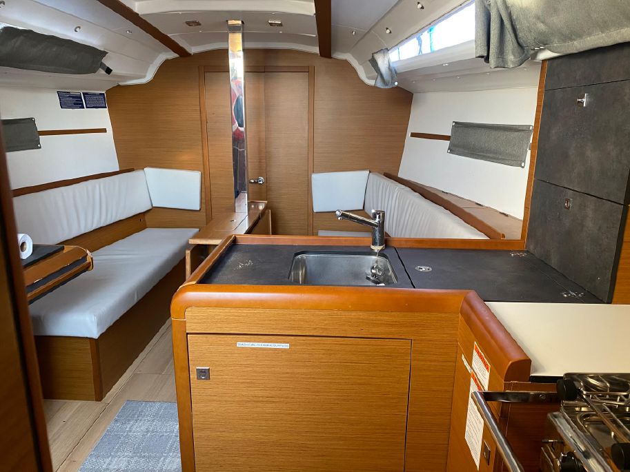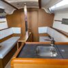 The hatch entrance is beautifully trimmed in teak with acrylic swing doors for the companionway. The 349 feels larger than its stated size down below. Long windows on each side allow plenty of light. The salon has two settees with a drop-leaf table that makes it easy for movement under way. The interior is a teak finish with dark grey countertops and a light grey wood plank cabin sole. Windows have matching window coverings. Headroom is 6 ft 3 in in salon/galley.