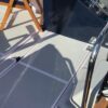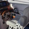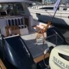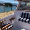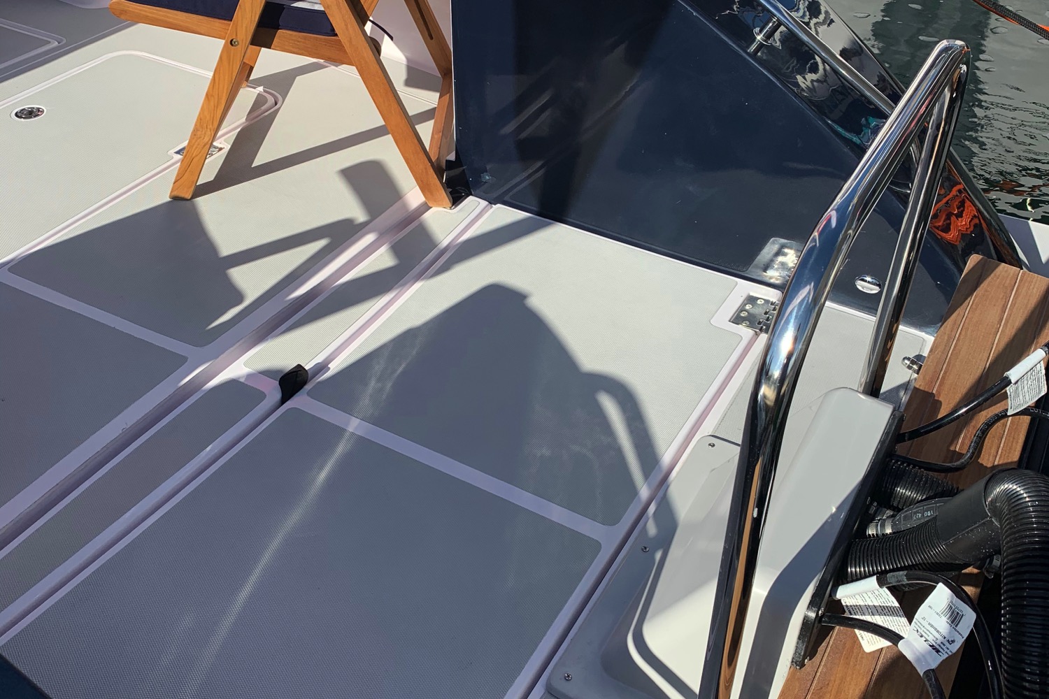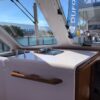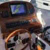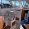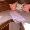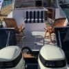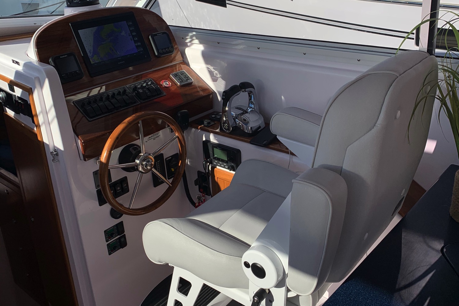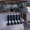The helm is to starboard and has all the latest electronics, including a 12″ Garmin chart plotter with radar, variable steering and a powerful bow thruster for ease of handling. The Suzuki outboards are quiet and smooth, electronically controlled for easy handling. There is an upgraded and comfortable Stidd helm set.