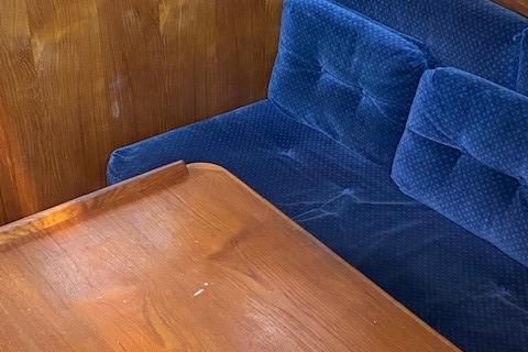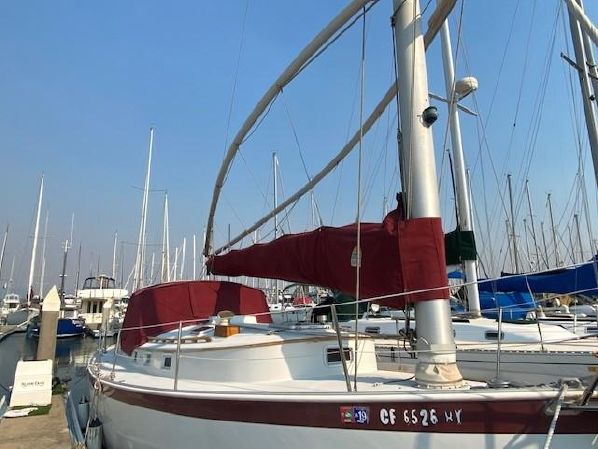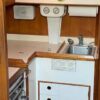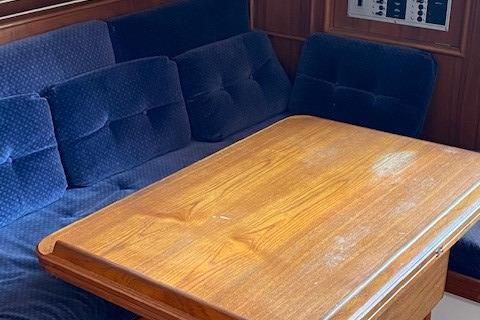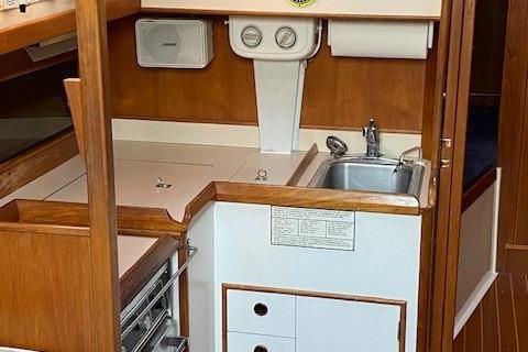Owners cabin is forward with double pullman berth to port and vanity to starboard. This forward cabin has lots of storage. The head is to starboard with seperate shower stall, head with holding tank and by-pass, sink with hot and cold pressure water and private access from main-saloon and also the forward cabin. The galley is to port forward of the main saloon. The main saloon has 2 full settees with convertable dinette.