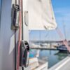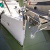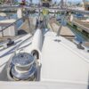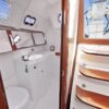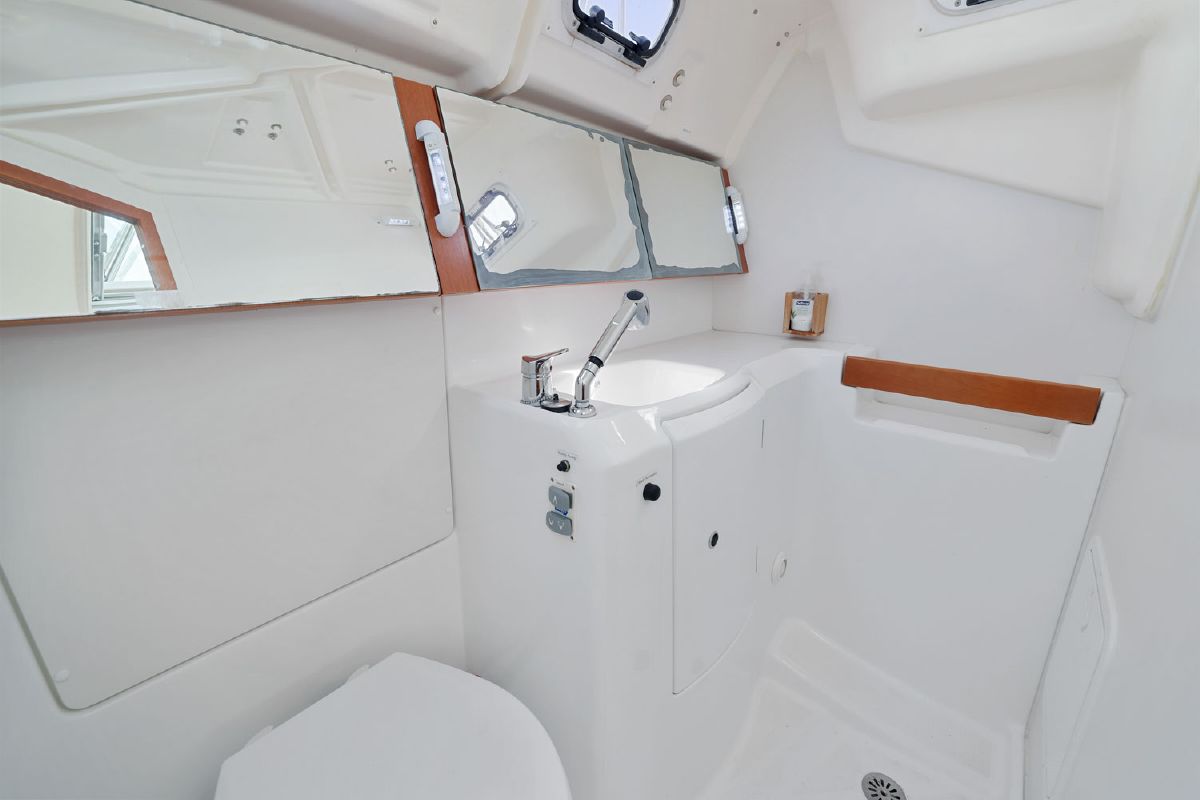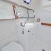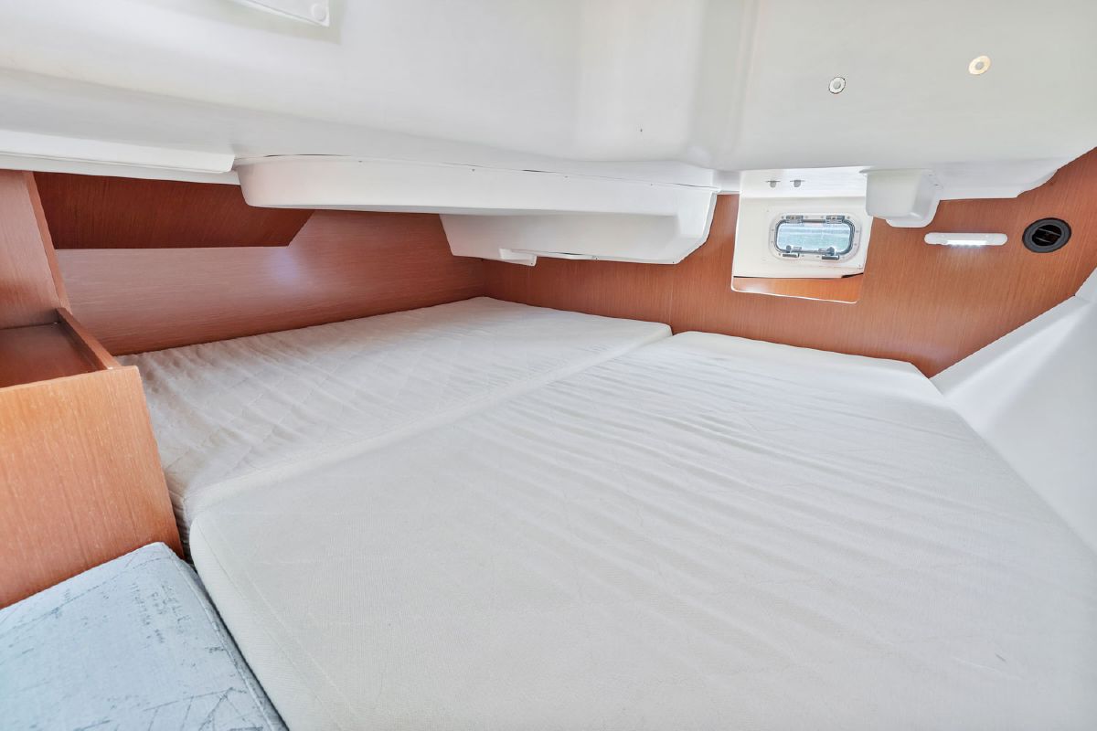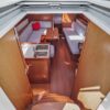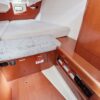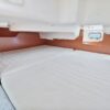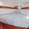 The two-cabin layout makes this boat ideal for two couples. The aft cabin bed uses king size sheets. There is a hanging locker and room to stand up to change clothes. The V-berth also has a hanging locker and room to stand up. Both cabins have solid doors for privacy.
