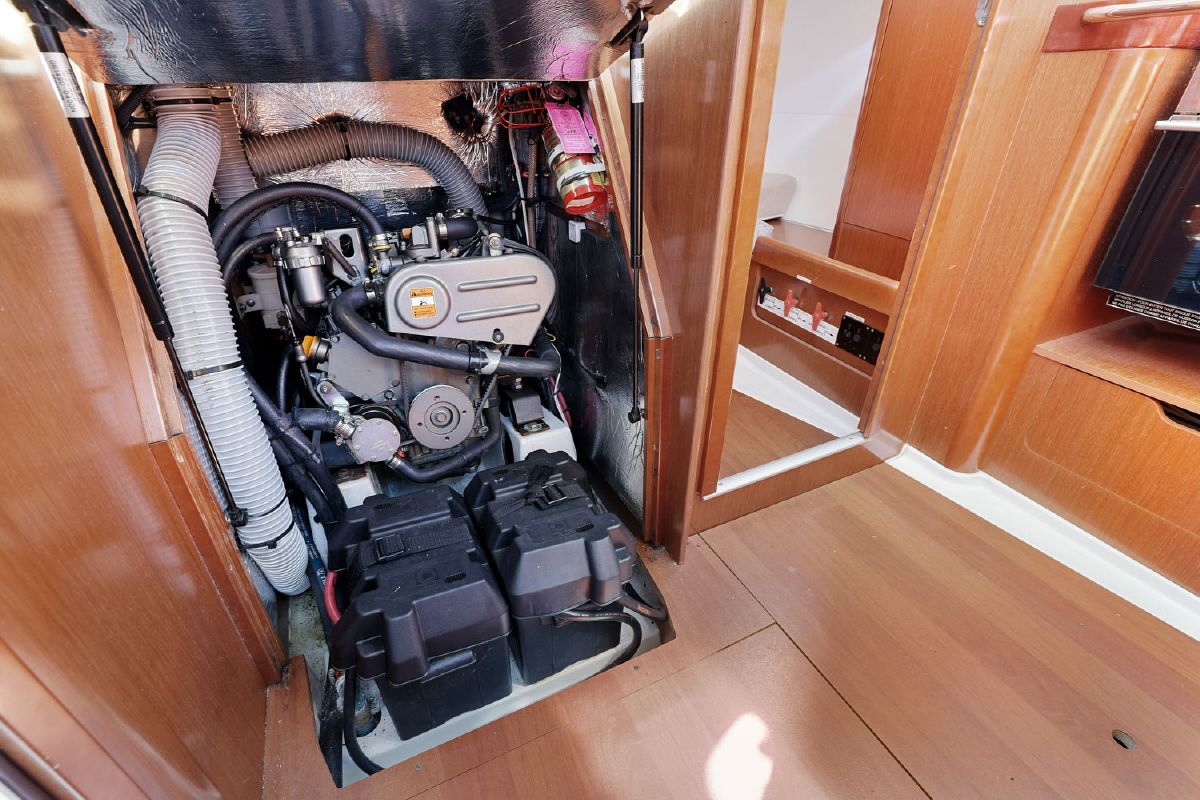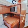 The interior finish is rich dark cherry wood with plank floor. The salon settees have been recovered with a custom nautical print. Interior height is 6ft 1in. The U-shaped dinette and starboard side settee offers comfortable seating for 8 and two additional berths if needed. The head is roomy with an electric head and space to shower.