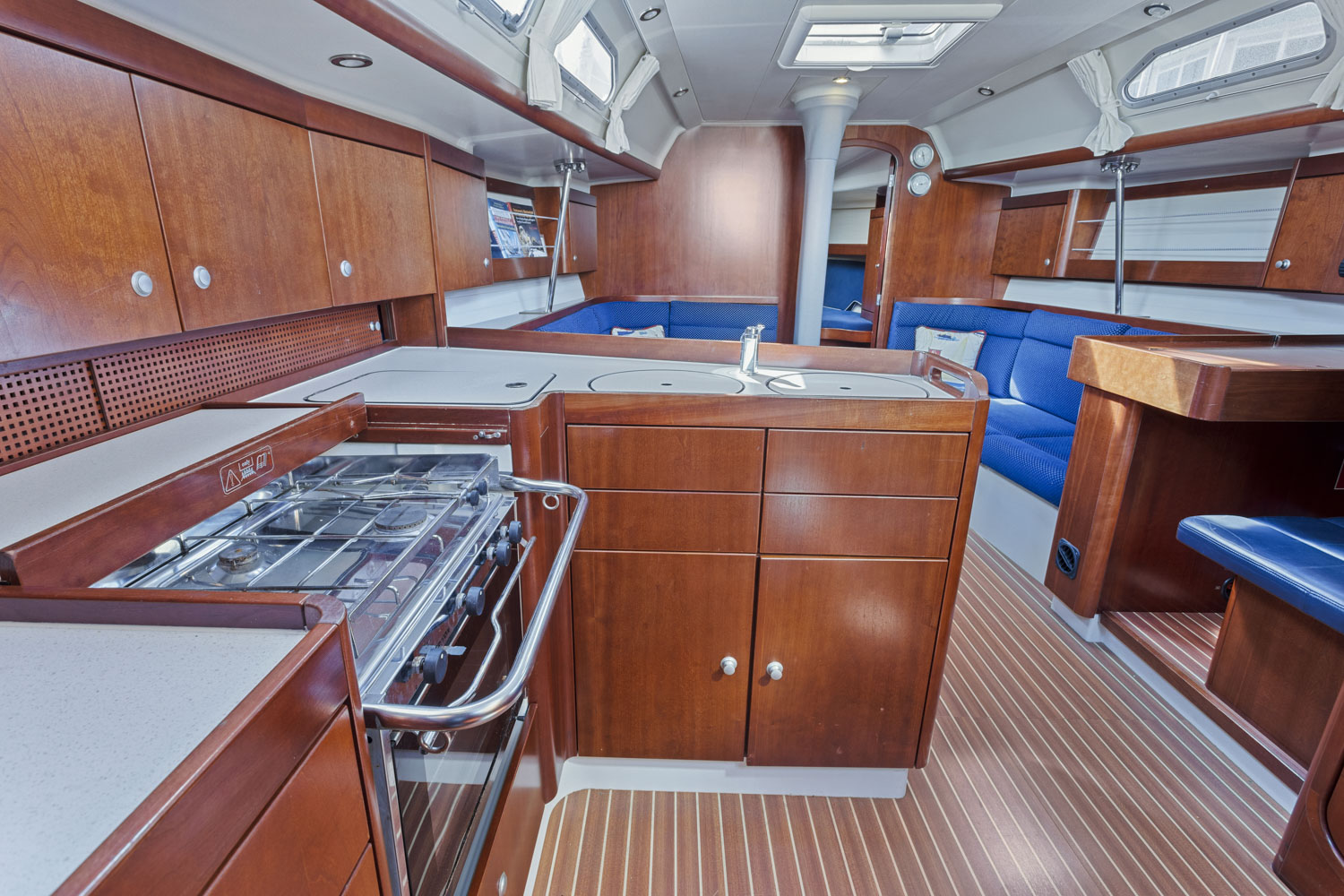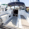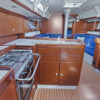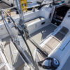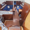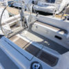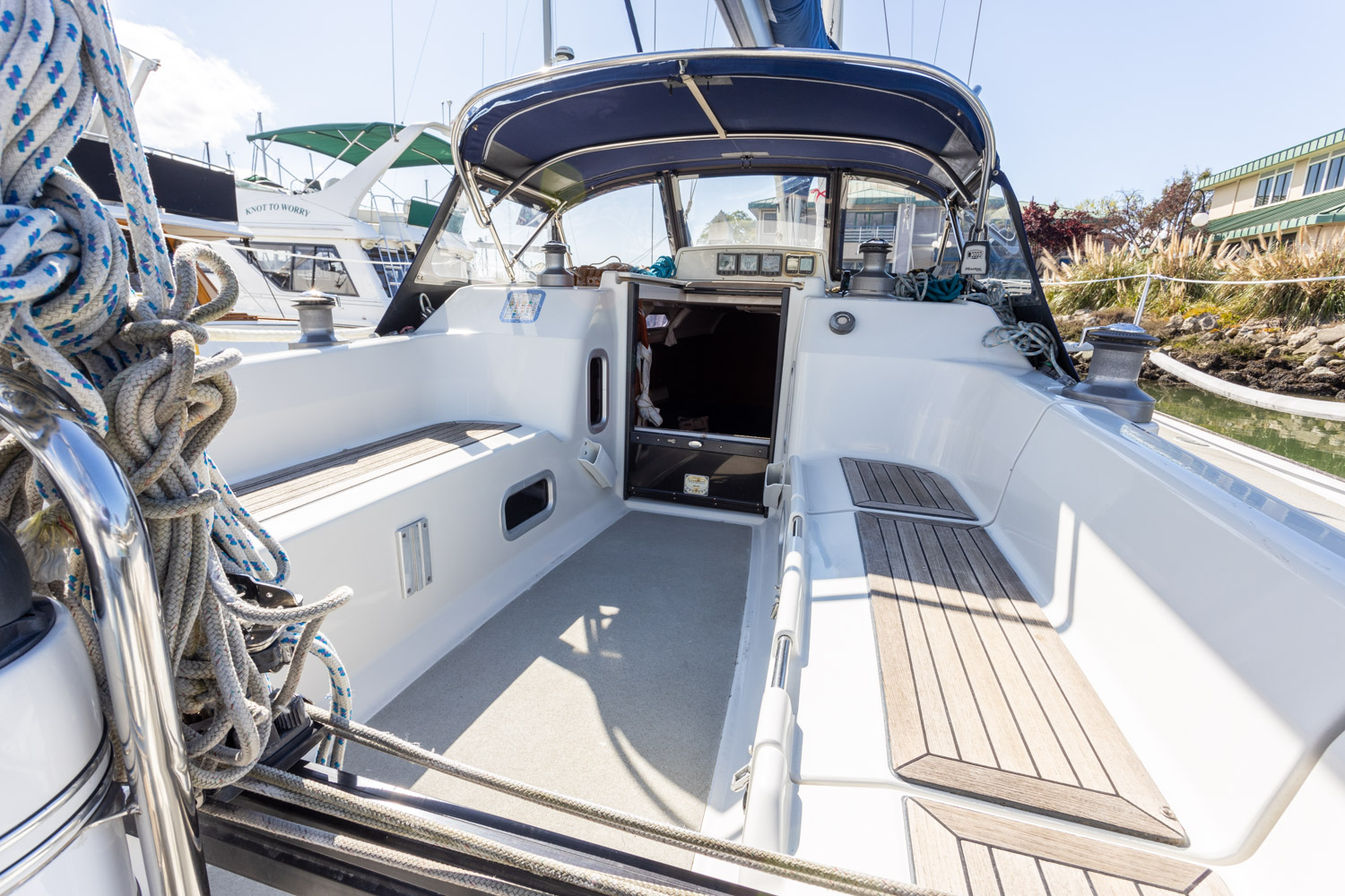 The cockpit sits 10 people, has gorgeous teak seats.  A removeable wooden table can be set up in the cockpit and stowed away while at sea. The traveler sits in front of the Lewmar Helm. There is storage underneath the seat in the cockpit on the starboard side and a propane locker on the port side
