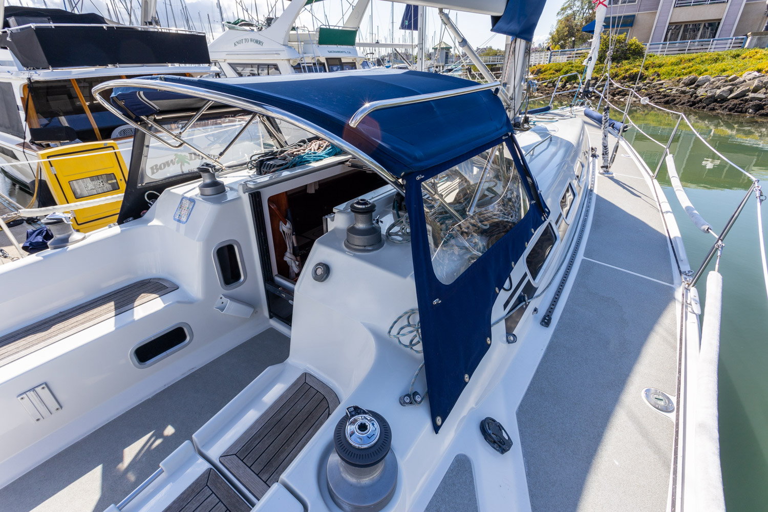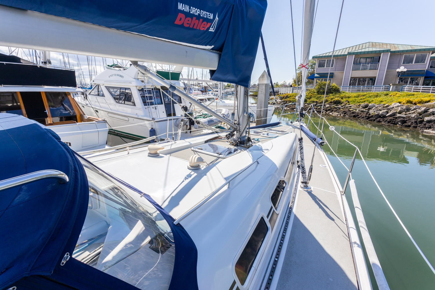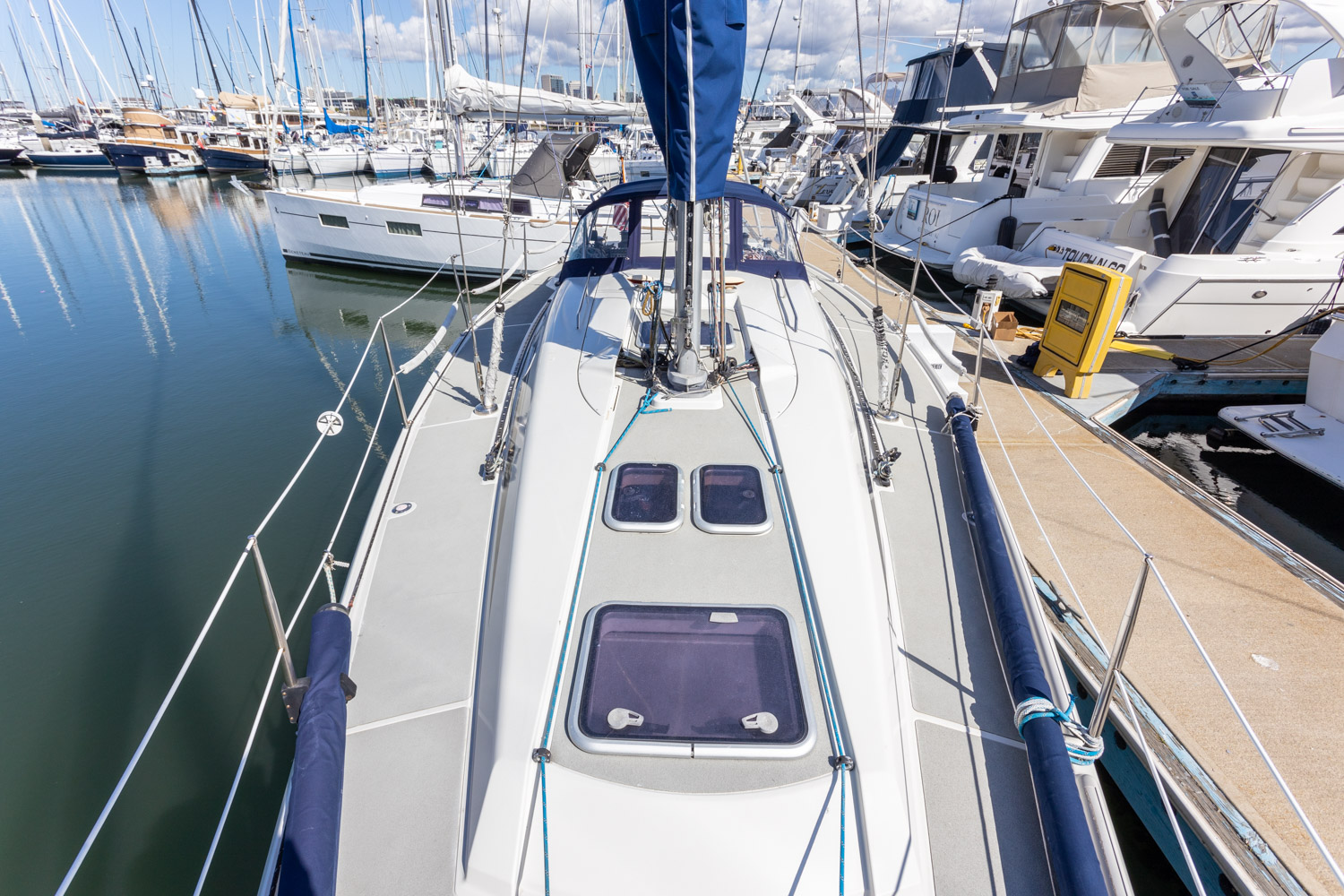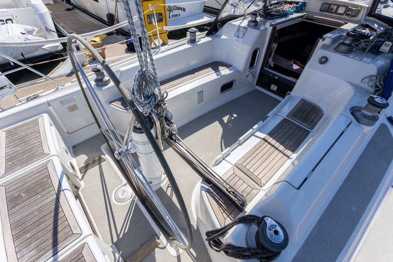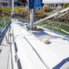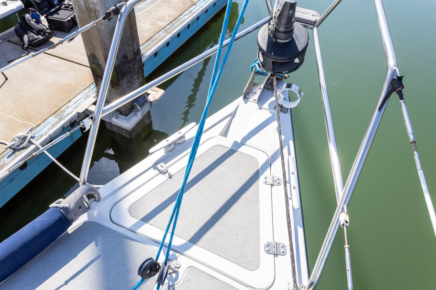 The deck is the long and sleek with non-skid.  A deep anchor locker at the bow.  There are two graphite spinnaker poles and the running rigging runs underneath the cabin top to the cockpit eliminating trip hazards or tangled lines.