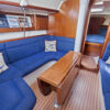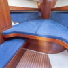 The main salon u-shaped settee with dining table on the port side and a long bench on the port side.  Underneath the u-shaped settee are three plastic water tanks. Underneath the bench on the starboard side is a stainless steel fuel tank.  starboard side.