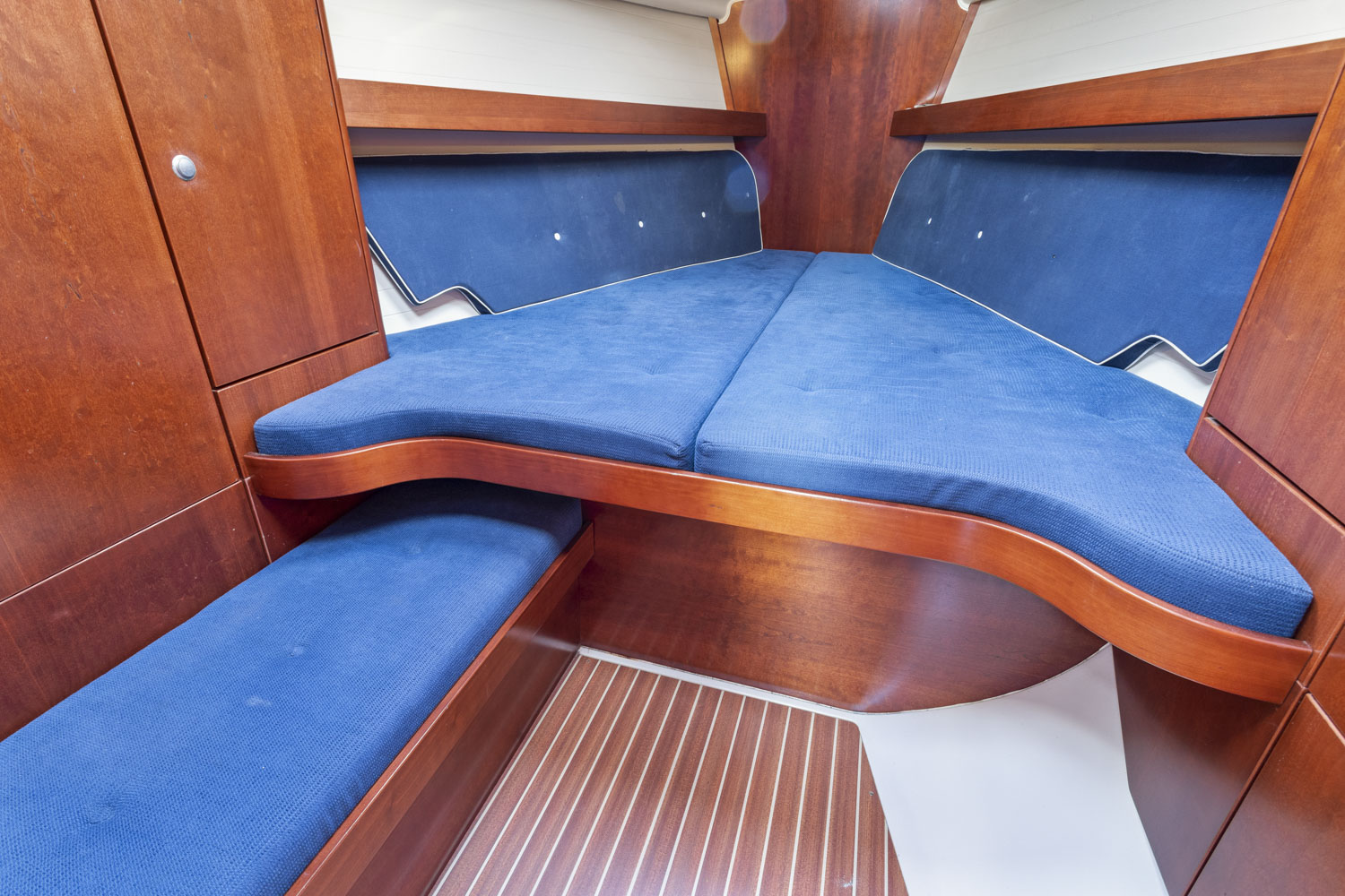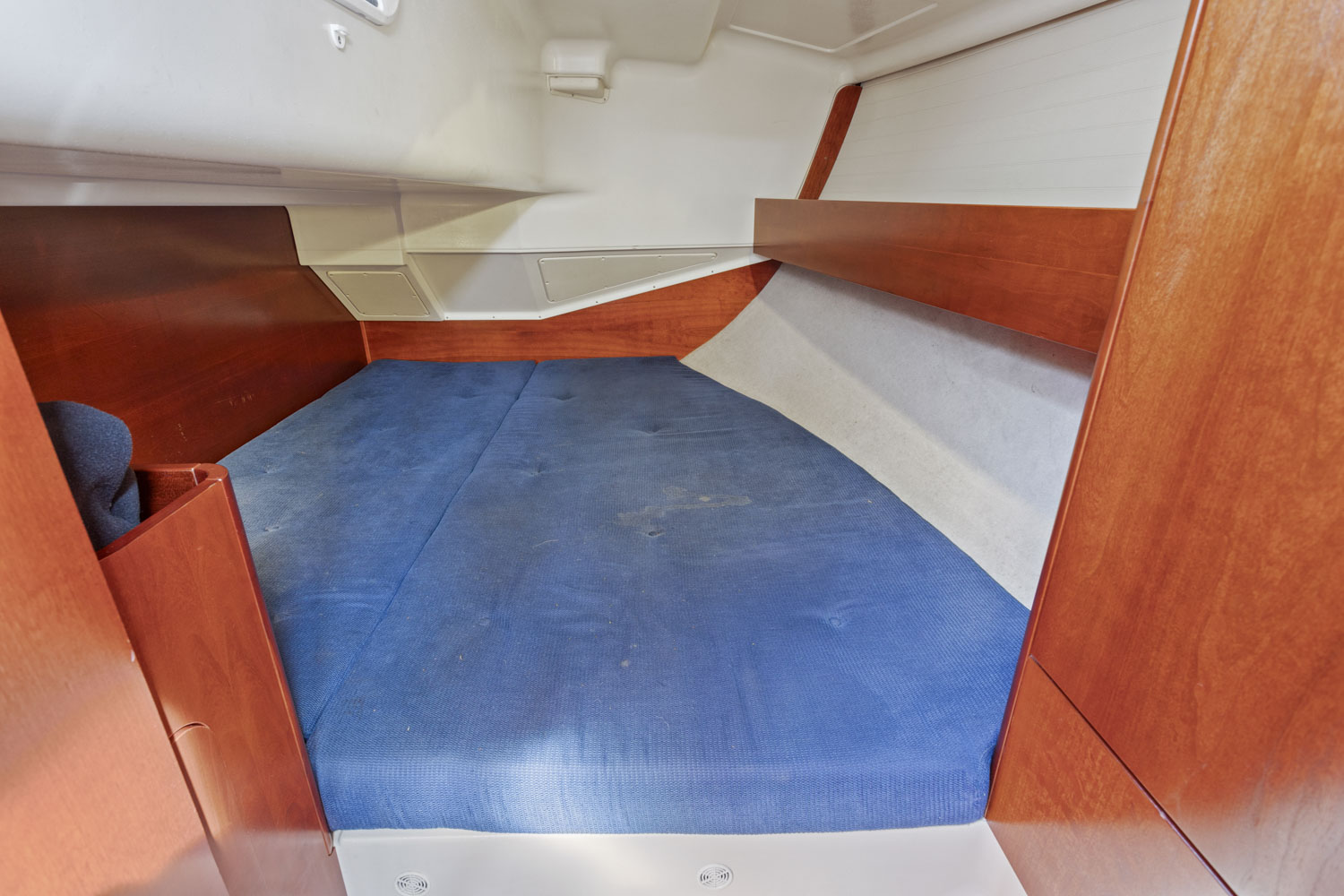 Double size matters in the v-berth with plenty of storage on the port and starboard sides of the v-berth. There is also shelving that runs along each side of the bed. There is also space for storage underneath the mattress pad.
