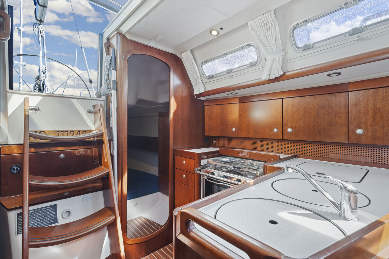 A galley equipped with a 3-burner propane Triton stove.  A top loading refrigerator / freezer and double stainless steel sink, that is round in shape.  There is ample storage cabinets and drawers within the galley.  On the port side is a a dedicated navigation station. Underneath the captains chair is storage for manuals, safety equipment.  To the left on the hull is the instrument panel, stereo and VHF.