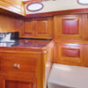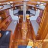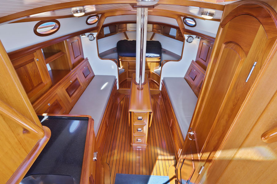 Entering the main cabin finds the galley immediately to port, the enclosed head to starboard, with port, and starboard settees flanking the solid teak fixed centerline drop leaf table. Further forward through the open bulkhead is a generous queen berth, with dual port, and starboard seating areas. The 6’4″ standing headroom, generous beam, and open bulkhead design allow for an interior that feels much larger than most 40 ft. yachts.