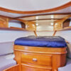 The air-conditioned interior of SCRAM is exquisitely fashioned in satin-varnished raised teak cabinetry with a satin finished white tongue, and groove overhead, accented by exposed teak ceiling beams. The elliptical cabin port lights are surrounded by solid teak finish trims and compliment the richness of the teak cabin sole, white satin finished open bulkhead with teak trim accents.